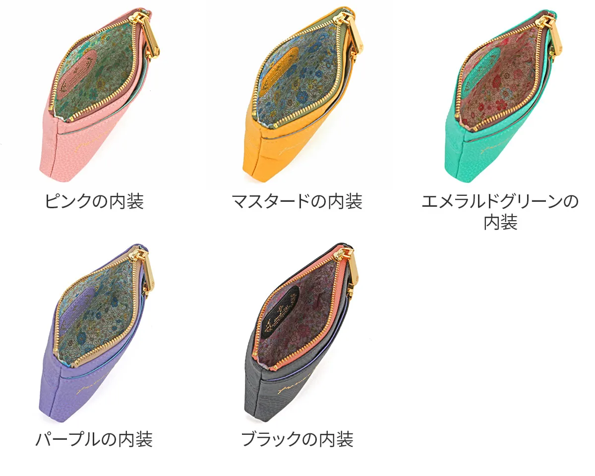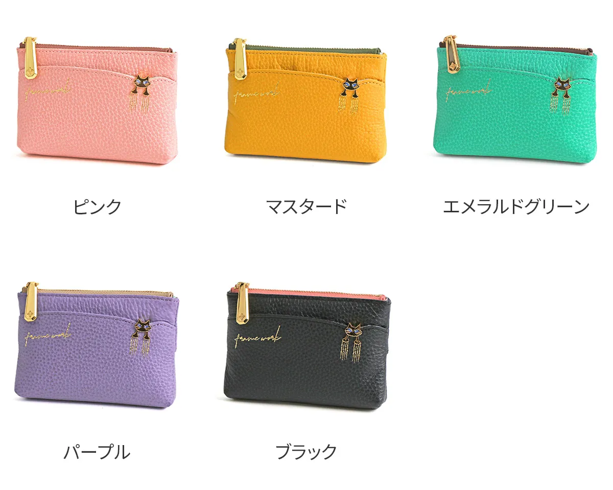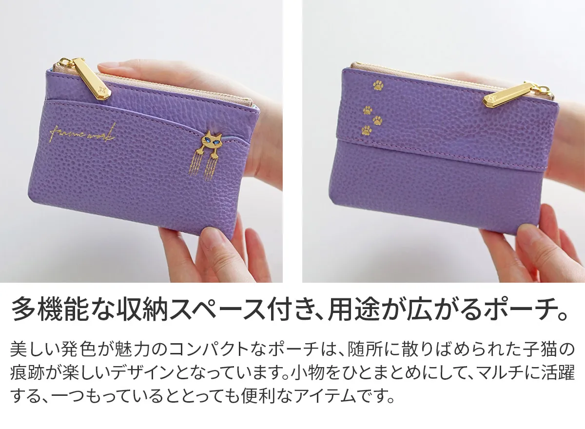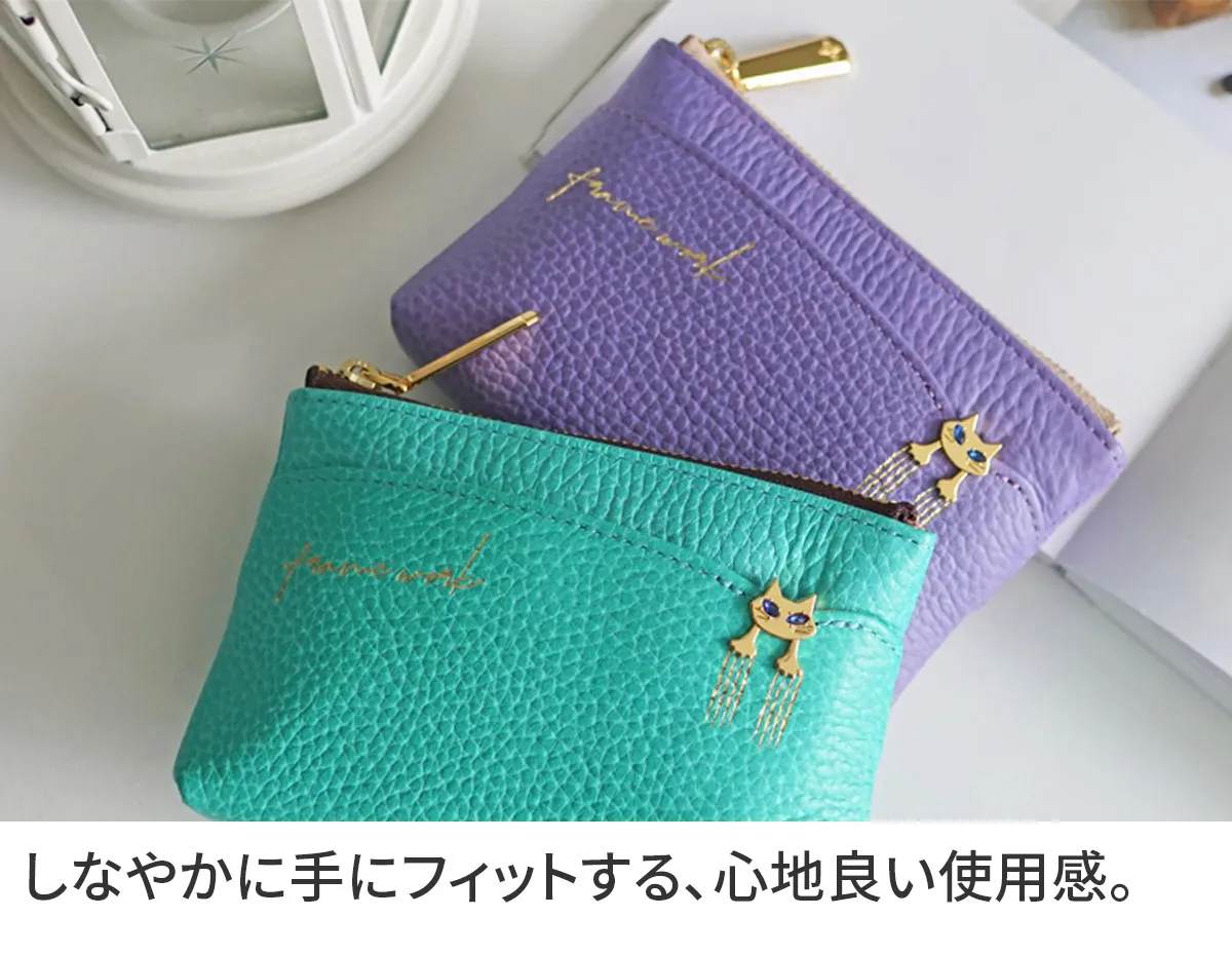 ブルーの目をしたいたずらっ子な子猫が愛らしいキトン(=子猫)シリーズ。 引っかき傷や足跡を表現した箔押しや内装の花柄生地など見つけると楽しいポイントが随所に散りばめられています。 オールレザーながらしなやかな触り心地で、使い始めから扱いやすいです。ファスナーを開けると愛らしい花柄が目に入り、気分があがるデザインに。小物入れの他、ポケットとティッシュケースが設けられた、実用性に優れた作りとなっています。