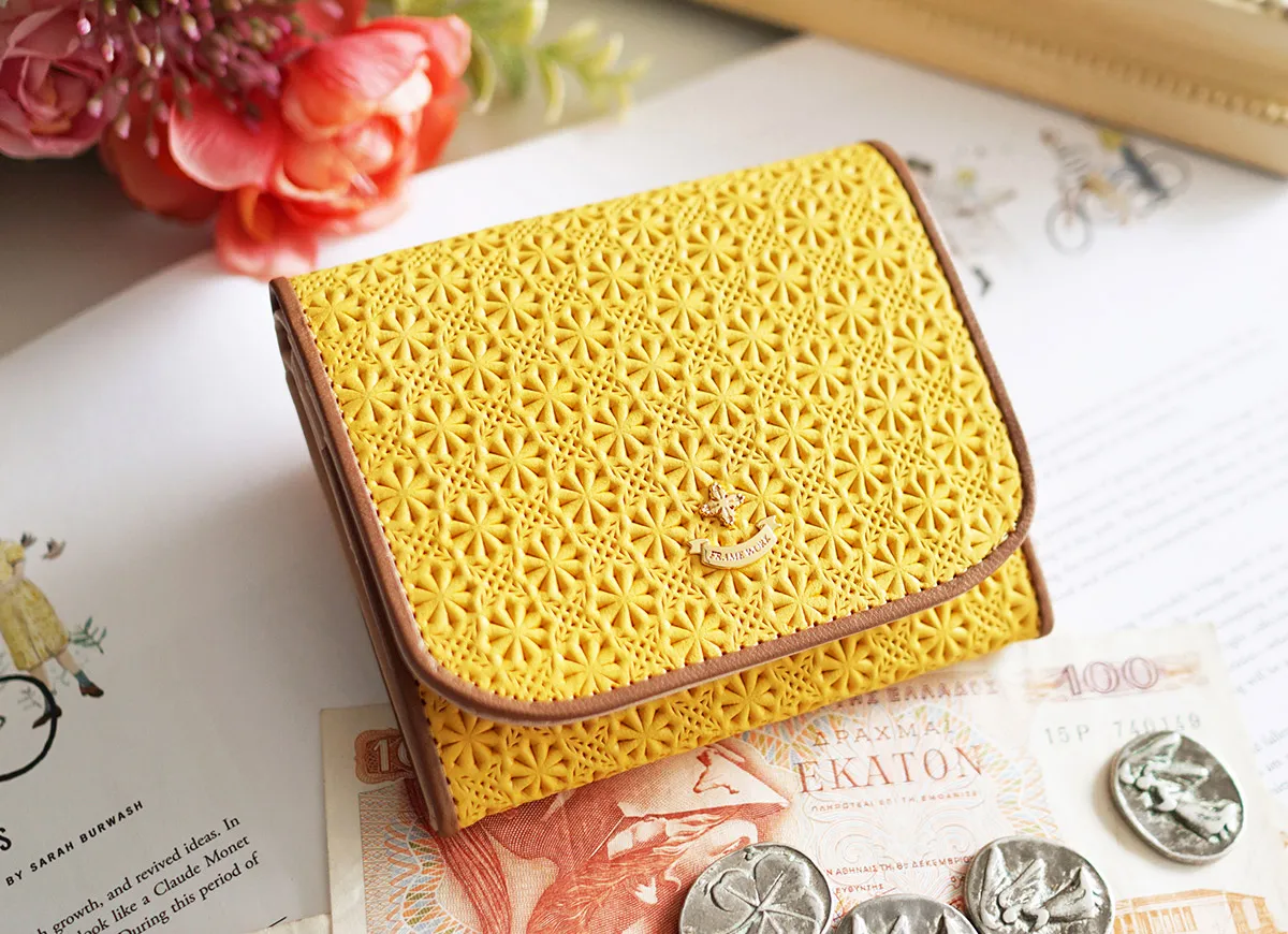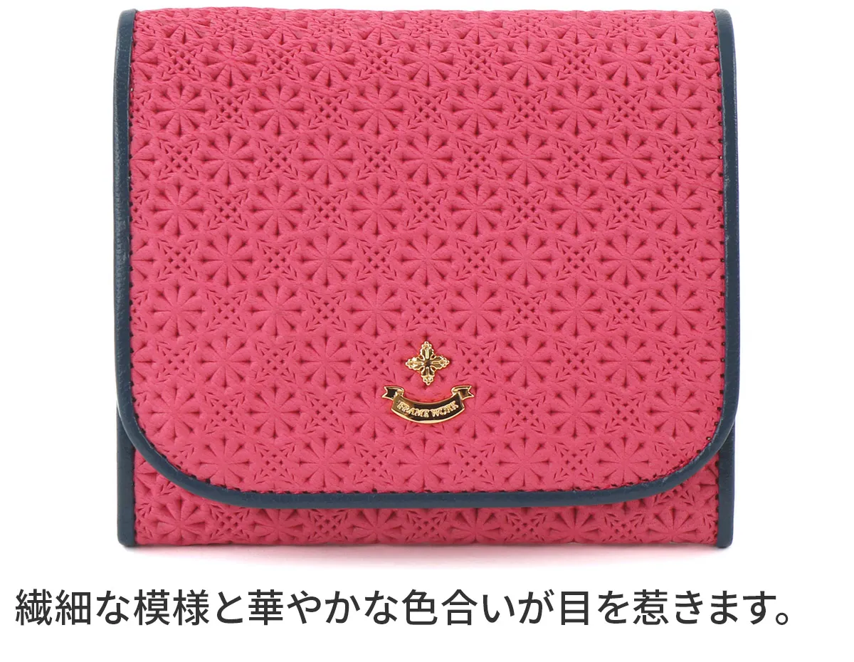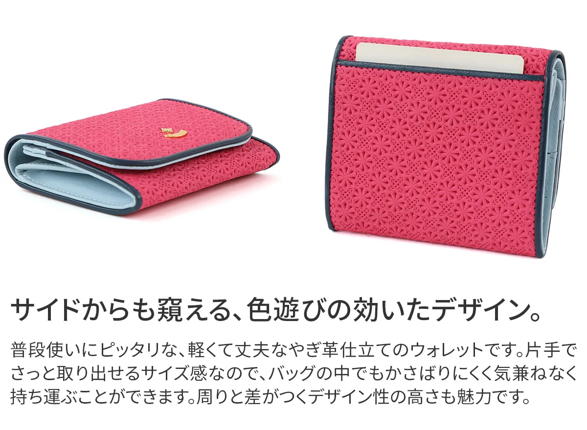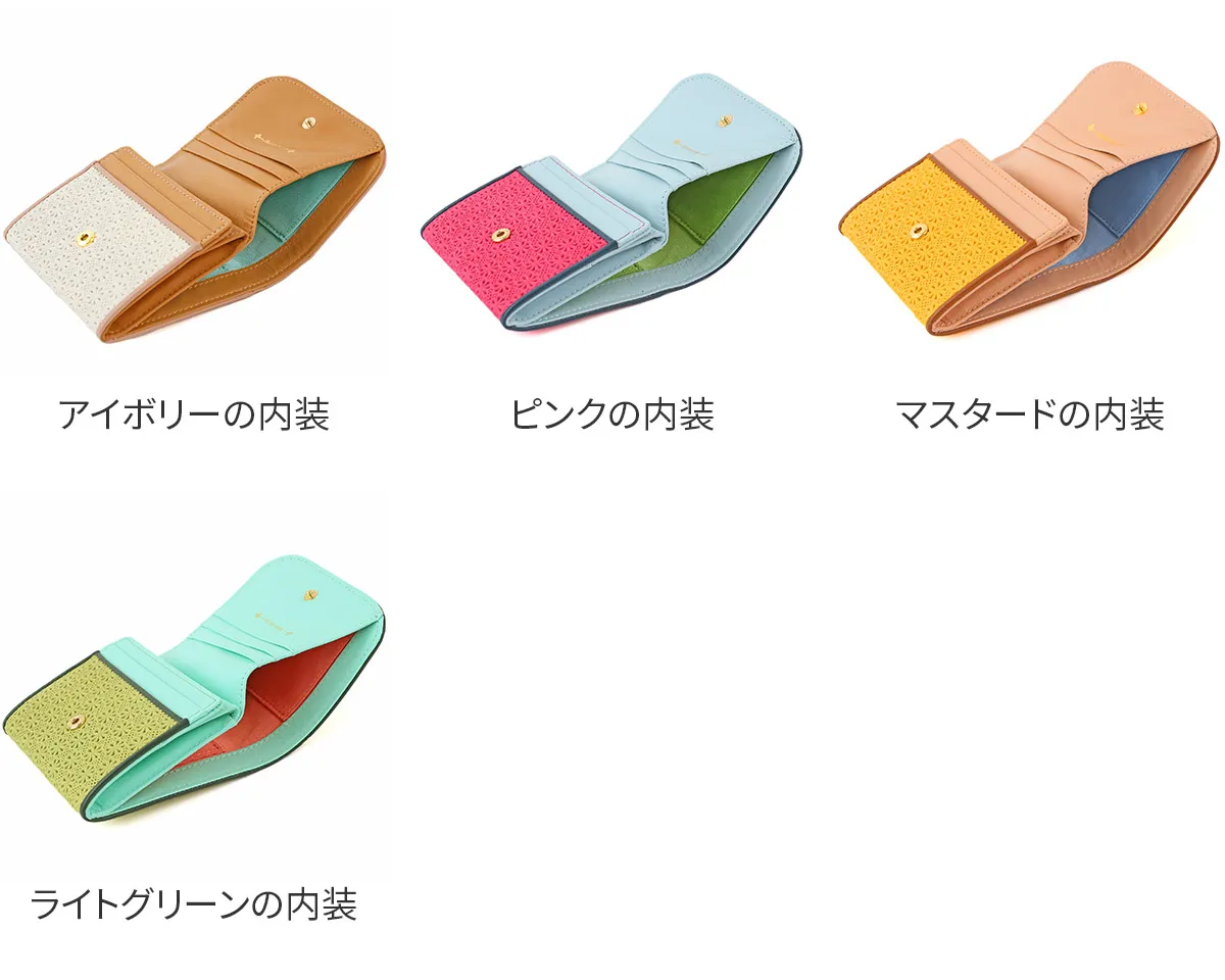 砂糖菓子のような可愛らしい小花柄をやぎ革に型押ししました。やぎ革の薄く軽い特徴を活かして軽量に仕立てられています。 軽量で耐久性の良いやぎ革で仕立てられた、日常使いに最適なアイテムです。触り心地を楽しめる質感の違うレザーを、外と内で使用しています。計8ヶ所のカードポケットと貨幣入れを備えており、丁度良いサイズ感と収納力です。鮮やかなカラー配色が手元を華やかに演出します。