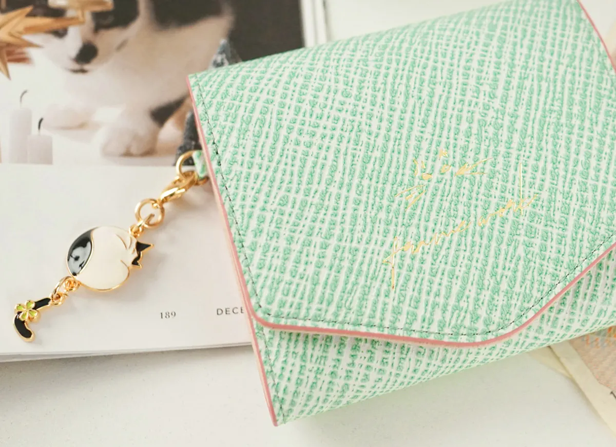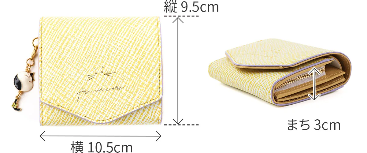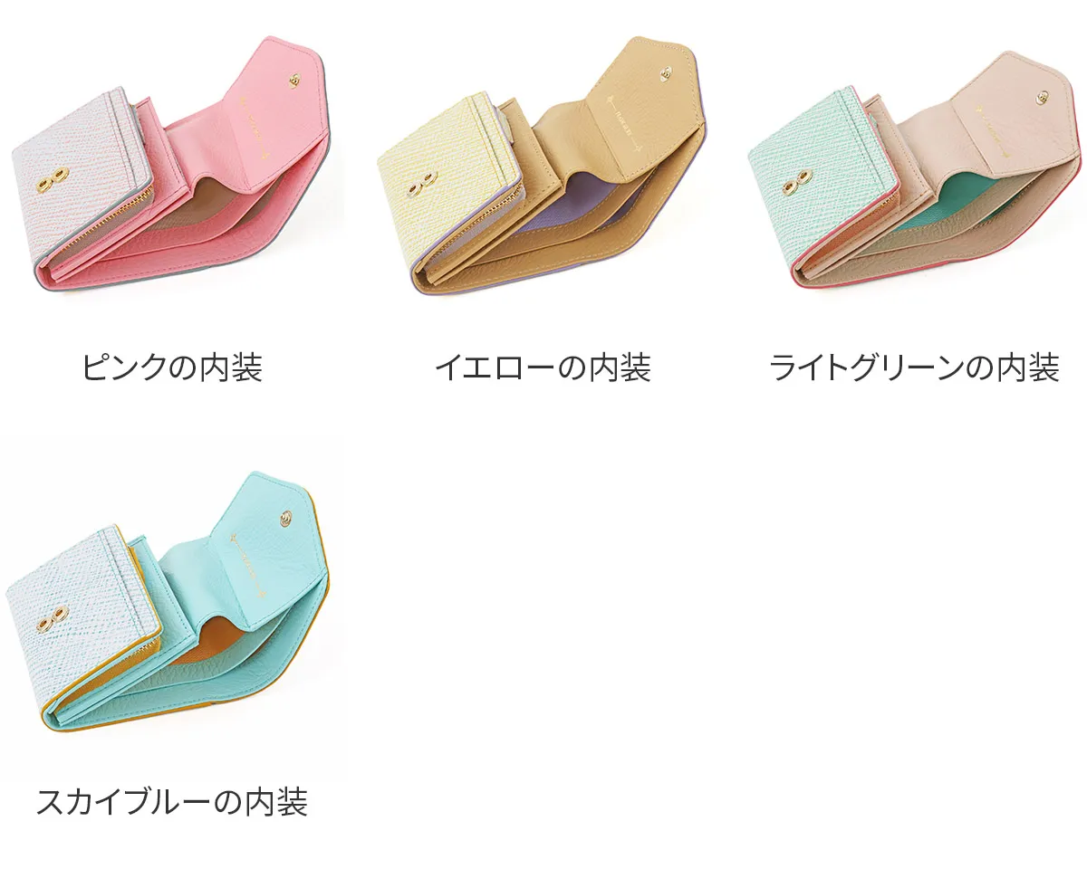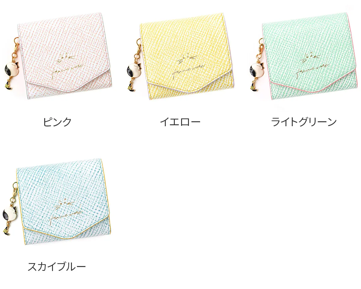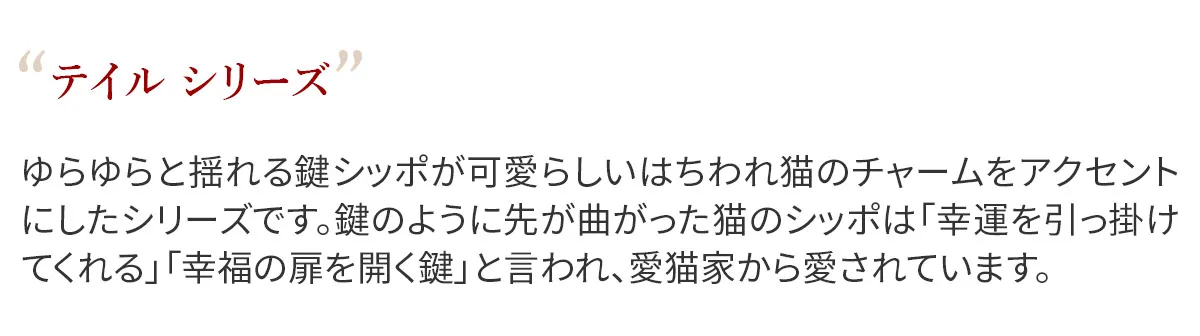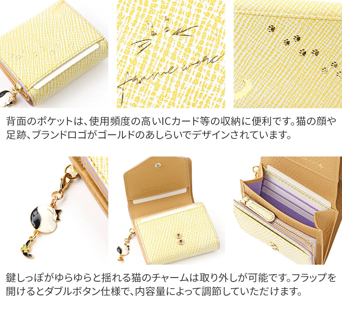 ゆらゆらと揺れる鍵シッポが可愛らしいはちわれ猫のチャームをアクセントにしたシリーズです。鍵のように先が曲がった猫のシッポは「幸運を引っ掛けてくれる」「幸福の扉を開く鍵」と言われ、愛猫家から愛されています。 はちわれ猫のチャームや足跡など細かな所にもデザインが施されており、見ていて楽しい気分にさせてくれます。ダブルファスナーのメイン開口部は容量に応じて調節ができるので、中身が増えても安心です。財布内部は中身が把握しやすいシンプルな仕様。カード入れと小銭、紙幣入れと分かれているので整理整頓して収納していただけます。