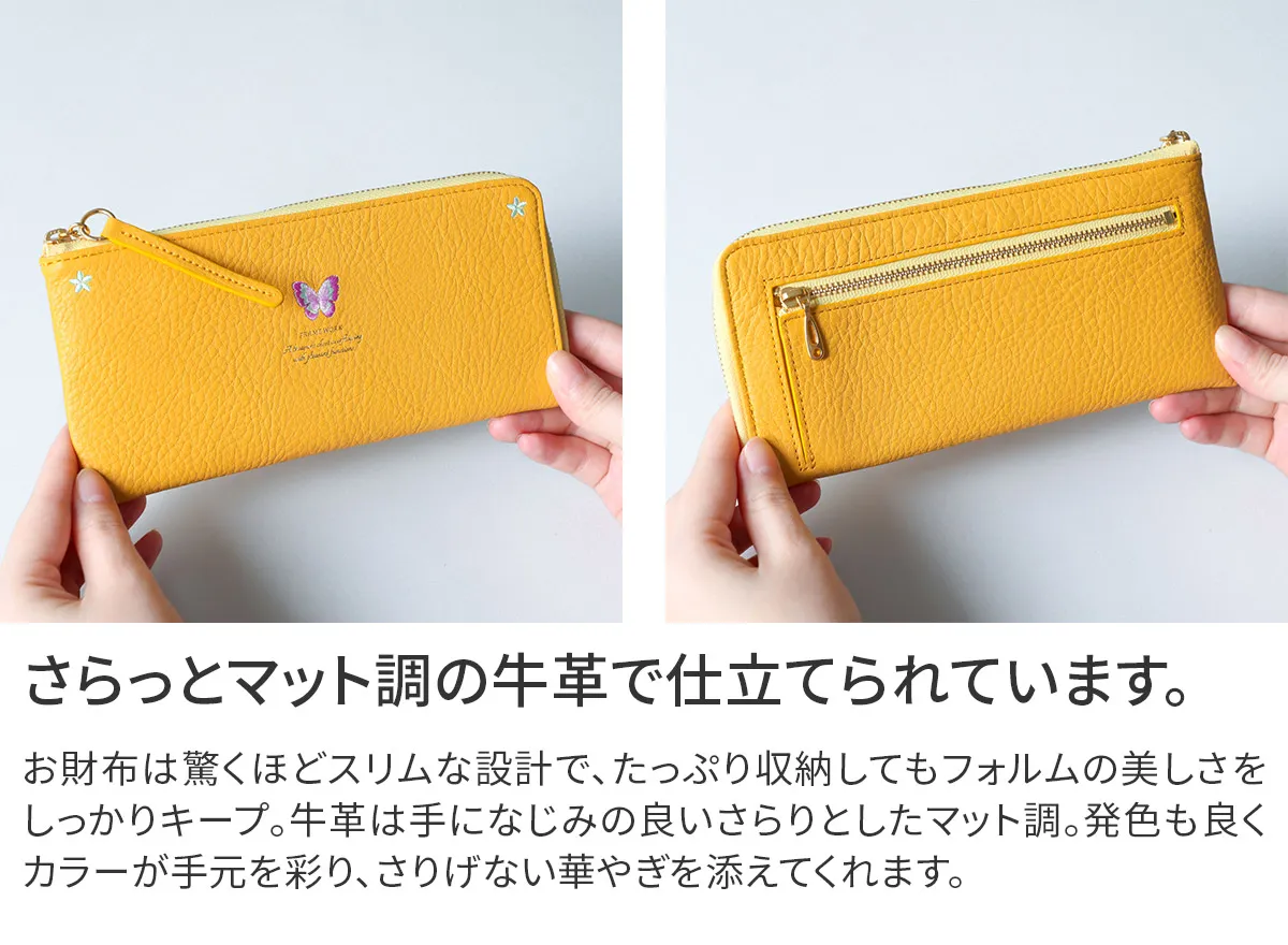 小さなワンポイントに、たくさんのときめきを。色んなモチーフを刺?であしらったカラフルなお財布シリーズ。今の自分にぴったりのお財布をチョイスすることができます。 柔らかくマットな質感のレザーで仕立てられた、豊富なカラー展開が魅力のシリーズです。前面には愛らしい刺繍がワンポイントでデザインされています。マチ幅は約1.5cmととてもスリムですが、手持ちのカードやお金、通帳まで収まる頼もしい収納力を備えた長財布です。