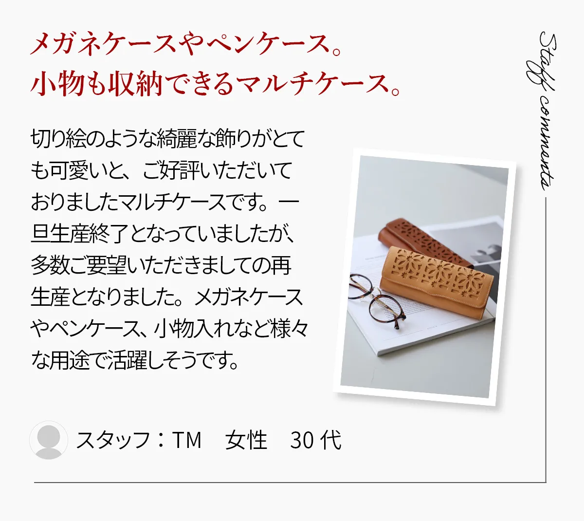 切り絵のような綺麗な飾りがとても可愛いと、ご好評いただいておりましたマルチケースです。一旦生産終了となっていましたが、多数ご要望いただきましての再生産となりました。メガネケースやペンケース、小物入れなど様々な用途で活躍しそうです。