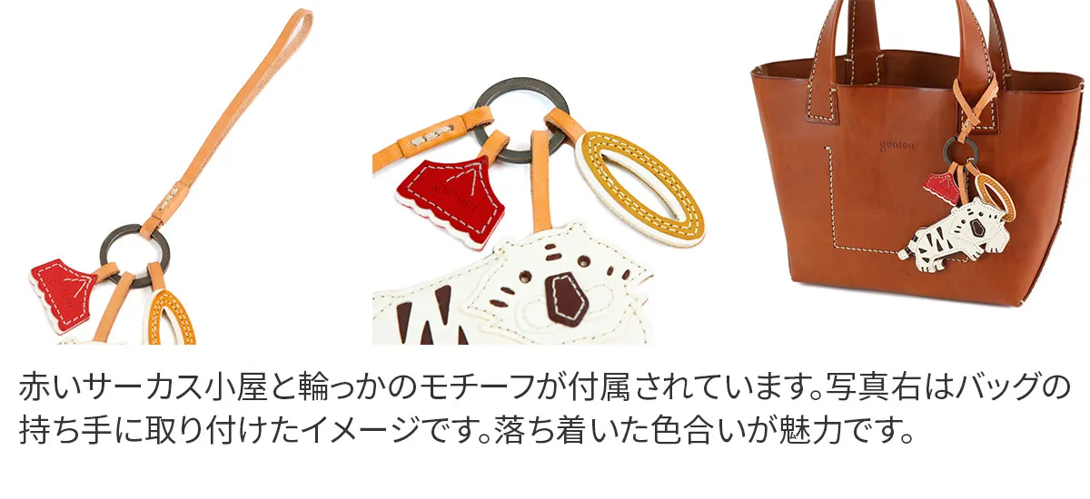 動物や食べ物をモチーフにしたレザーチャーム。 レザーの優しい風合いと綺麗な発色が楽しめます。 サーカス小屋で輪くぐりをする愛らしいホワイトタイガーがモチーフになったレザーチャームです。バッグに付けるだけでほっこり癒されるアクセントに。派手すぎない色合いなので、どんなバッグにも馴染むデザインになっています。一つ一つ丁寧に手作りされており、細やかなステッチワークも魅力のひとつです。大切な方への贈り物にも喜ばれるアイテムです。