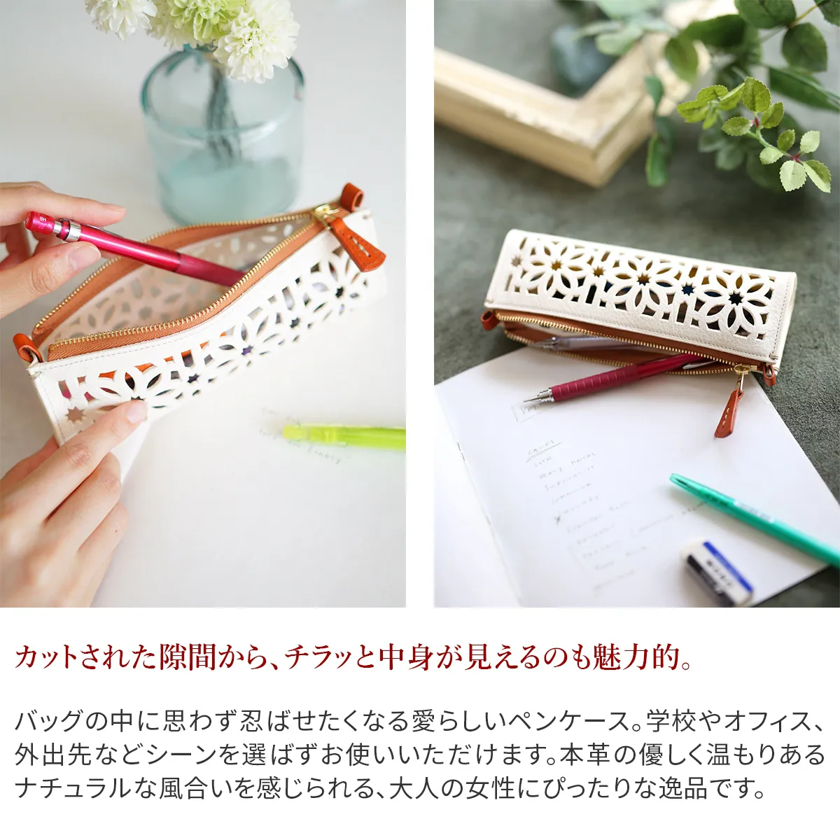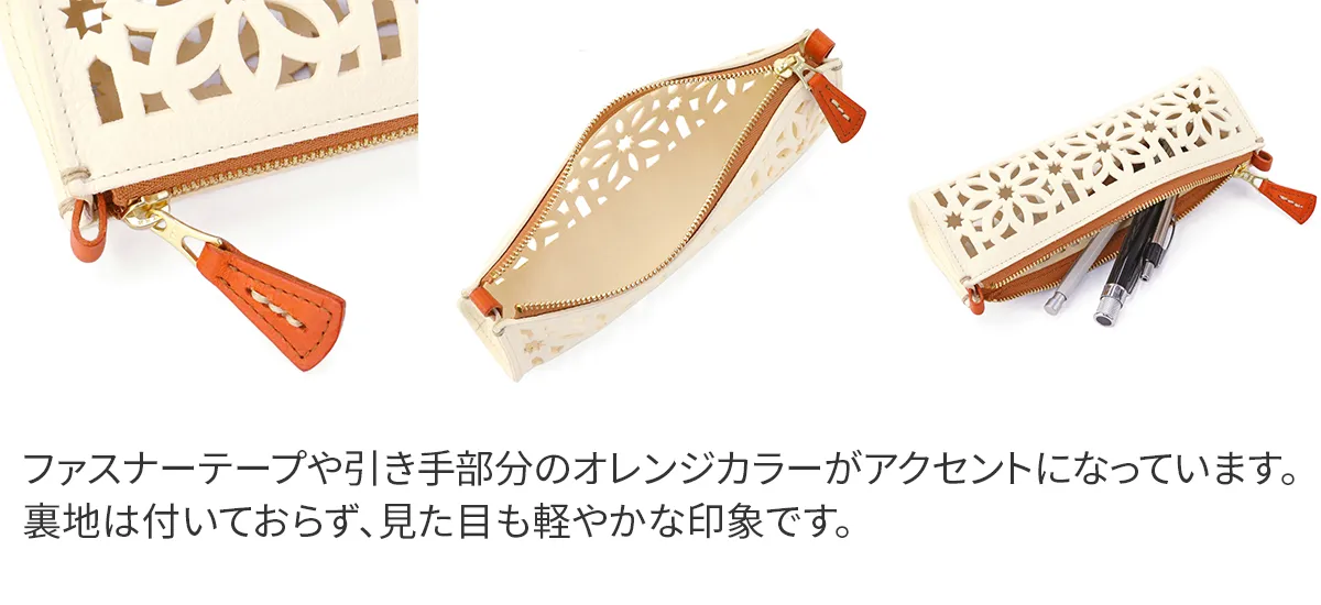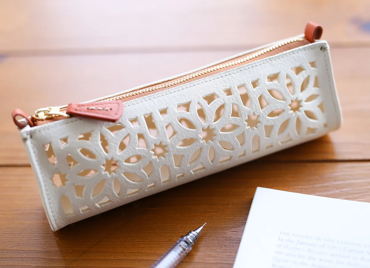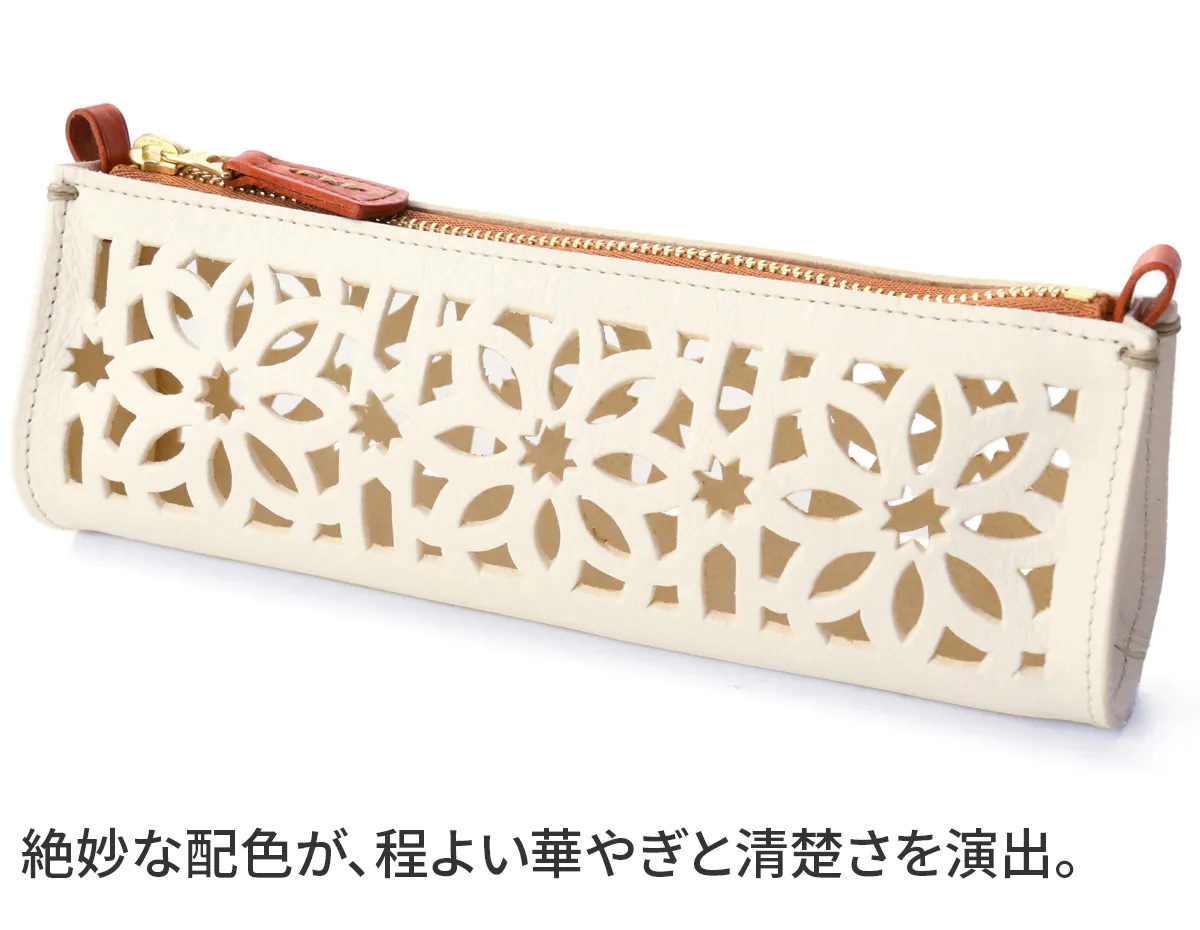 イタリア産のオイルを十分に含んだ牛革を使用したシリーズで、表面に大胆なカットワークがあしらわれています。カットワークのモチーフは、地中海地方沿岸に見られる伝統的な風窓からイメージされており、花と星を表しています。 ホワイト×オレンジの温もりある配色、愛らしくも上品なカットワークデザインが魅力を放つペンケース。開口部のファスナーも大きくスムーズに開くので、ペンも取り出しやすく、また、軽量なのも嬉しいポイントです。