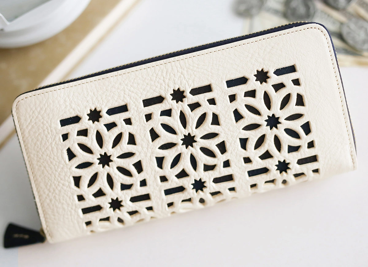 イタリア産のオイルを十分に含んだ牛革を使用したシリーズで、表面に大胆なカットワークがあしらわれています。カットワークのモチーフは、地中海地方沿岸に見られる伝統的な風窓からイメージされており、花と星を表しています。 ワンタッチで開閉でき、カードや紙幣、硬貨も一目で確認できます。普段使いのお財布としてはもちろん、スマートフォンや鍵、口紅なども収納できるので、パーティーシーンでクラッチバッグとしてもお使いいただけます。