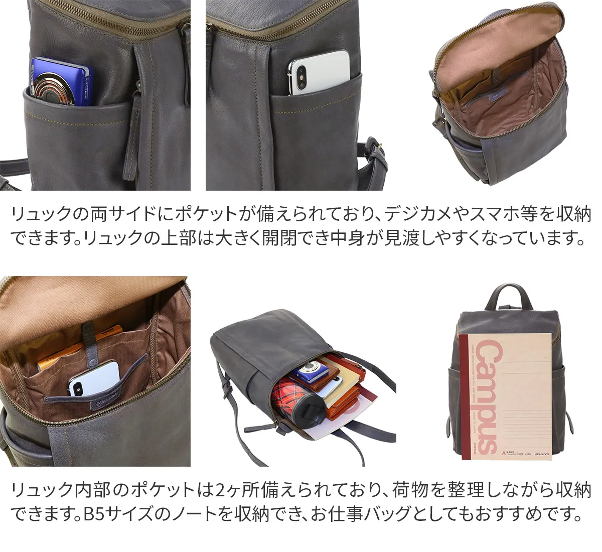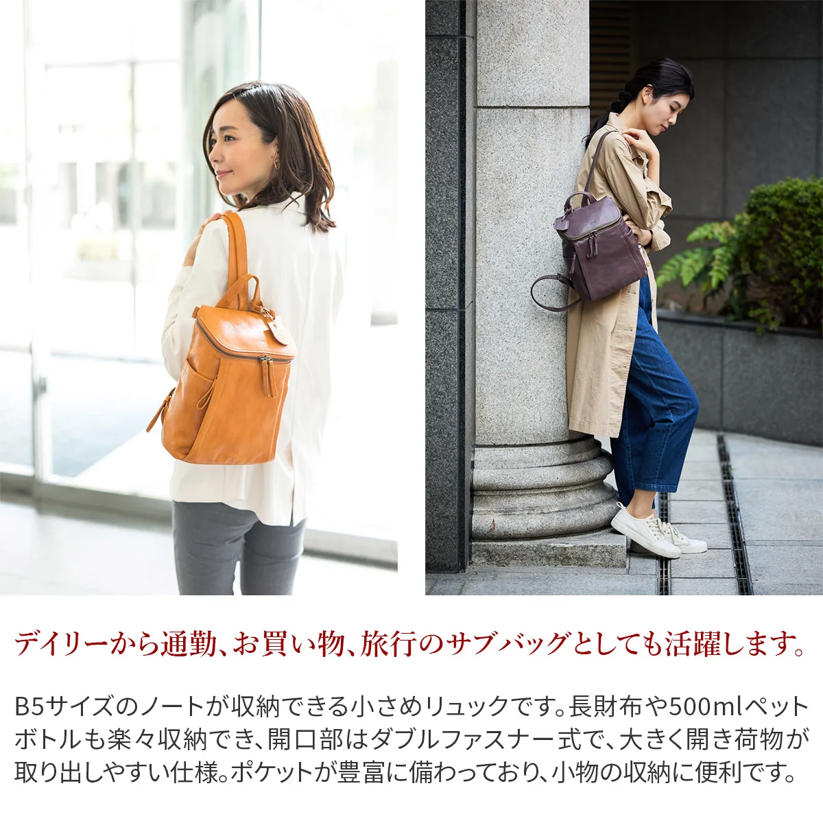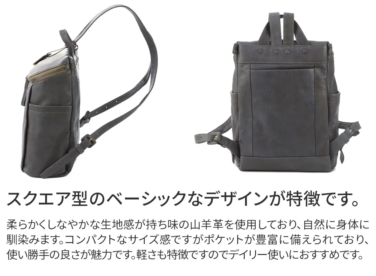 好評をいただいているゴートヌメをよりナチュラルな表情に仕上げた「ゴートベーシック」が登場です。 ゴートヌメは仕上げにウォッシュ加工をかけ、表面にバフ加工(焦がし)を入れることでヴィンテージ感を演出しておりましたが、 ゴートベーシックでは、製品後のバフ加工ではなく、革の段階でグレージングという仕上げ加工を加えています。 素上げの山羊革にグレージング加工を施す事で素材のそのものの持つ表情をより際立たせ、奥行き感のある仕上がりにしています。 B5サイズのノートが収納できる小さめリュックです。長財布や500mlペットボトルも楽々収納でき、開口部はダブルファスナー式で、大きく開き荷物が取り出しやすい仕様。ポケットが豊富に備わっており、小物の収納に便利です。