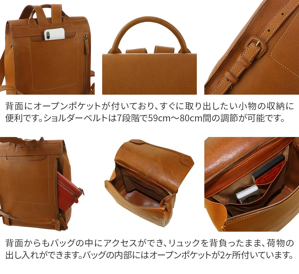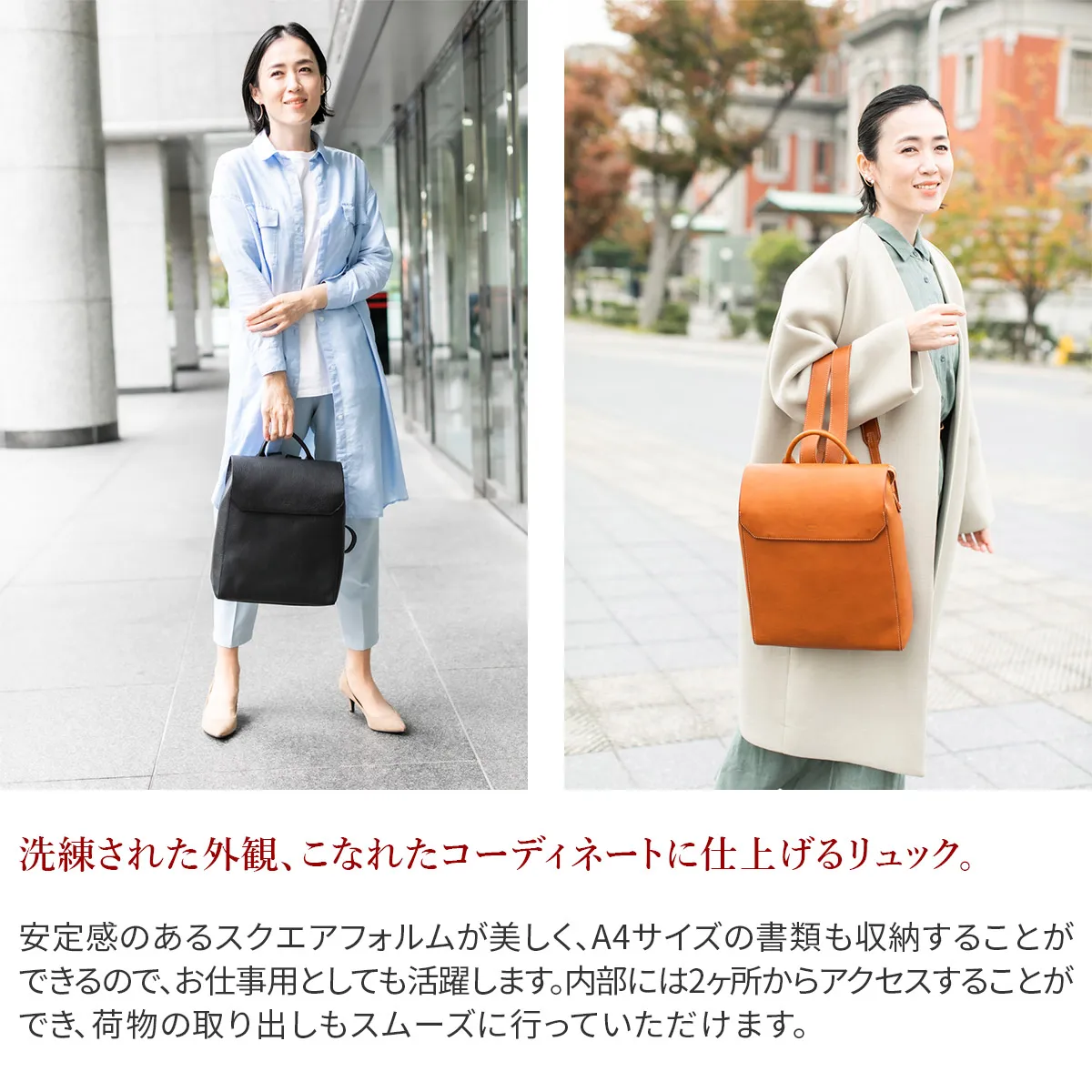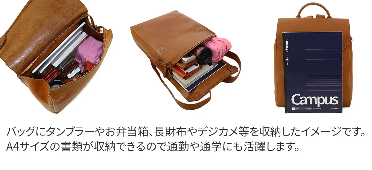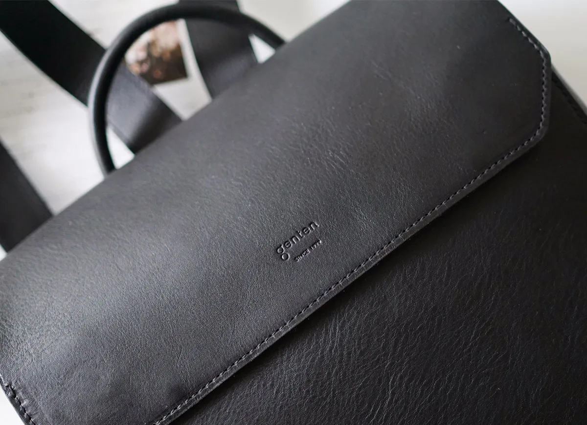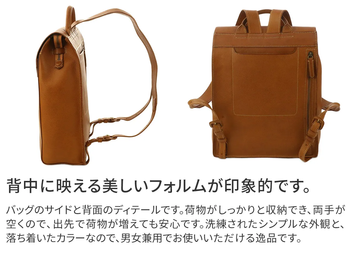 知恵や工芸などを司る、古代ローマの美神"ミネルヴァ MINERVA"ミニマムな中に漂う知的な佇まいと、数々の手仕事に裏打ちされた確かな品格。 その存在感に穏やかさと豊かさを際立たせてくれる、優良質なヴァケッタ革の魅力。何かを足すのではなく、何も引くこともない、エターナルな思いを込めて造られたアイテムの数々は、 手に取るたびに至高の風格を垣間見せてくれます。貴方の傍らで、ともに静かに響きあえる・・・そんな関係を築けるバッグです。 <素材の特性・メリット> gentenお馴染みのヴァケッタ革、ミネルバボックス(minerva box)をふんだんに使用しました。 バッグ本体やポケットの仕様部分に、革一枚仕立ての構造を多くあしらい、切り目や革裏を、職人が一枚一枚丁寧に腑糊で磨きをかけました。 時間をかけて鞣されたタンニン革だからこそ楽しめる一枚革の魅力とエイジングの極みを存分にお楽しみください。 男女問わずお使いいただけるシンプルなデザインの縦長のリュックは、カジュアルスタイルはもちろん、スーツスタイルまで難なく馴染む品格を携えています。 背面にはメインコンパートメントにダイレクトにアクセスできるファスナーを備えているので、リュックを背負ったまま荷物を取り出すことができます。