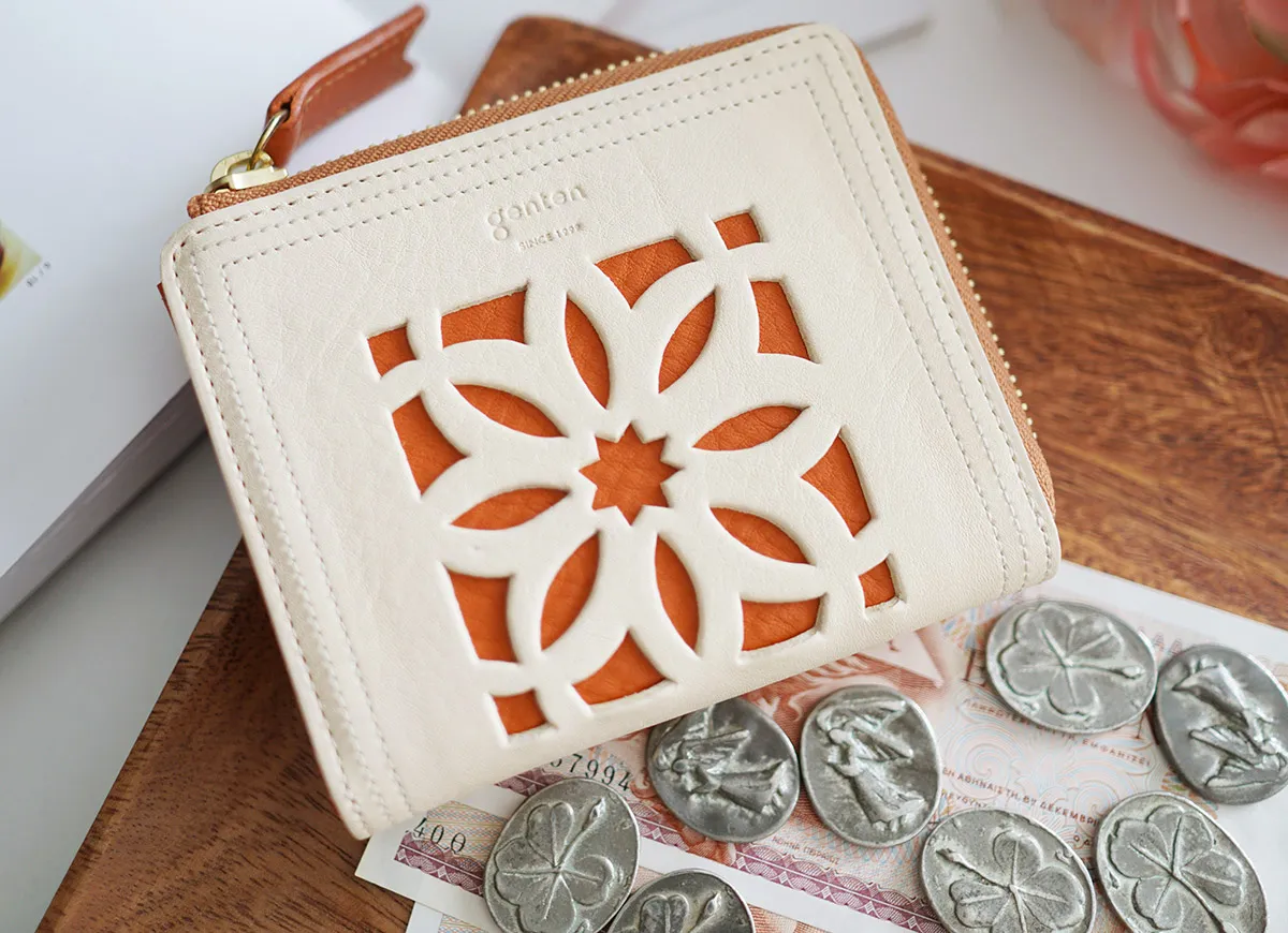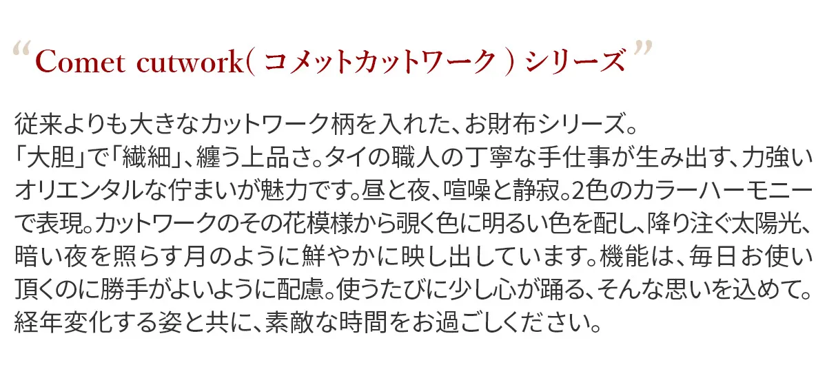 従来よりも大きなカットワーク柄を入れた、お財布シリーズ。 「大胆」で「繊細」、纏う上品さ。タイの職人の丁寧な手仕事が生み出す、力強いオリエンタルな佇まいが魅力です。 昼と夜、喧噪と静寂。2色のカラーハーモニーで表現。 カットワークのその花模様から覗く色に明るい色を配し、降り注ぐ太陽光、暗い夜を照らす月のように鮮やかに映し出しています。 機能は、毎日お使い頂くのに勝手がよいように配慮。 使うたびに少し心が踊る、そんな思いを込めて。 経年変化する姿と共に、素敵な時間をお過ごしください。 職人の手で丁寧に仕上げられたカットワークが目を惹きます。デザインもさることながら、機能性に優れたコンパクトサイズのウォレットです。必要最低限のカード、紙幣、硬貨を収納することができ、ミニマム派の方におすすめです。
