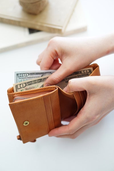 ゴートの魅力は、軽くて丈夫なこと。薄い革ですが、繊維質が緊密で弾力があるため、銀面(革の表面)の強度があります。それでいて、しなやか。さらに雨染みにも強く、扱いやすい革です。 ムラ染めをしたあとに、革の表面にメノウなどの石をあてて磨き上げ、摩擦によって透明感のある艶や色の濃淡を出す、グレージング加工というひと手間がかけられています。 ふっくらとしたフォルムに、軽やかな持ち心地が特徴の山羊革を使用した二つ折り財布です。グレージング加工による、奥行きのある透明感と艶のある表情が目を惹きます。小ぶりなサイズ感ですが、シンプル仕様で機能性抜群です。