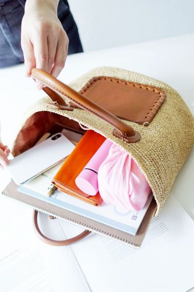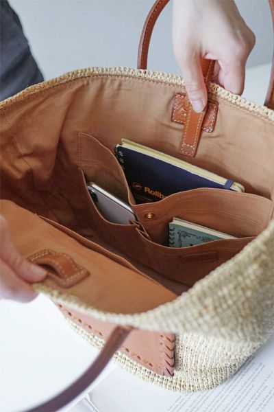 sorriso=イタリア語で”笑顔” ニコニコと、輝く笑顔のように。 マダガスカルに自生するラフィアは軽くて肌触りがよく、他の天然繊維に比べ樹脂を多く含んでいるため、ある程度の防水性があり、使用していくうちに艶がでます。 ラフィアは他の動植物を育成を促すためにも定期的に収穫しなくてはいけないので、持続可能な素材です。 そんなラフィアを糸にし、中国の職人が一目一目丁寧に編んだ本体は、自社工場のタイに旅に出ます。Minerva BOXのポケットはマチを作り、かがりの上にステッチを走らせないような仕様にし、ぱっと見はかがりだけでポケットが止められているような仕上がりに。 笑っているようなお顔に癒され、毎日持ってるだけで楽しい気持ちになれそう。 《素材の特性・メリット》 マダガスカルのラフィアを使用したかごバッグシリーズ。 パーム椰子には天然の樹脂を内部に含んでいるため、革の経年を楽しむように、ラフィアの本体もゆっくりとした経年変化が楽しめるのも魅力です。 付属の革はMinerva BOXを使用。 ラフィアを使用した糸を職人の手で丁寧に編み込んで仕上げられた、軽やかな持ち心地のかごバッグです。 シンプルですが、どこか温かみを感じさせるデザインが魅力で、普段の装いに明るい印象をプラスします。 使い程に潤いと艶が増し、しなやかに馴染んでゆきます。