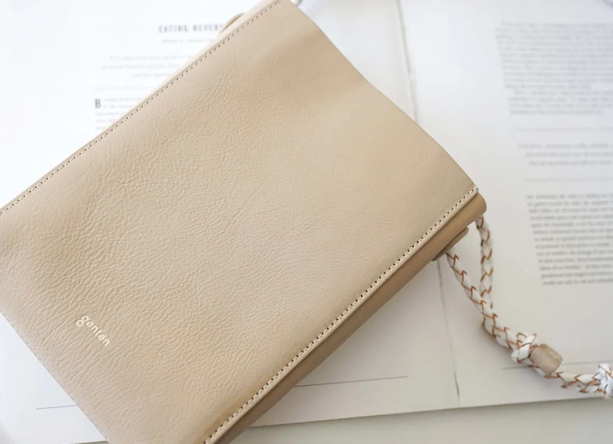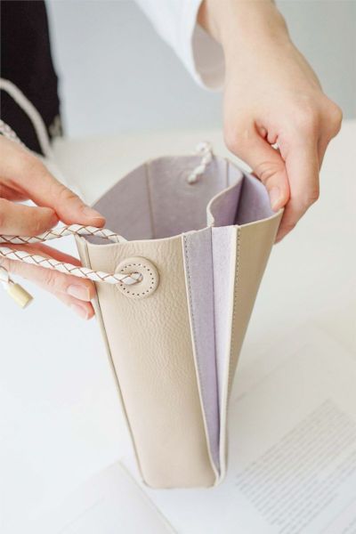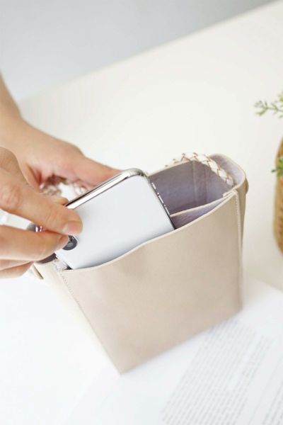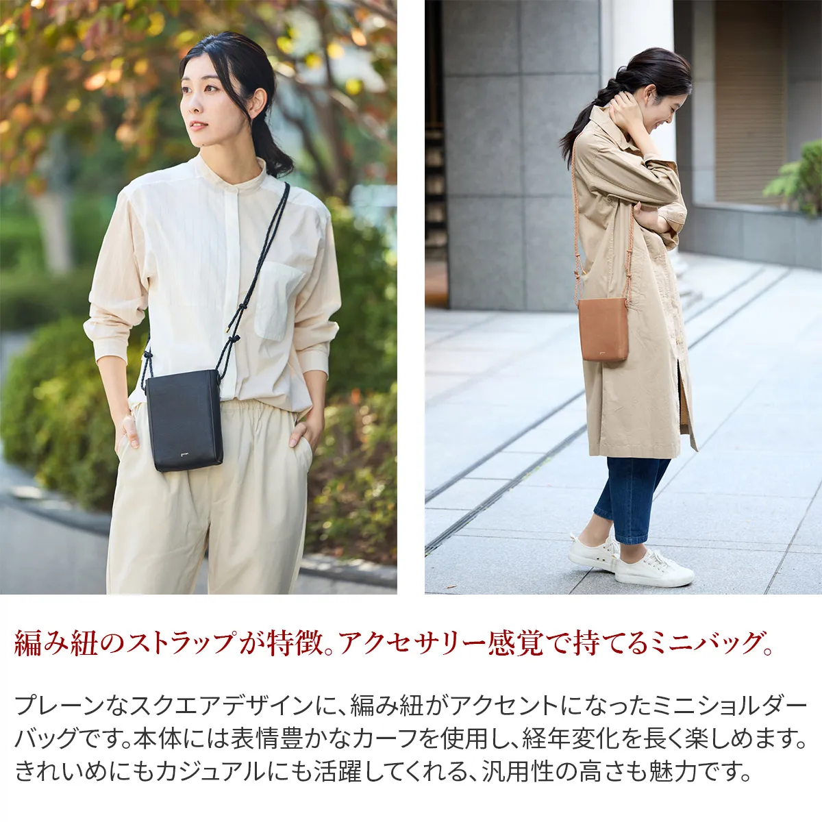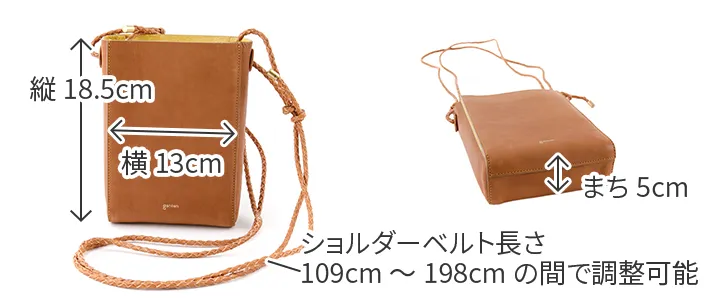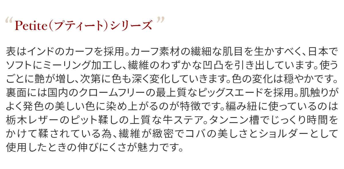 上質なカーフとピッグスエードを贅沢に張り合わせして仕立て上げた、シンプルなプチサイズショルダー。 ディティールをそぎ落とし整理されたフォルムのボティに、手仕事を感じさせる編み紐の精緻さが際立ちます。 表のカーフに対し、ちらりと覗くピッグスエードのバイカラーがーポイントです。 スマートフォン+アルファの必要最低限のものを持ち運ぶのに便利なサイズ感になっています。 〈素材の特性・メリット〉 表はインドのカーフを採用。カーフ素材の繊細な肌目を生かすべく、日本でソフトにミーリング加工し、繊維のわずかな凹凸を引き出しています。 使うごとに艶が増し、次第に色も深く変化していきます。色の変化は穏やかです。 裏面には国内のクロームフリーの最上質なピッグスエードを採用。肌触りがよく発色の美しい色に染め上がるのが特徴です。 編み紐に使っているのは栃木レザーのピット鞣しの上質な牛ステア。 タンニン槽でじっくり時間をかけて鞣されている為、繊維が緻密でコバの美しさとショルダーとして使用したときの伸びにくさが魅力です。 ミニマルなスクエアフォルムが印象的なミニショルダーバッグです。 丁寧に編み上げられた牛革製のショルダーベルトは調節幅が広いつくりで、肩がけ、斜めがけの両方に対応しています。 プレーンなデザインなのでシーンや服装に左右されず、ワンマイルのお出かけから旅行先まで、幅広く活躍してくれます。