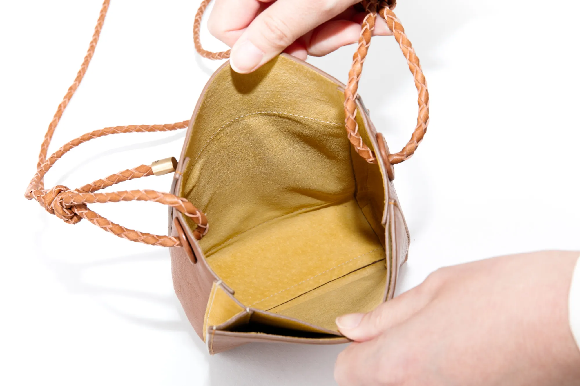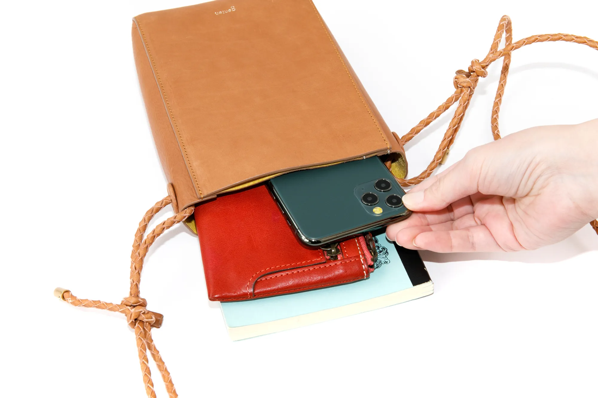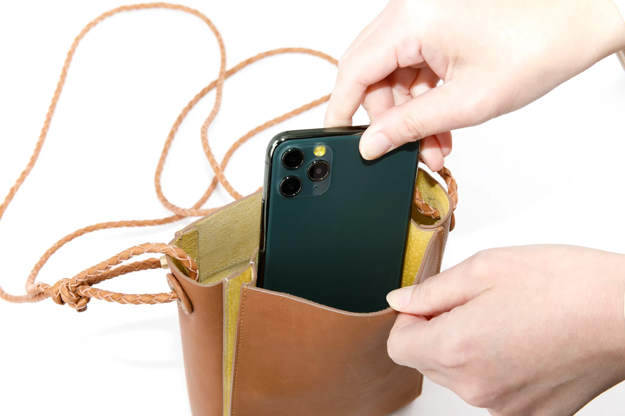 上質なカーフとピッグスエードを贅沢に張り合わせして仕立て上げた、シンプルなプチサイズショルダー。 ディティールをそぎ落とし整理されたフォルムのボティに、手仕事を感じさせる編み紐の精緻さが際立ちます。 表のカーフに対し、ちらりと覗くピッグスエードのバイカラーがーポイントです。 スマートフォン+アルファの必要最低限のものを持ち運ぶのに便利なサイズ感になっています。 〈素材の特性・メリット〉 表はインドのカーフを採用。カーフ素材の繊細な肌目を生かすべく、日本でソフトにミーリング加工し、繊維のわずかな凹凸を引き出しています。 使うごとに艶が増し、次第に色も深く変化していきます。色の変化は穏やかです。 裏面には国内のクロームフリーの最上質なピッグスエードを採用。肌触りがよく発色の美しい色に染め上がるのが特徴です。 編み紐に使っているのは栃木レザーのピット鞣しの上質な牛ステア。 タンニン槽でじっくり時間をかけて鞣されている為、繊維が緻密でコバの美しさとショルダーとして使用したときの伸びにくさが魅力です。 ミニマルなスクエアフォルムが印象的なミニショルダーバッグです。 丁寧に編み上げられた牛革製のショルダーベルトは調節幅が広いつくりで、肩がけ、斜めがけの両方に対応しています。 プレーンなデザインなのでシーンや服装に左右されず、ワンマイルのお出かけから旅行先まで、幅広く活躍してくれます。