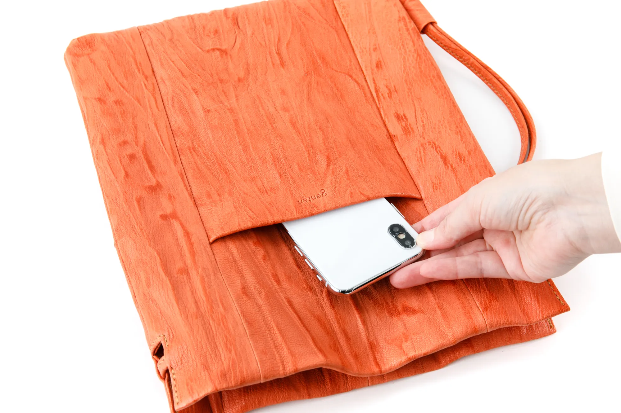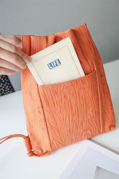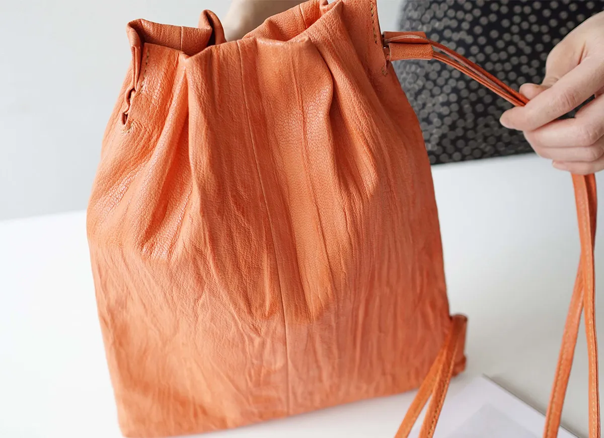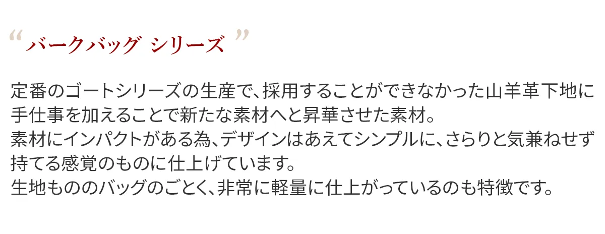 定番のゴートシリーズの生産で、採用することができなかった山羊革下地に手仕事を加えることで新たな素材へと昇華させた素材。 素材にインパクトがある為、デザインはあえてシンプルに、さらりと気兼ねせず持てる感覚のものに仕上げています。 生地もののバッグのごとく、非常に軽量に仕上がっているのも特徴です。 〈素材の特性・メリット〉 山羊革を染色後に職人の手によって絞り加工し、その上からさらに手染め加工を施すことで革に特徴的な景色を作り上げています。 これまでのゴート製品になかった明るめのカラーも特徴です。 余計な装飾を省き、素材の魅力を存分に生かしたシンプルなデザインが魅力です。 手仕事により染め上げられており、濃淡により奥行きのある色合いが個性を放ちます。 革バッグと思えないほど軽く、ショルダーの通し方でスタイルが変わる2WAY仕様です。