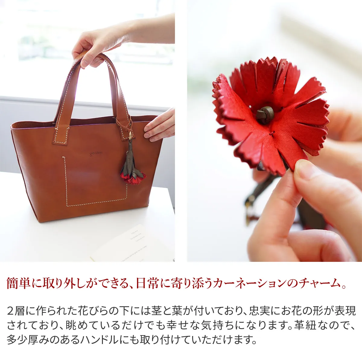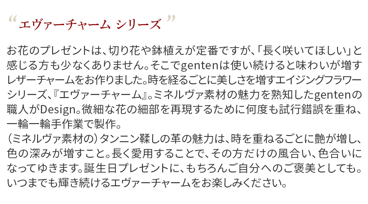 お花のプレゼントは、切り花や鉢植えが定番ですが、 「長く咲いてほしい」と感じる方も少なくありません。そこでgentenは使い続けると味わいが増すレザーチャームをお作りました。 時を経るごとに美しさを増すエイジングフラワーシリーズ、『エヴァーチャーム』。ミネルヴァ素材の魅力を熟知したgentenの職人がDesign。 微細な花の細部を再現するために何度も試行錯誤を重ね、一輪一輪手作業で製作。 (ミネルヴァ素材の)タンニン鞣しの革の魅力は、時を重ねるごとに艶が増し、色の深みが増すこと。長く愛用することで、 その方だけの風合い、色合いになってゆきます。誕生日プレゼントに、もちろんご自分へのご褒美としても。いつまでも輝き続けるエヴァーチャームをお楽しみください。 愛らしいカーネーションモチーフなので、バッグや鍵に付けていただくだけで気分も上がります。