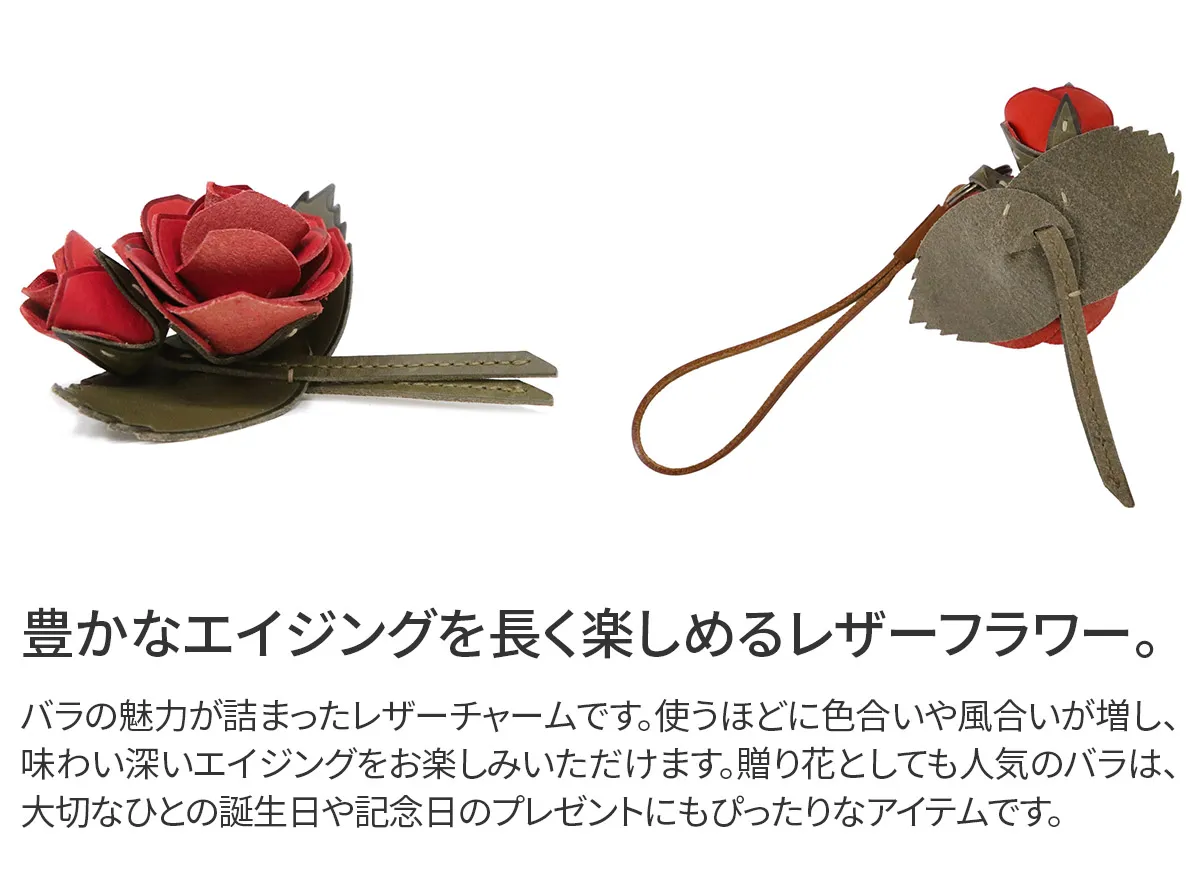 お花のプレゼントは、切り花や鉢植えが定番ですが、 「長く咲いてほしい」と感じる方も少なくありません。そこでgentenは使い続けると味わいが増すレザーチャームをお作りました。時を経るごとに美しさを増すエイジングフラワーシリーズ、『エヴァーチャーム』。ミネルヴァ素材の魅力を熟知したgentenの職人がDesign。 微細な花の細部を再現するために何度も試行錯誤を重ね、一輪一輪手作業で製作。(ミネルヴァ素材の)タンニン鞣しの革の魅力は、時を重ねるごとに艶が増し、色の深みが増すこと。長く愛用することで、その方だけの風合い、色合いになってゆきます。誕生日プレゼントに、もちろんご自分へのご褒美としても。いつまでも輝き続けるエヴァーチャームをお楽しみください。 5月:バラ 花言葉:「愛情」「情熱」「美」。 大切な人への贈り物として最適な花言葉。地球上でもっとも美しい花とされ、「花の女王」とも。 いつまでも咲き続けるレザーフラワーは大切なひとへの贈り物や自分へのご褒美にも最適です。お気に入りのバッグに着けるだけでいつものコーデに華やかさをプラスします。