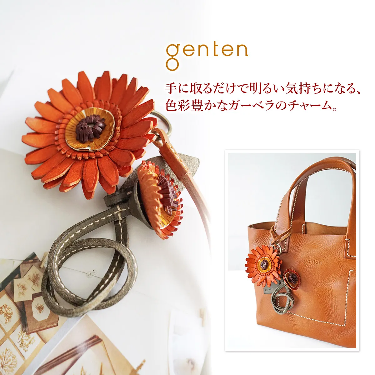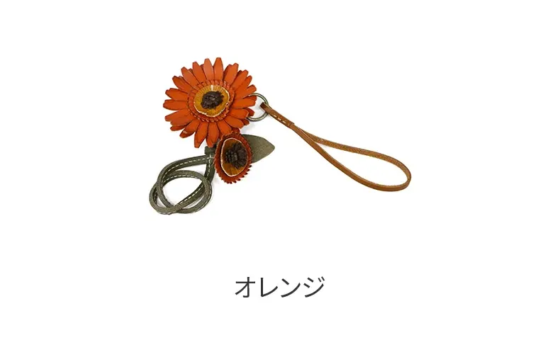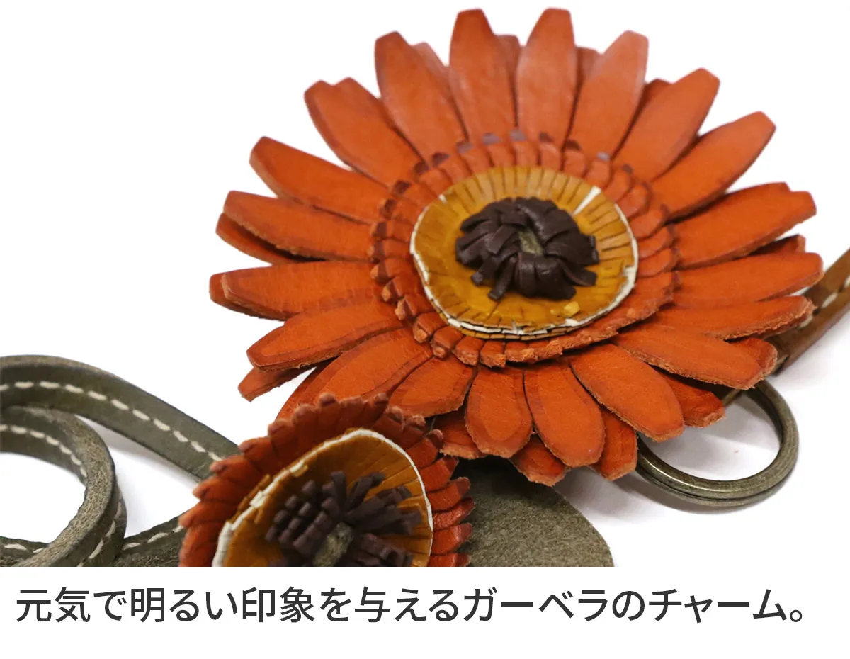 お花のプレゼントは、切り花や鉢植えが定番ですが、 「長く咲いてほしい」と感じる方も少なくありません。そこでgentenは使い続けると味わいが増すレザーチャームをお作りました。時を経るごとに美しさを増すエイジングフラワーシリーズ、『エヴァーチャーム』。ミネルヴァ素材の魅力を熟知したgentenの職人がDesign。 微細な花の細部を再現するために何度も試行錯誤を重ね、一輪一輪手作業で製作。(ミネルヴァ素材の)タンニン鞣しの革の魅力は、時を重ねるごとに艶が増し、色の深みが増すこと。長く愛用することで、その方だけの風合い、色合いになってゆきます。誕生日プレゼントに、もちろんご自分へのご褒美としても。いつまでも輝き続けるエヴァーチャームをお楽しみください。 10月:ガーベラ 花言葉:ガーベラ全体の花言葉は「神秘・崇高美」。オレンジのガーベラの花言葉は「神秘」。 深みのあるオレンジが印象的なガーベラのレザーチャームです。大きさの異なる花が寄り添っている本物のようなデザインです。お気に入りのバッグに着けるだけでいつものコーデに華やかさをプラスします。