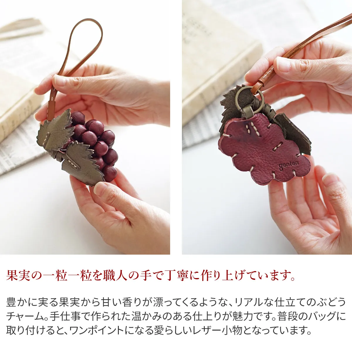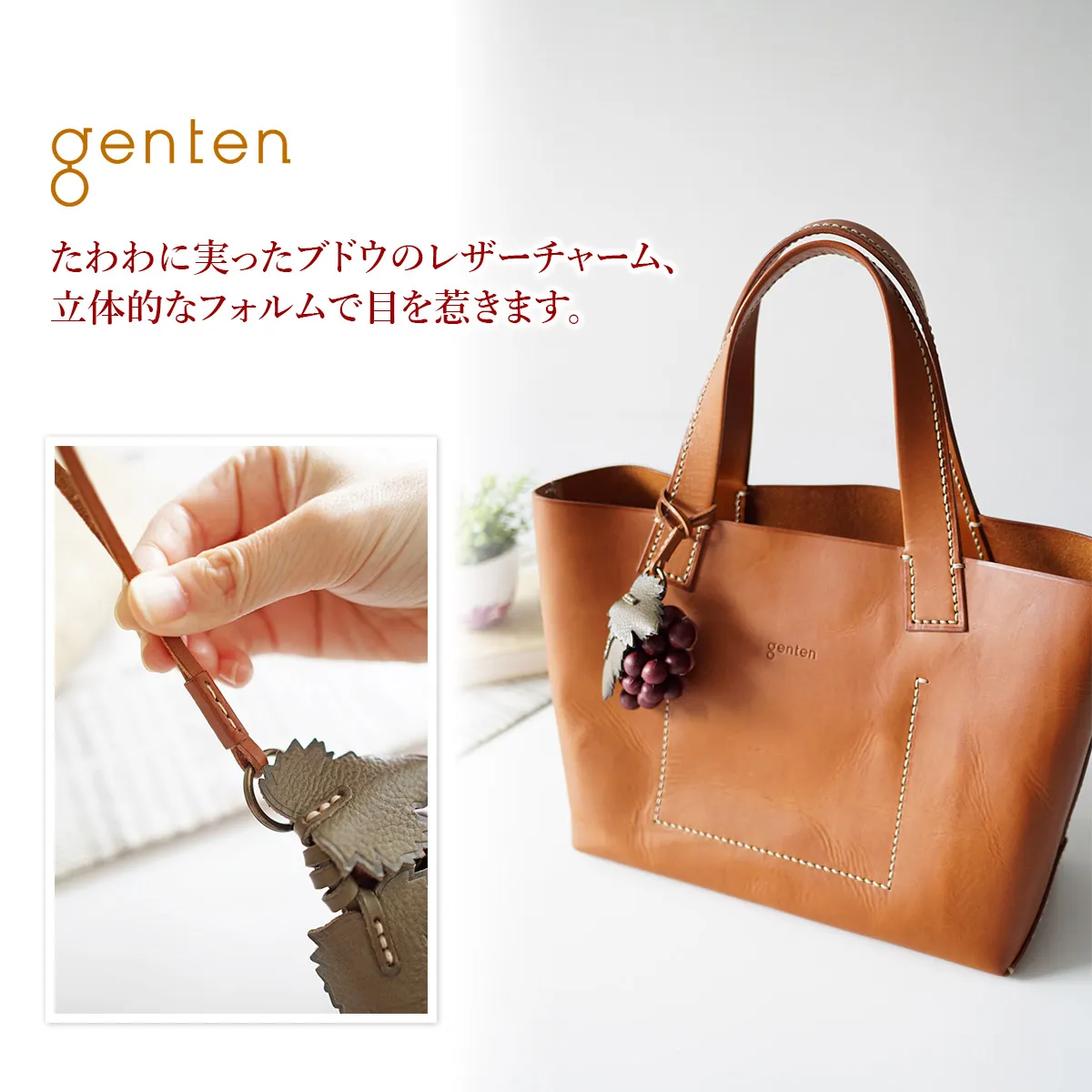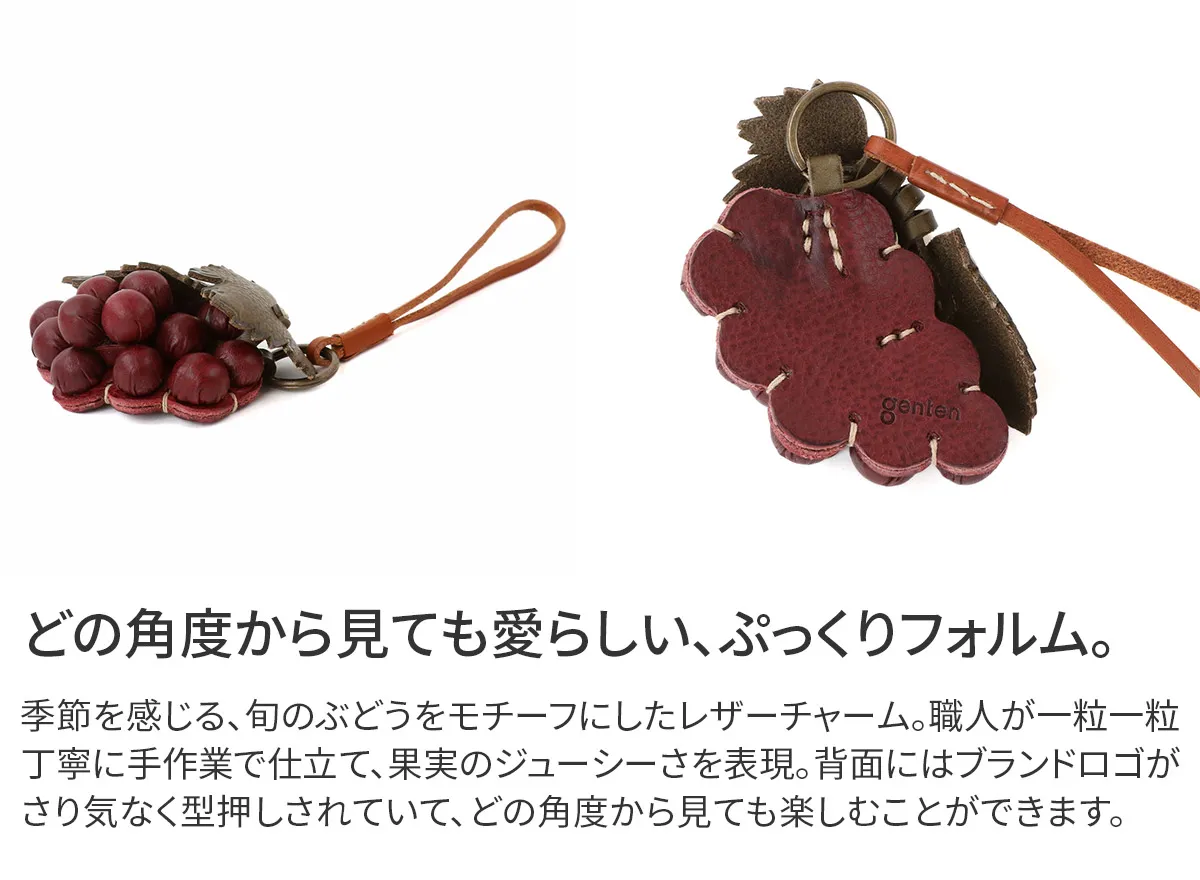 お花のプレゼントは、切り花や鉢植えが定番ですが、 「長く咲いてほしい」と感じる方も少なくありません。そこでgentenは使い続けると味わいが増すレザーチャームをお作りました。時を経るごとに美しさを増すエイジングフラワーシリーズ、『エヴァーチャーム』。ミネルヴァ素材の魅力を熟知したgentenの職人がDesign。 微細な花の細部を再現するために何度も試行錯誤を重ね、一輪一輪手作業で製作。(ミネルヴァ素材の)タンニン鞣しの革の魅力は、時を重ねるごとに艶が増し、色の深みが増すこと。長く愛用することで、その方だけの風合い、色合いになってゆきます。誕生日プレゼントに、もちろんご自分へのご褒美としても。いつまでも輝き続けるエヴァーチャームをお楽しみください。 ブランド25周年のロゴにも採用したブドウとブドウの蔓。花言葉:は、「人間愛」「思いやり」「信頼」。人間らしさや自然の摂理、繁茂してゆく様に由来しています。
