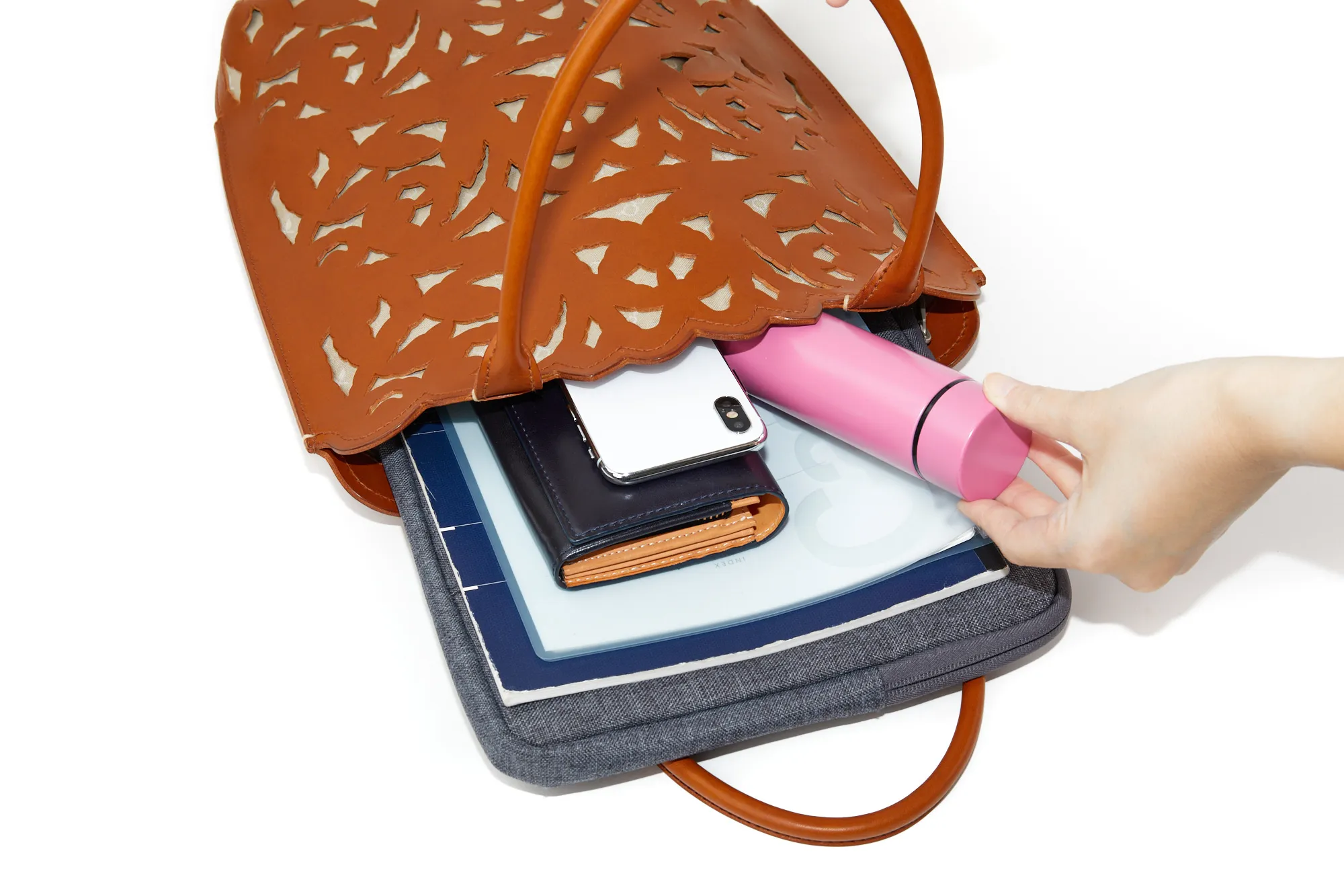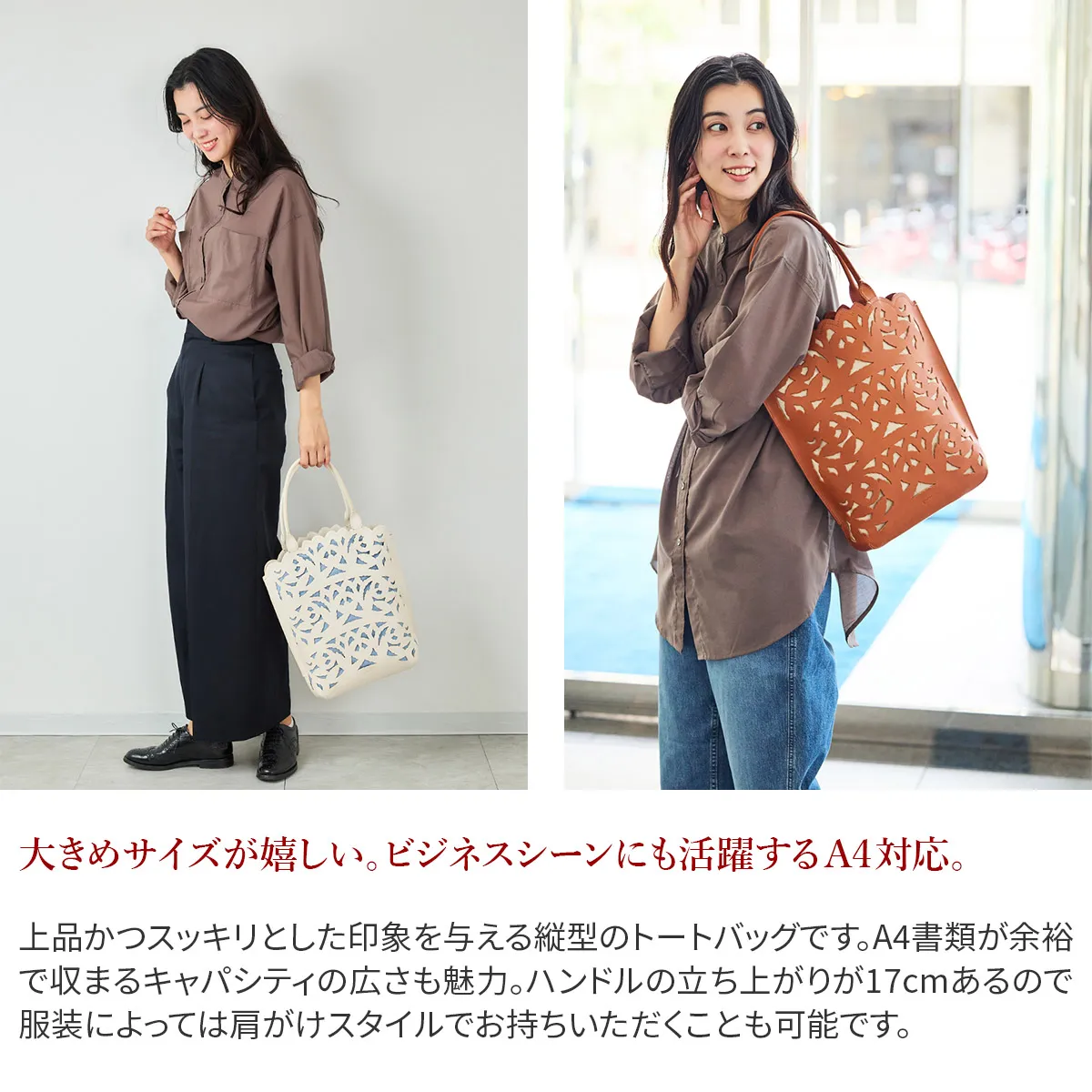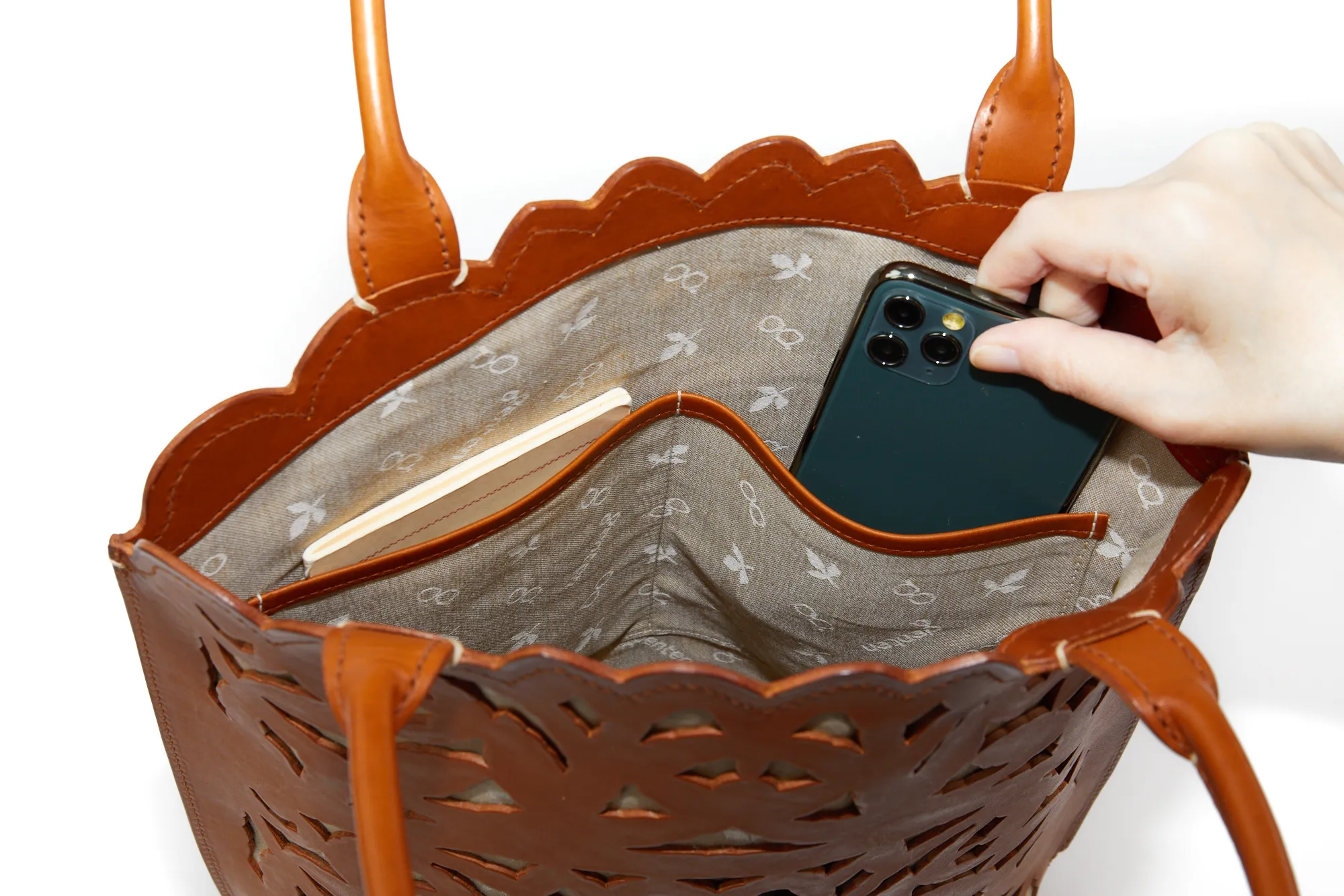 涼しげな抜き柄と共に上質な素材感を十分にご堪能いただけるカットワークの新ライン。植物への賛美とクラフトマンシップをテーマに、新たなカットワーク柄を作成しました。 蔦を絡ませながら伸びやかに成長し、やがて美しい花を咲かせ、実を育む。豊かな植物の情景を、ゆらぎと共に流れるような曲線状に配しました。 模様のシルエットのラインは単純な直線ではなく、人の手でなければ作り上げることのできないゆらぎを表現しています。 例えば、庭園にあるようなロートアイアンの門扉やアーチ。ハンマーで形成する際に槌目が残ることで、エッジがランダムに潰れ、あたたかみのあるラインが生じます。 バッグはヘリ周りをラウンドカットにすることで柄との一体感を作り出し、新たなムードを出しています。底にかけての形の繋がりを大切に、自然に丸みを帯びた仕立ては持つ人に柔らかな印象を与えてくれます。 カットワークの柄は少し大きめの抜け感でバッグのインナーとのカラーコントラストが軽快な印象です。 繊細なカットワークと内素材のカラーのコントラストが美しいトートバッグ。 深さのあるフォルムで荷物をすっぽりと収納できます。 内部はオープンポケットが2ヶ所に 深さのある大きめにファスナーポケットが備えられています。 また、リングが備えられているので キーケースや定期入れなどを取り付ける事ができ大変便利です。 コーデのアクセントになる、目を惹くデザインが魅力的のアイテムです。