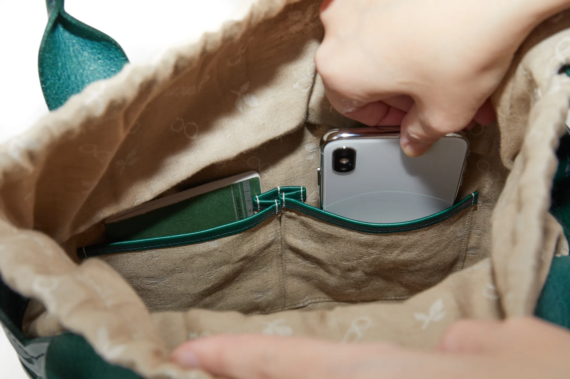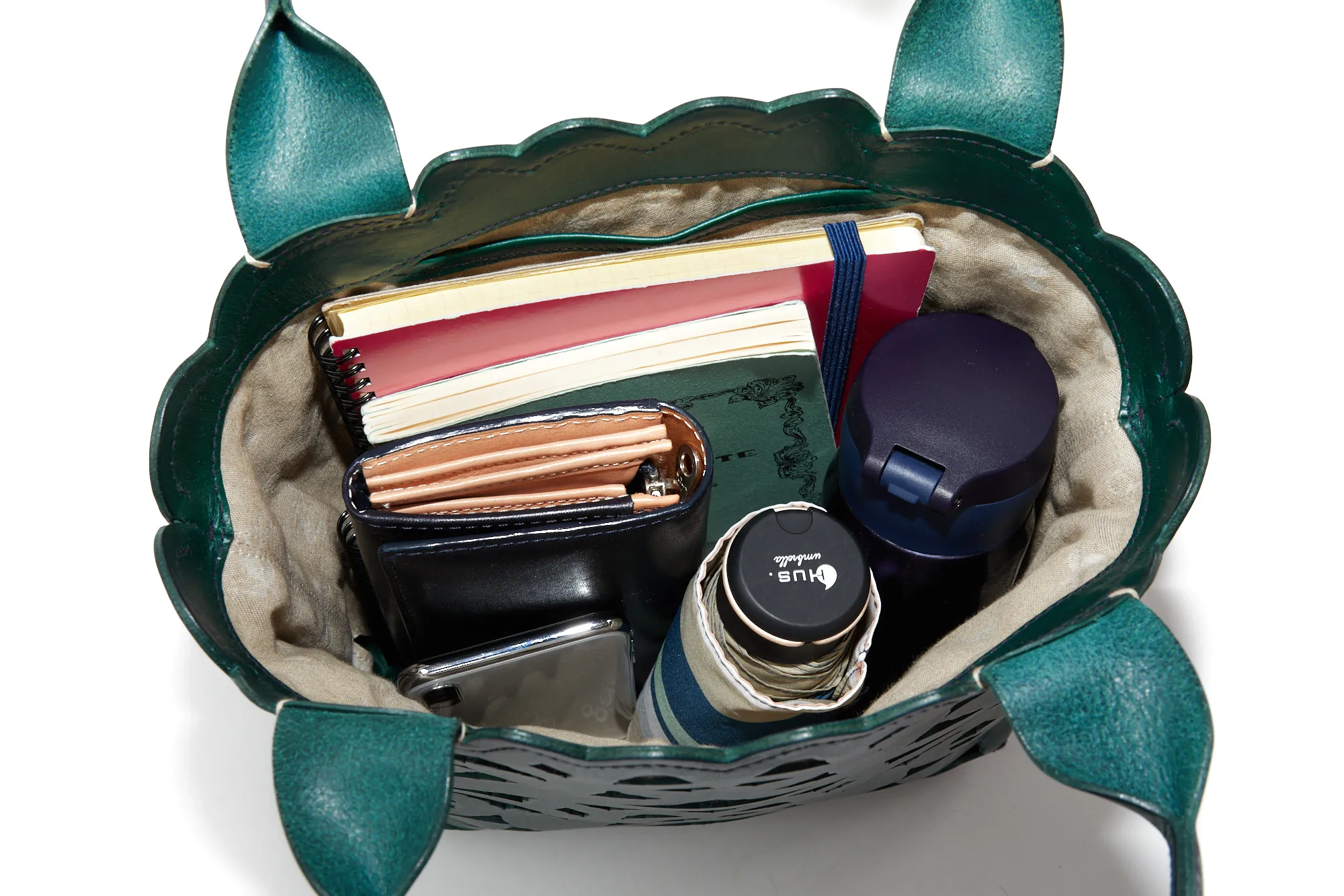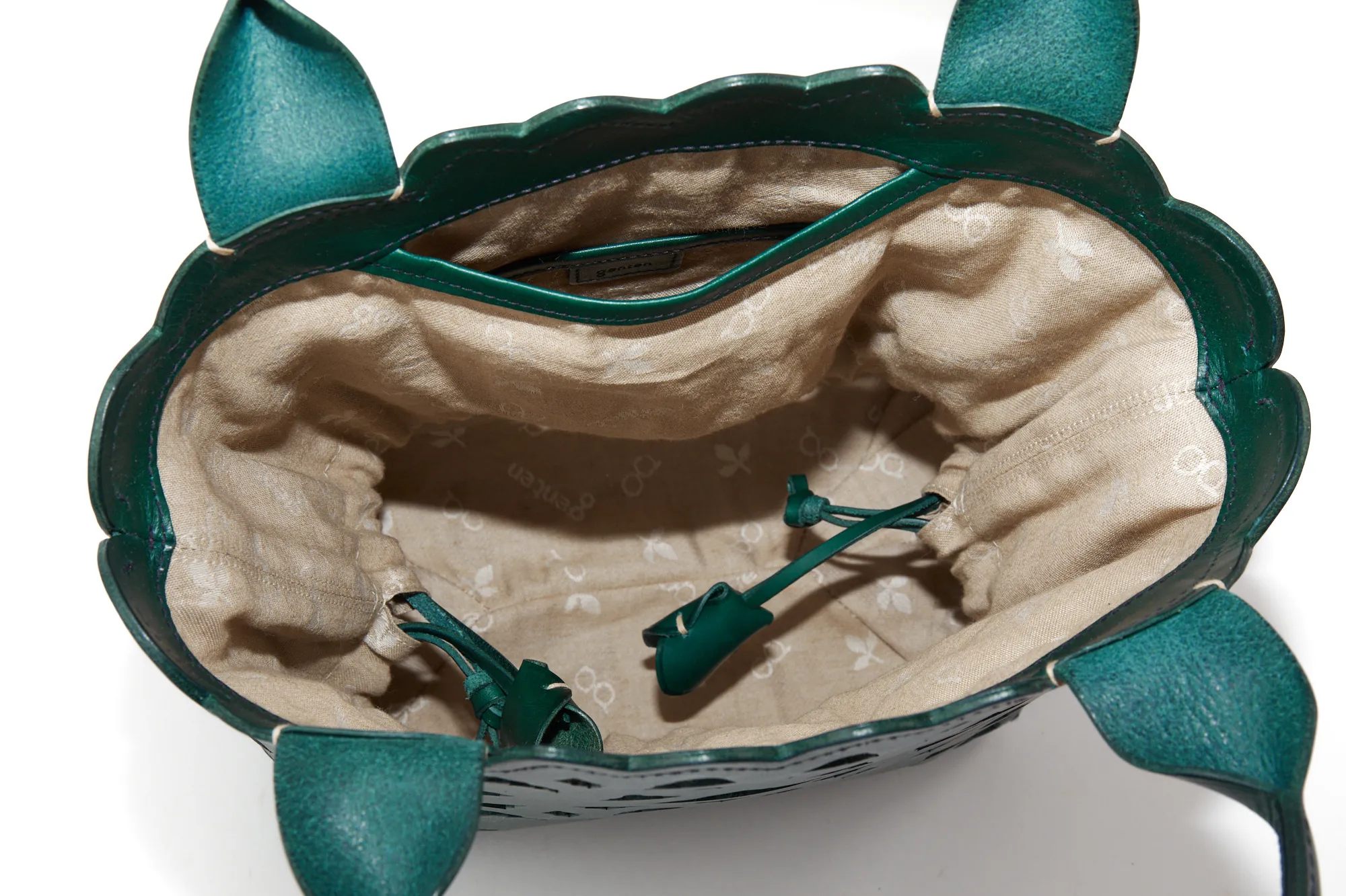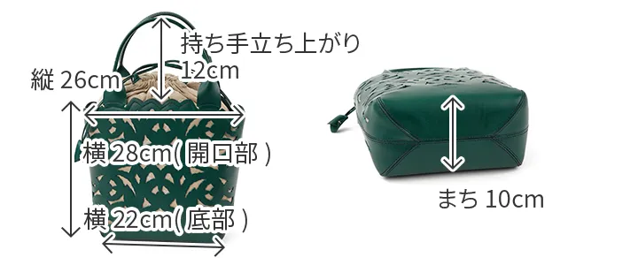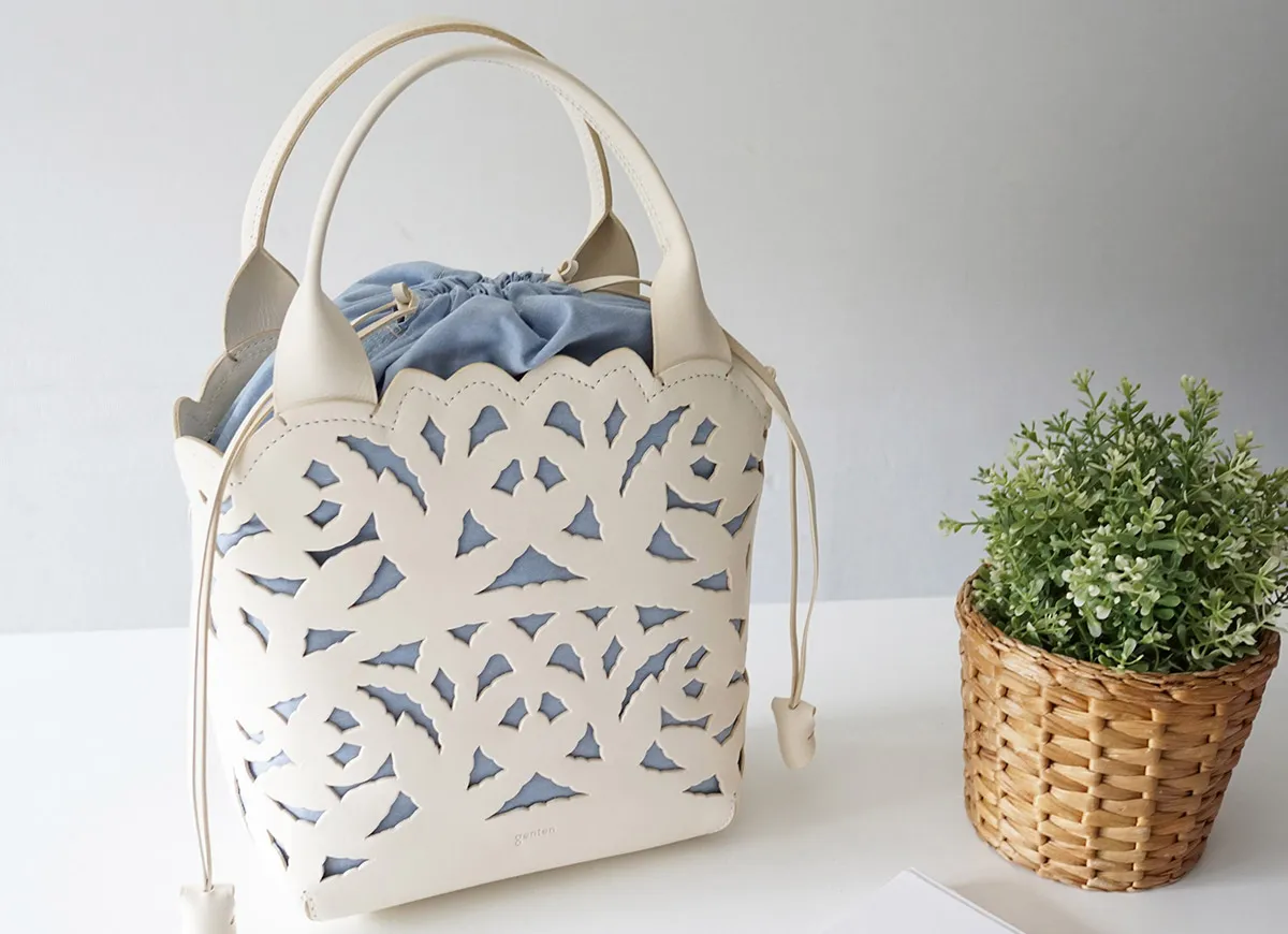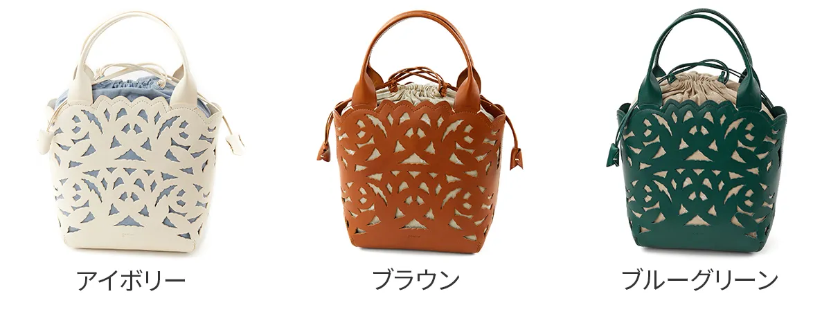 涼しげな抜き柄と共に上質な素材感を十分にご堪能いただけるカットワークの新ライン。植物への賛美とクラフトマンシップをテーマに、新たなカットワーク柄を作成しました。 蔦を絡ませながら伸びやかに成長し、やがて美しい花を咲かせ、実を育む。豊かな植物の情景を、ゆらぎと共に流れるような曲線状に配しました。 模様のシルエットのラインは単純な直線ではなく、人の手でなければ作り上げることのできないゆらぎを表現しています。 例えば、庭園にあるようなロートアイアンの門扉やアーチ。ハンマーで形成する際に槌目が残ることで、エッジがランダムに潰れ、あたたかみのあるラインが生じます。 バッグはヘリ周りをラウンドカットにすることで柄との一体感を作り出し、新たなムードを出しています。底にかけての形の繋がりを大切に、自然に丸みを帯びた仕立ては持つ人に柔らかな印象を与えてくれます。 カットワークの柄は少し大きめの抜け感でバッグのインナーとのカラーコントラストが軽快な印象です。 繊細なカットワークと内素材のカラーのコントラストが美しいトートバッグ。上品なデザインに、メイン開口部の巾着をクシュっと結ぶと愛らしい印象に。バッグのインナーにはブランドロゴやリーフ等の柄が施されており、細部までデザイン性が高く目を惹きます。B5サイズが収納可能で、使いやすいサイズ感も◎持つだけでコーデを華やかに演出してくれます。