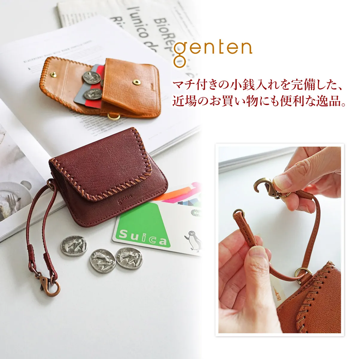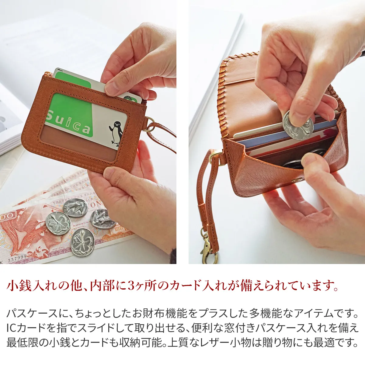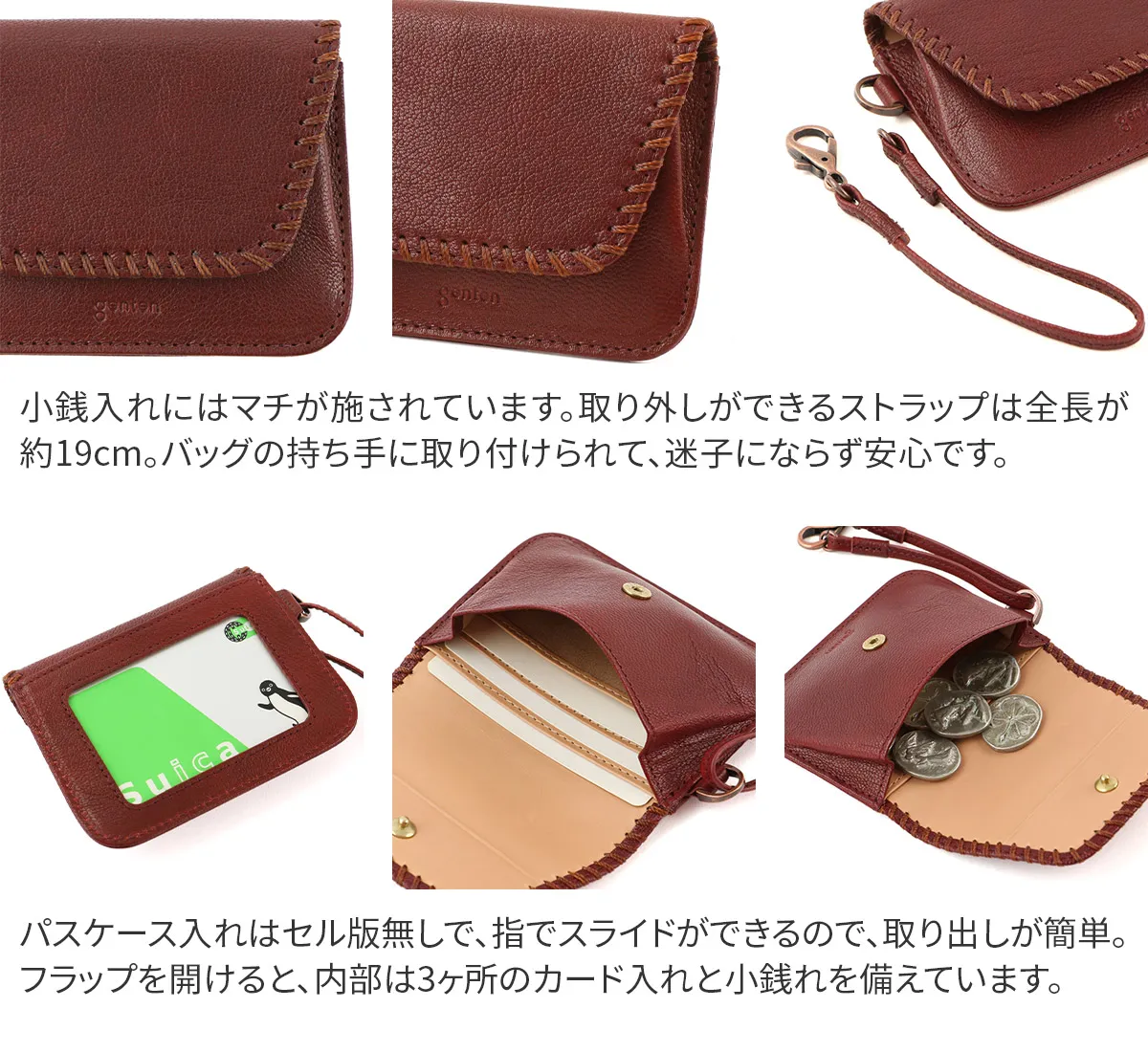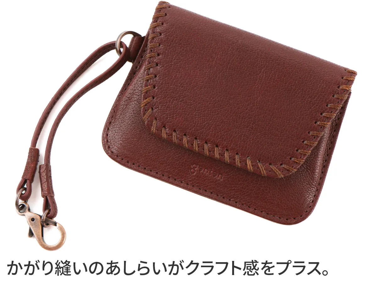 Cornetto =伊で「角笛」の意。かがり糸は、革に対してあえて異素材の糸を使用することで繊細な印象のあしらいに。ひと針ひと針丁寧な手仕事で手掛るかがりは、2回づつ糸を通していることできれいに揃った仕上がりにしています。素材の柔らかさと、手仕事の温かさ、日々使いながら感じることのできる経年変化、革という素材だからこそ楽しむことのできる魅力を感じてもらえるよう作られています。 〈素材の特性・メリット〉定番ゴートベーシックで使用しているゴートを採用。軽くて丈夫な繊維、透明感のある染料仕上げ。メノウ石で磨くグレージング加工による焦げとツヤの濃淡が魅力です。 銀面の美しい山羊革のナチュラルな素材感が、手に取るたび実感できる一品です。シンプルだけど味わい深さもあり、飽きが来ず長く持てます。パスケースの他に、数枚のカードと必要最低限の小銭入れも備えられているので、キャッシュレス派の方にも最適です。