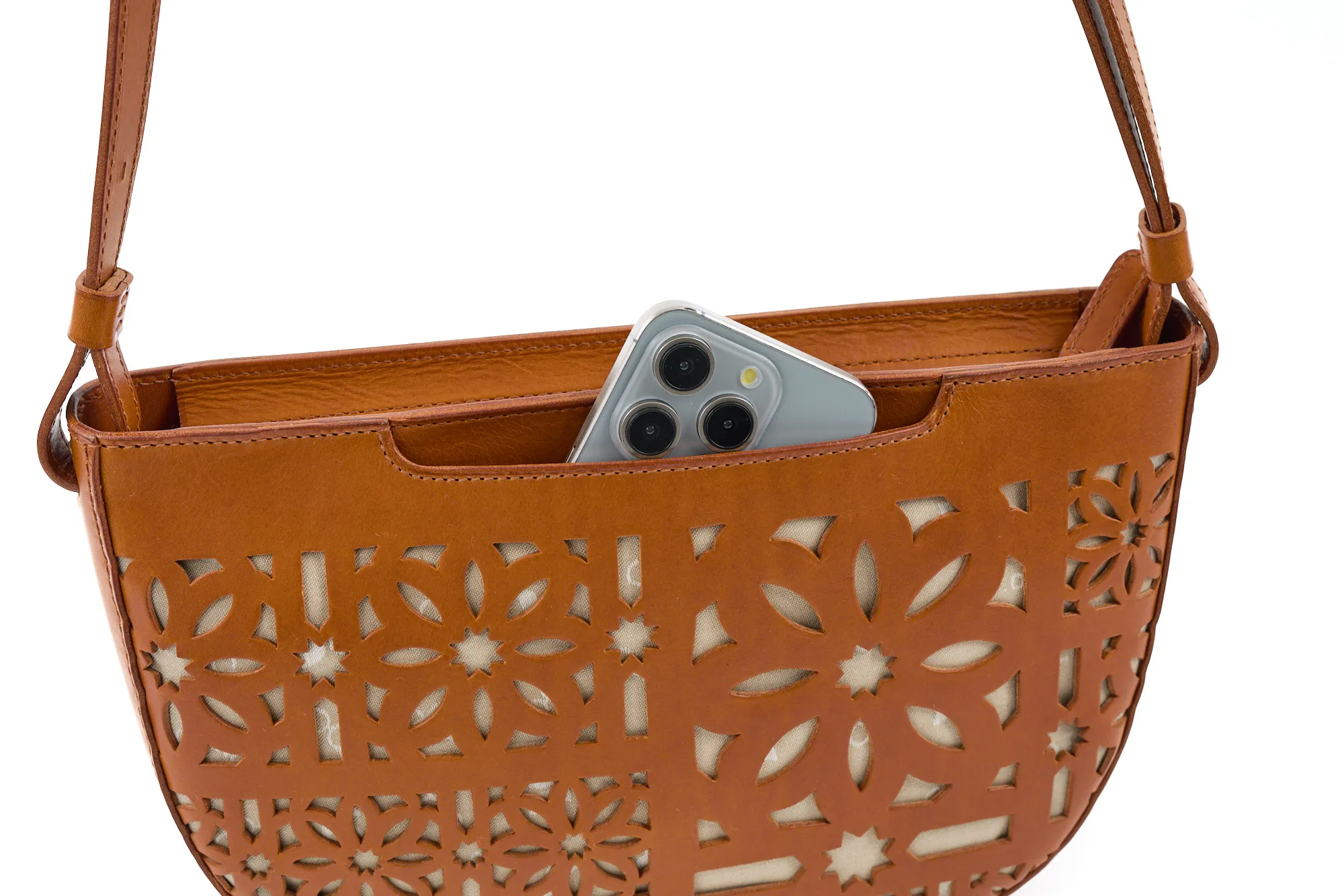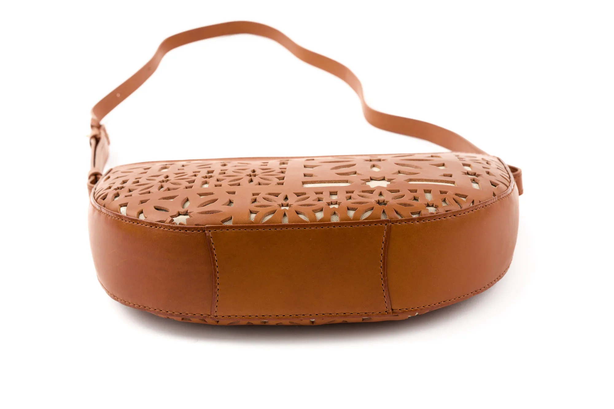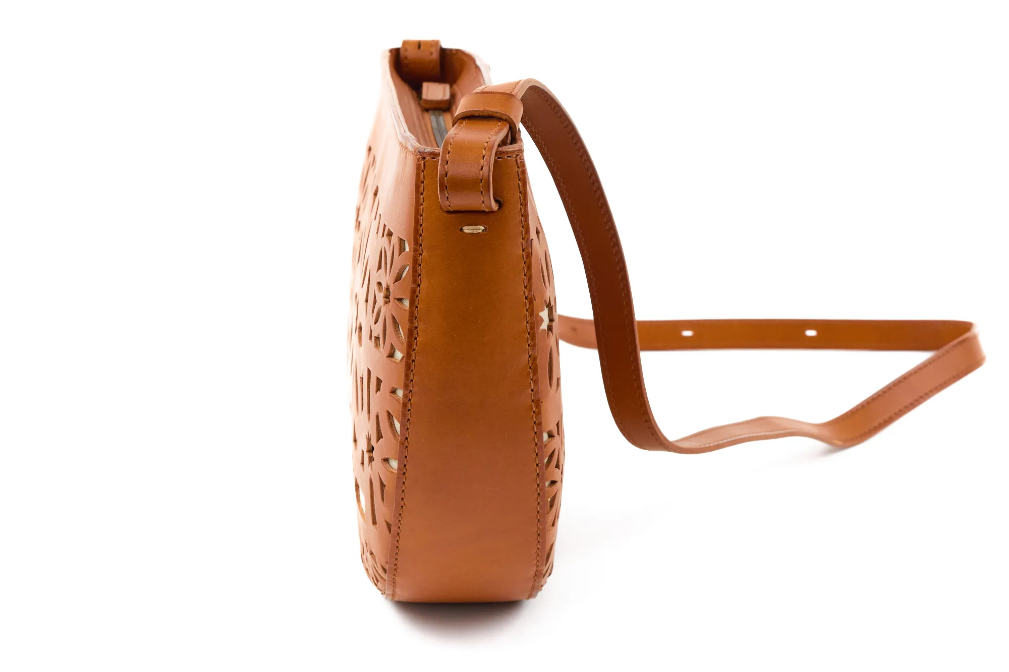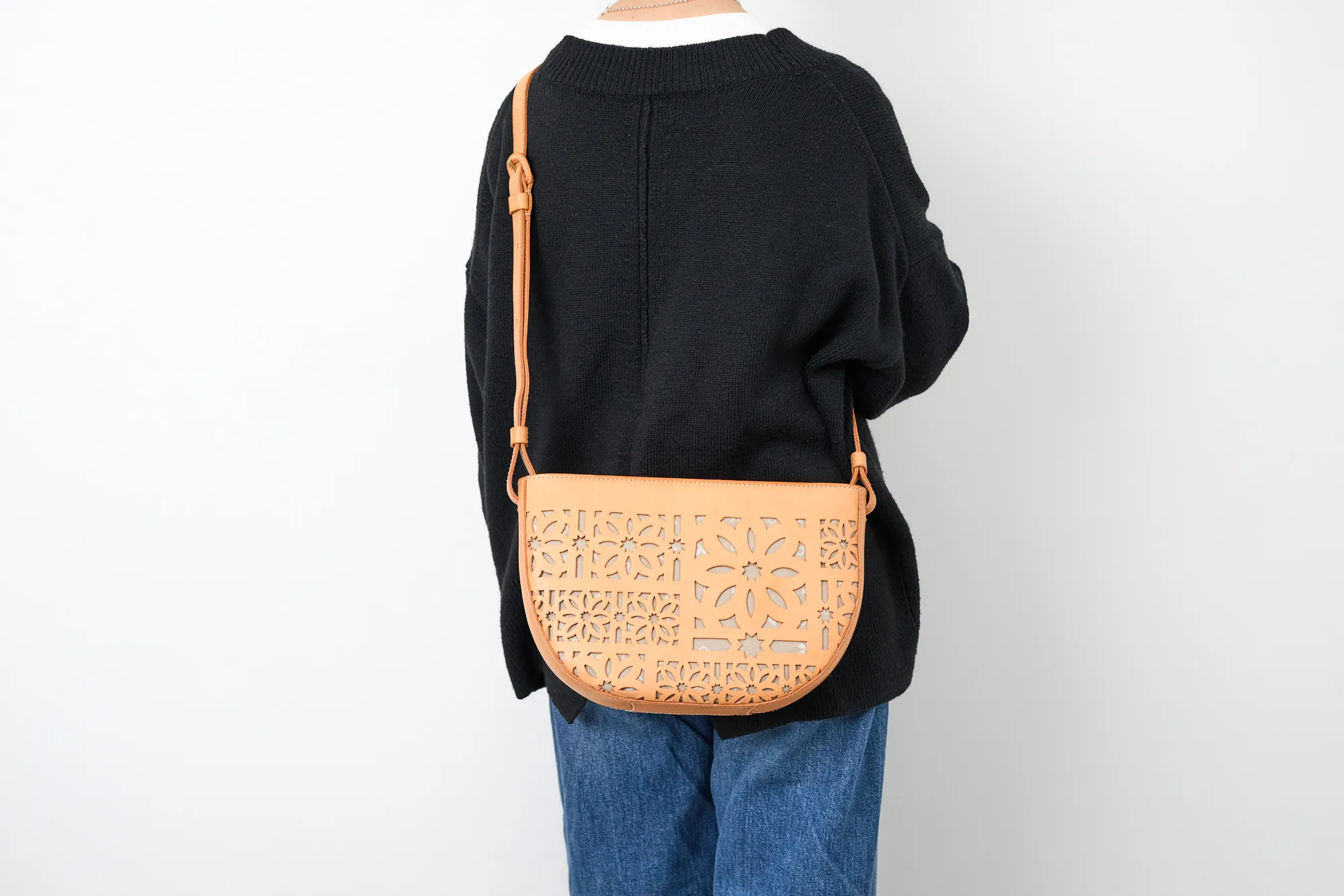 半月型の丸みを帯びたフォルムが愛らしく、カットワークがコーデを華やに彩ってくれます。 ショルダーベルトは長さを約70cm~123cmまで設けており、8段階調節が可能。 ワンショルダーから斜め掛けまで、コーデや身長に合わせお好きな持ち方ができます。 開口部は利便性を考えたファスナー仕様で、スムーズな開閉ができます。 マチが薄いので体への当たりが少なく、お出かけに丁度いいサイズ感のアイテムです。