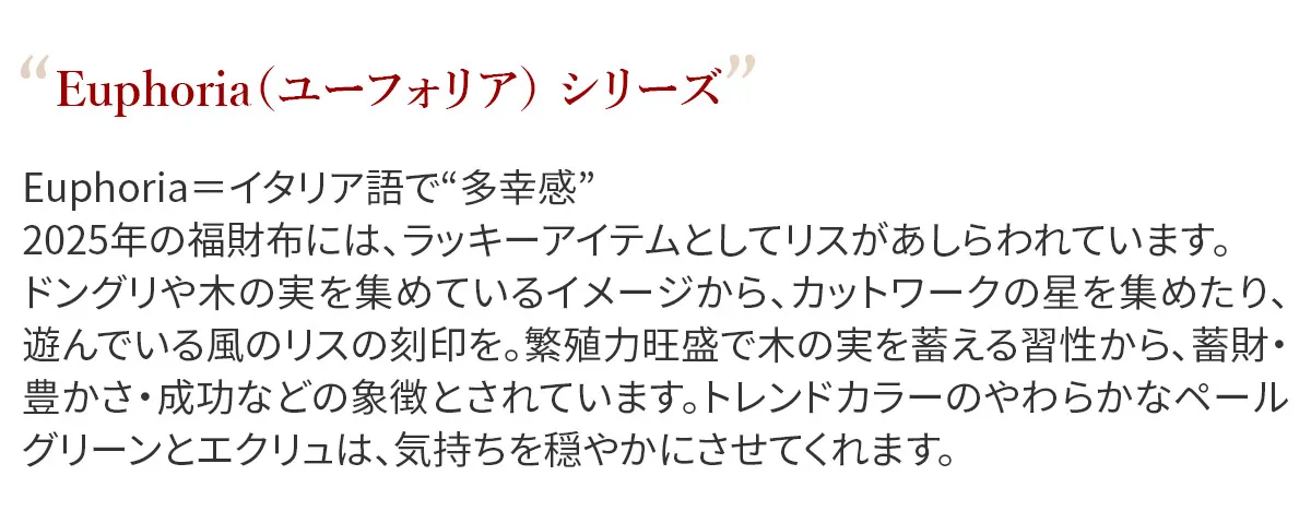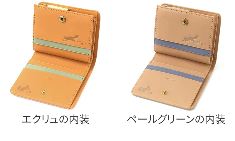 2025年の福財布には、ラッキーアイテムとしてリスがあしらわれています。ドングリや木の実を集めているイメージから、カットワークの星を集めたり、遊んでいる風のリスの刻印を。繁殖力旺盛で木の実を蓄える習性から、蓄財・豊かさ・成功などの象徴とされています。トレンドカラーのやわらかなペールグリーンとエクリュは、気持ちを穏やかにさせてくれます。 〈素材の特性・メリット〉白鞣しの下地から染色をしているため、経年しても赤味が出にくく色が冷めていくのが特徴。非常に軽量で、きめ細やかな手触りをお楽しみください。 L字に大きく開く小銭入れが外に付いた二つ折り財布です。財布の開け閉めをせず、小銭入れにすぐにアクセスが可能。ボタンを開けるとカードと紙幣入れが備えられたシンプルな仕様です。白鞣しのレザーは銀面にお化粧をしていないので、カーフ特有のきめ細やかなさらっと手なじみのいい感触を実感できます。