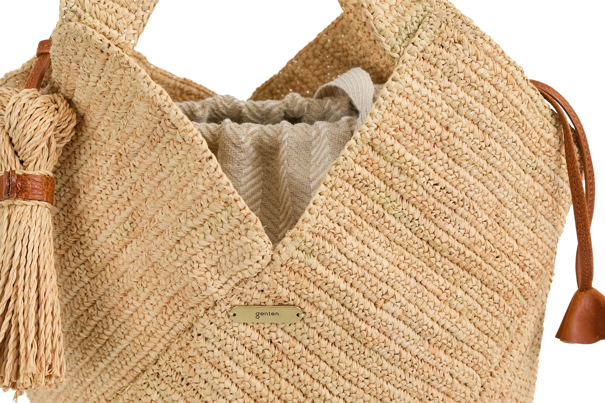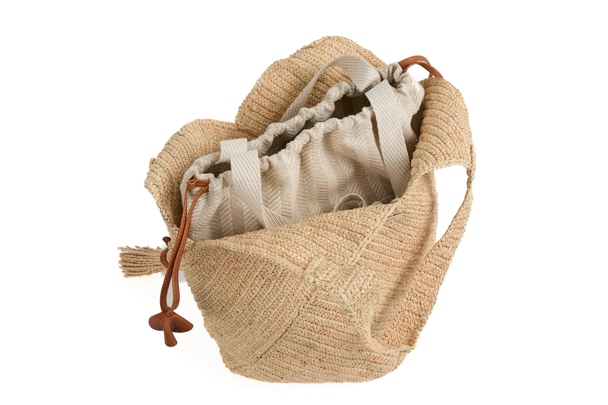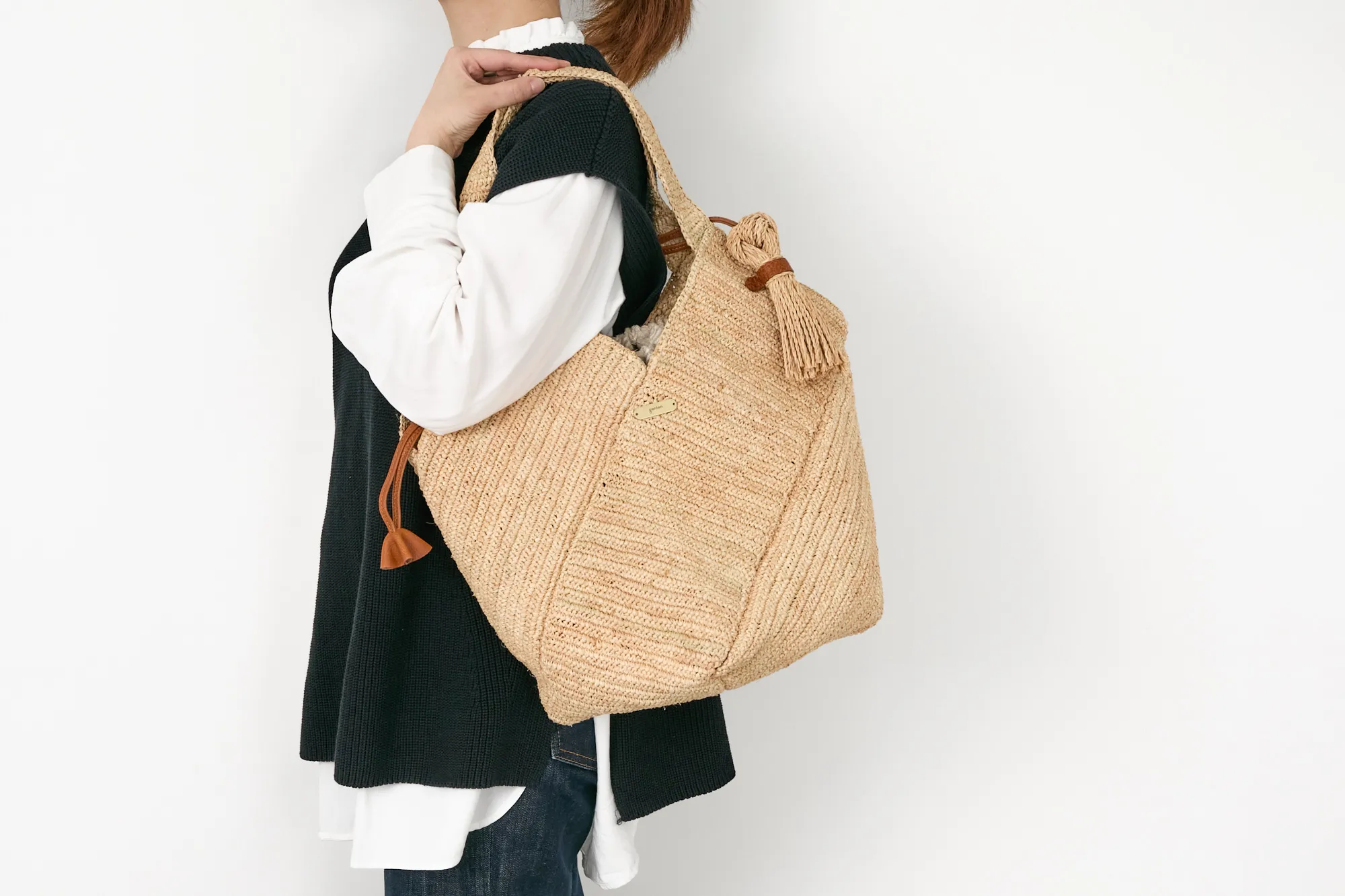 伊語でバカンスを意味する「Ferie」。 マダガスカル産ラフィアを、帯状に丁寧に編み立てたものを4枚編み合わせています。 直角の角を4点合わせた底面から胴にかけて、45度で螺旋状に立ち上がる展開図のような立体構造は、シンプルなコマ編みが大きなバイアス柄のように映り、視覚的にも楽しい印象に。 内巾着がセットになっており、旅先での2ndバッグとして、出先で荷物が増えてしまったとき、第2のバッグとして活躍します。 軽快さと優雅さを兼ね備えた「Ferie」、日常のお出かけはもちろん、喧騒から離れて心を解放する特別なバカンスのひとときを彩るシリーズです。