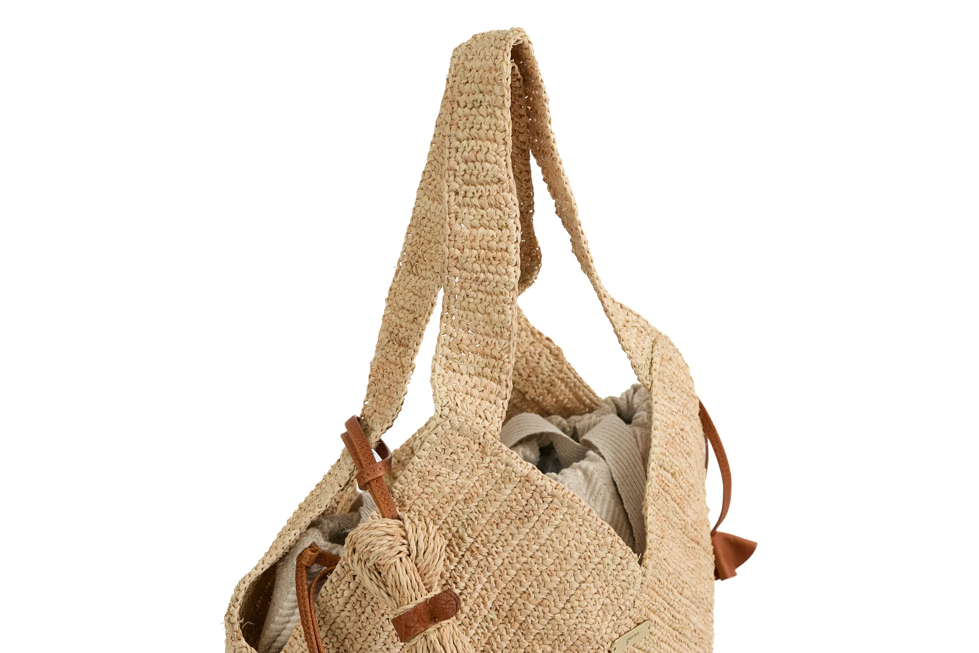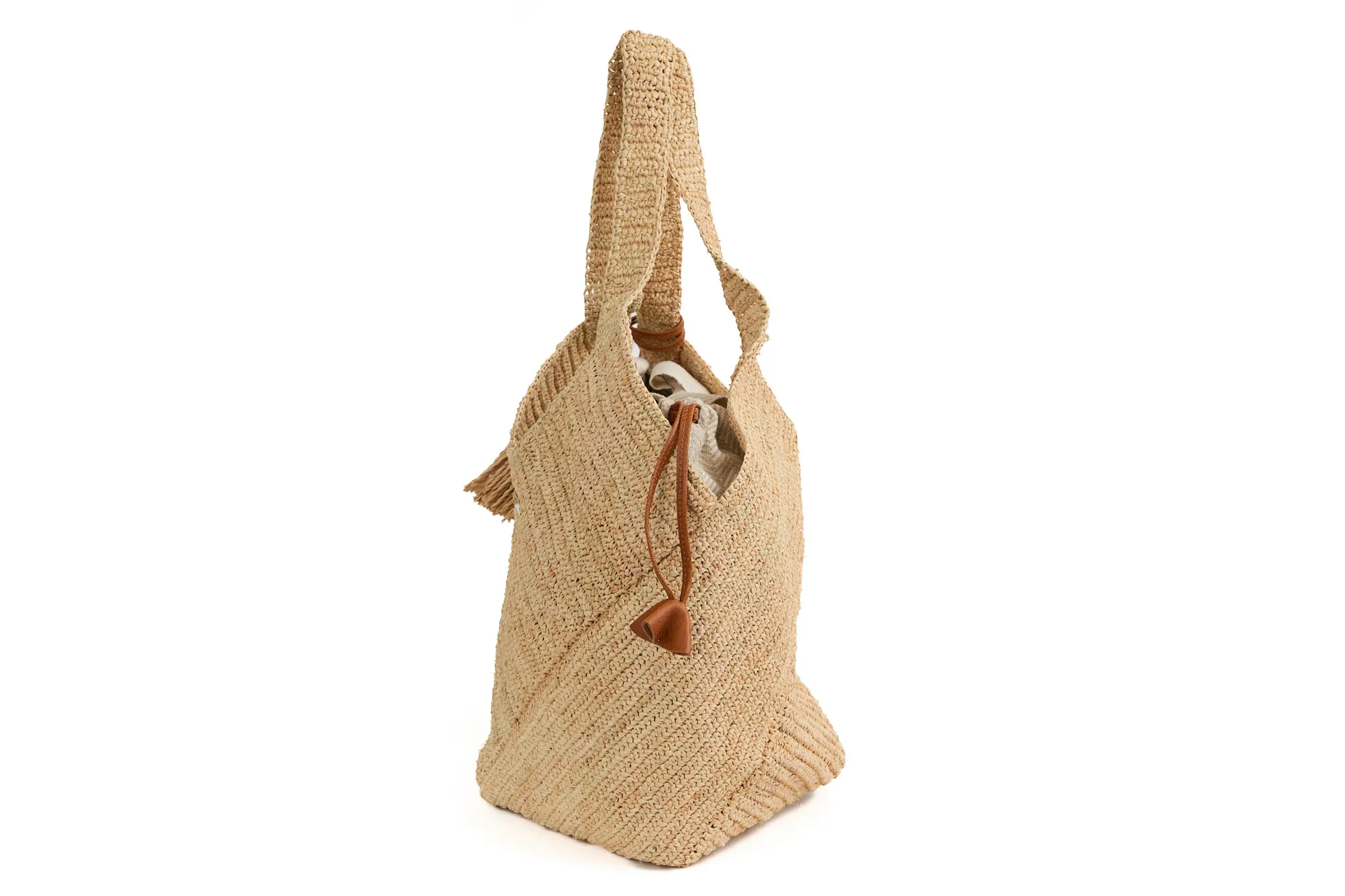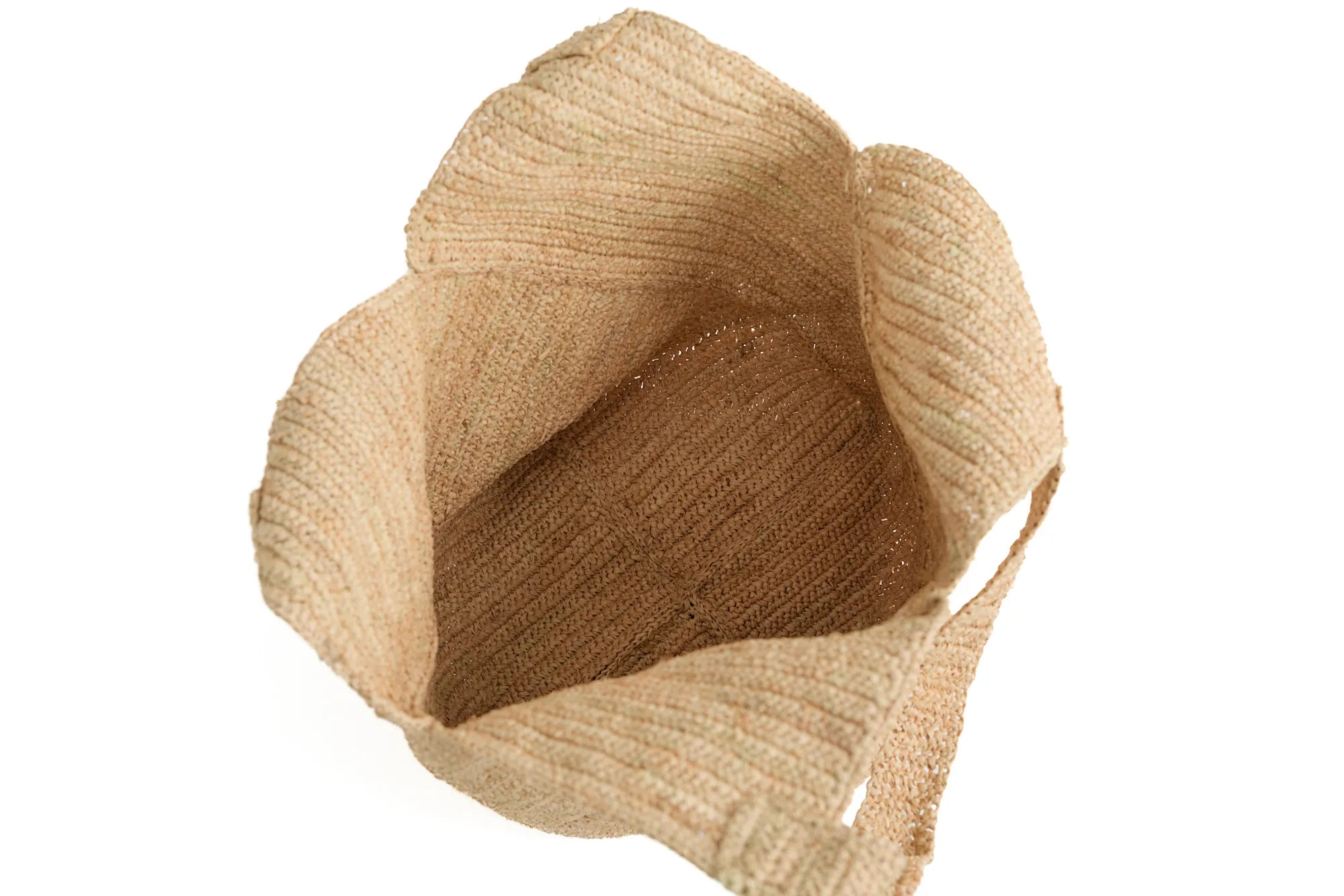 伊語でバカンスを意味する「Ferie」。 マダガスカル産ラフィアを、帯状に丁寧に編み立てたものを4枚編み合わせています。 直角の角を4点合わせた底面から胴にかけて、45度で螺旋状に立ち上がる展開図のような立体構造は、シンプルなコマ編みが大きなバイアス柄のように映り、視覚的にも楽しい印象に。 内巾着がセットになっており、旅先での2ndバッグとして、出先で荷物が増えてしまったとき、第2のバッグとして活躍します。 軽快さと優雅さを兼ね備えた「Ferie」、日常のお出かけはもちろん、喧騒から離れて心を解放する特別なバカンスのひとときを彩るシリーズです。