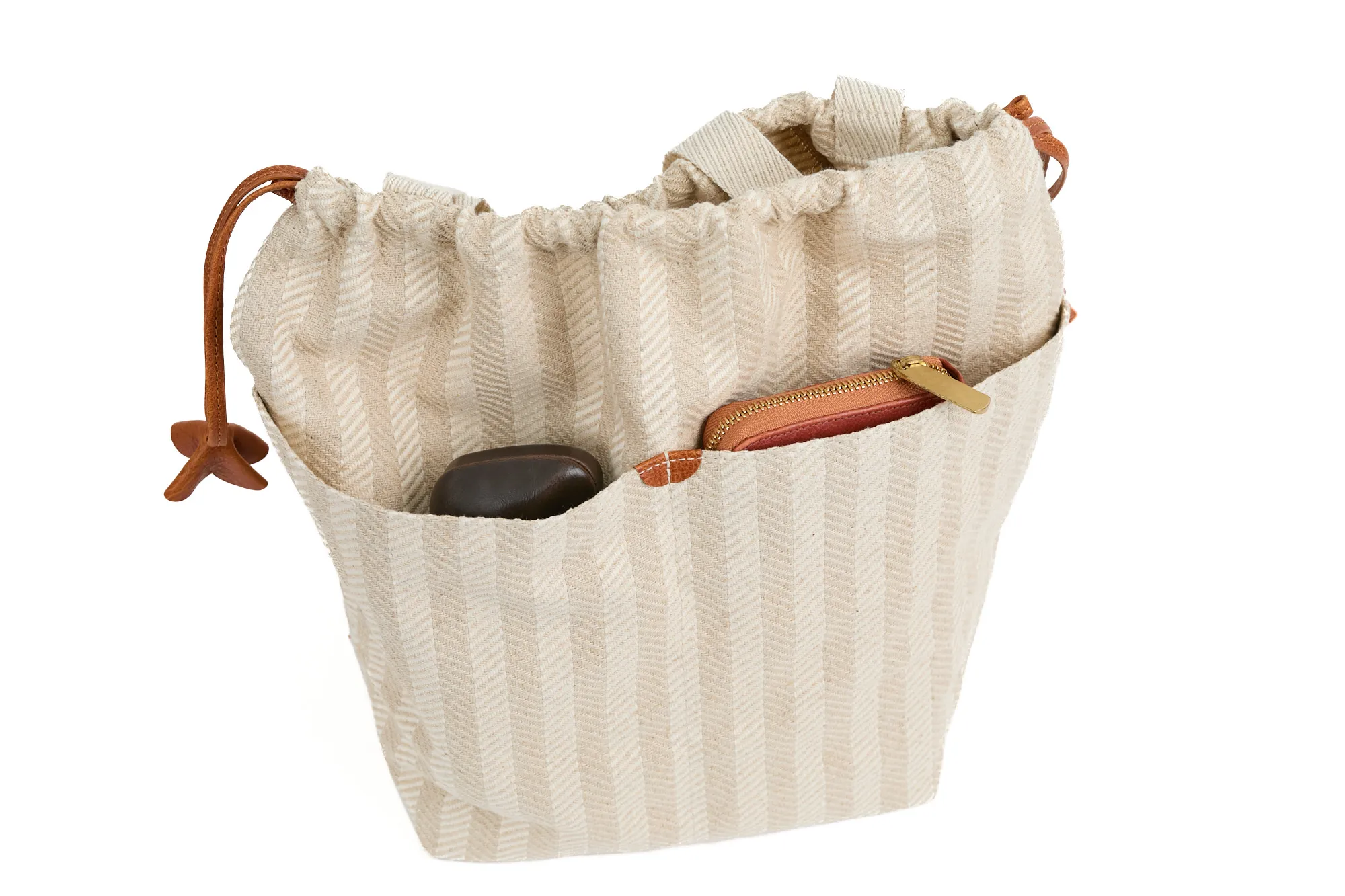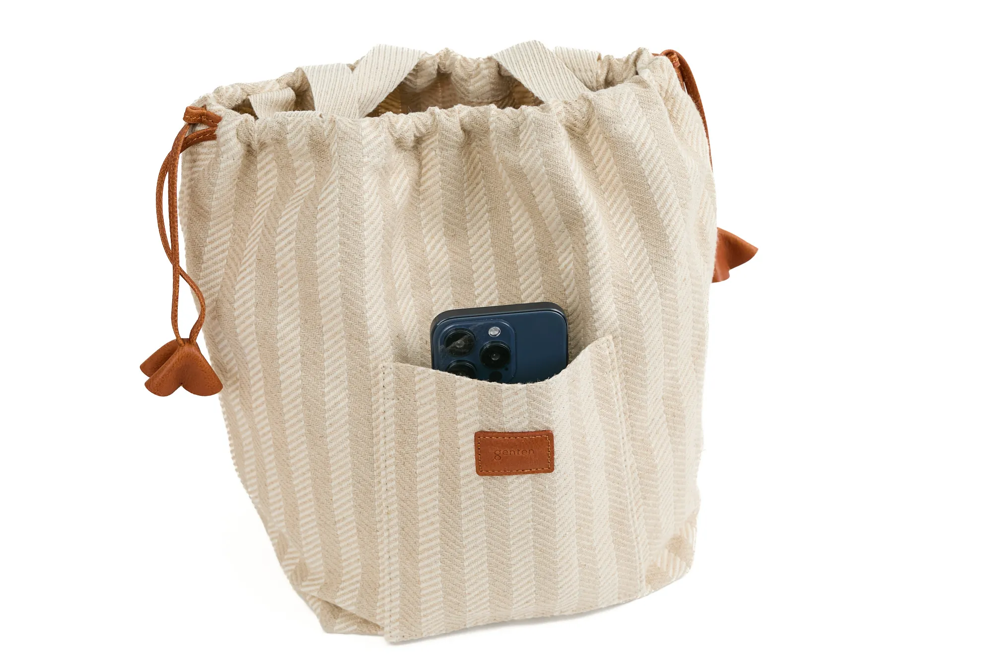 1.ラフィアオンリー 2.巾着をセットして3層のバッグとして 3.内巾着単体のバッグとしての3wayバッグ 内巾着にはそれぞれ綿麻テープハンドルがついており、巾着自体バッグとして使用可。 巾着のスピンドルエンドがラフィアの両サイドに引っかかるようにしているので、巾着を絞らずに開いたままでもOK。 内巾着には前後ポケット付き、巾着を絞れば防犯性も◎ 底マチをしっかりとっているので、見た目以上の収納力。
