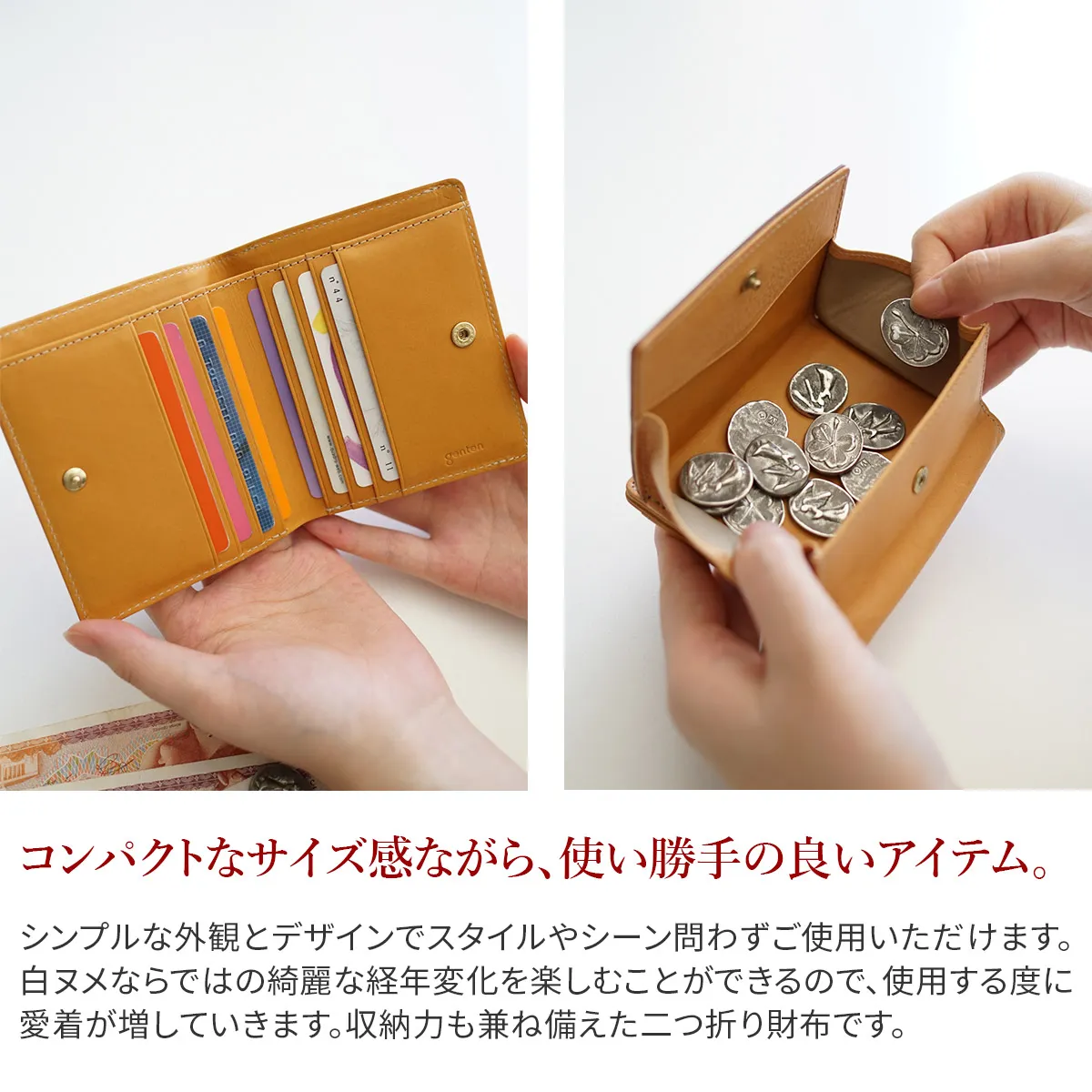 完全な無染色の白ヌメならではの、“綺麗な経年変化”を、存分にお楽しみいただけるシリーズ。 本革の証である、キズ、シミもそのまま活かし、あるがままの革の風合いを引き立たせるよう、ミニマムかつシンプルなフォルムとデザインにまとめました。 良質なイタリアトスカーナ産の革ならではの、奥深いエイジングを存分に楽しめるやさしいヌメ色でありながらも、急な雨や水濡れでも安心して使えるところもポイントです。 《素材の特性》フィレンツェトスカーナのタンナーで鞣されたダブルショルダーを使用。 cuoioのヌメ革は、水が付いてもしばらくは染みこまないため焦らずに拭き取ることができます。 水染みが残りにくいため、白ヌメ革を普段使いに気兼ねなくお楽しみいただけます。 キズやムラも含め、牛革本来の自然な風合いをそのまま取り込んでいます。使用頻度と日焼け等にあわせ、より本革ならではの深いエイジングの魅力を高めてくれます。 コンパクトでエイジングをお楽しみいただける小銭入れ付き二つ折り財布。 小銭入れは、BOX型なので、視認性が高く出し入れしやすい仕様となっています。 見た目以上の収納が可能な逸品です。