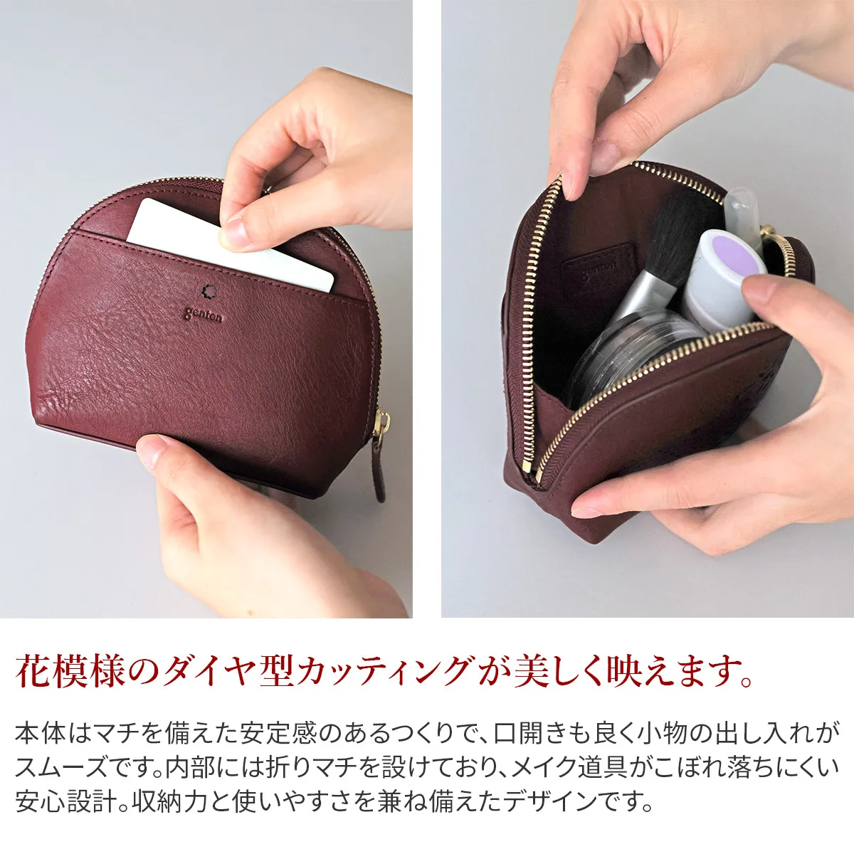 gentenを代表する素材、イタリア、バダラッシ・カルロ社のミネルヴァボックス。確かな素材の良さに加え、使い込むほどに艶やかな経年変化を楽しめます。切り目、コバのふのり磨き、焼きねん、カッティング、ハンドワーク、そしてミシンワークなどゲンテンのモノづくりの魅力が沢山詰まったシリーズです。 使うほどに深みのある美しい色艶が増す、上質なミネルヴァボックスで仕立てたポーチ。しっかりとした底マチにより安定感のある佇まいを保ち、メイク道具や小物をすっきりと収納できます。外側には便利なポケットを備え、機能性にも優れたデザイン。上質な素材感と実用性を兼ね備えた、大人のライフスタイルに寄り添う逸品です。