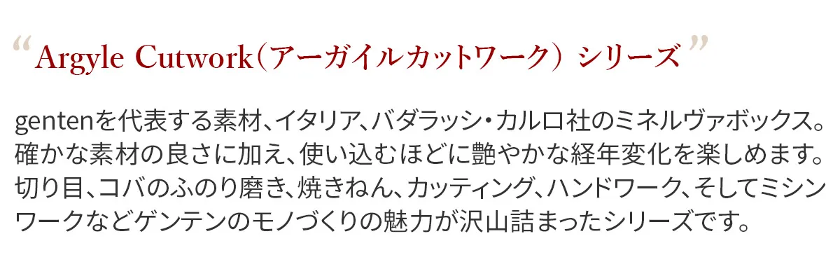 gentenを代表する素材、イタリア、バダラッシ・カルロ社のミネルヴァボックス。確かな素材の良さに加え、使い込むほどに艶やかな経年変化を楽しめます。切り目、コバのふのり磨き、焼きねん、カッティング、ハンドワーク、そしてミシンワークなどゲンテンのモノづくりの魅力が沢山詰まったシリーズです。 使うほどに深みのある美しい色艶が増す、上質なミネルヴァボックスで仕立てたキーリング。高級感を引き立てるゴールド金具が、日常の小物に華やかさをプラスします。バッグやベルトループに簡単に取り付けられるカラビナ仕様。毎日の持ち物に上質なアクセントを添えるアイテムです。