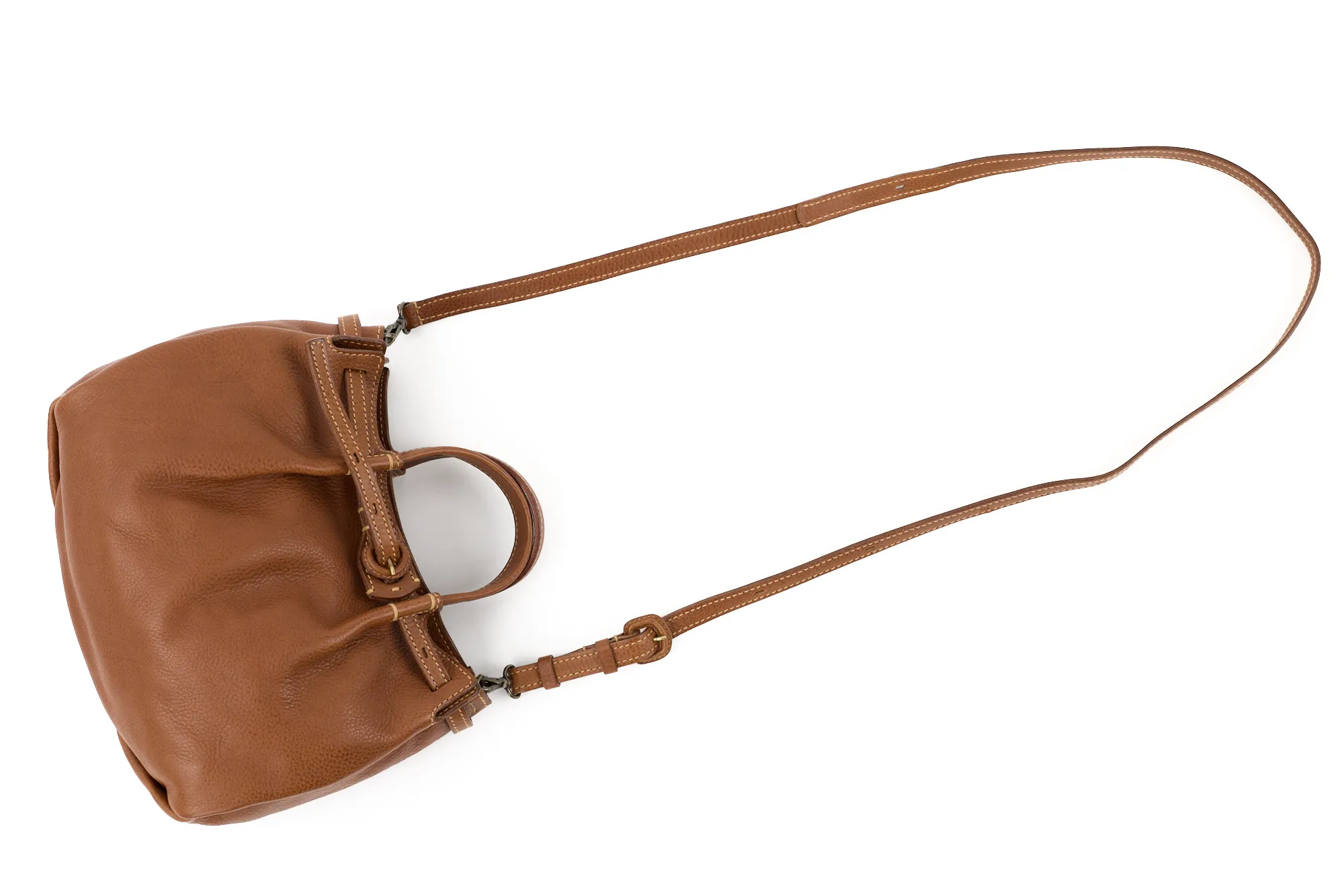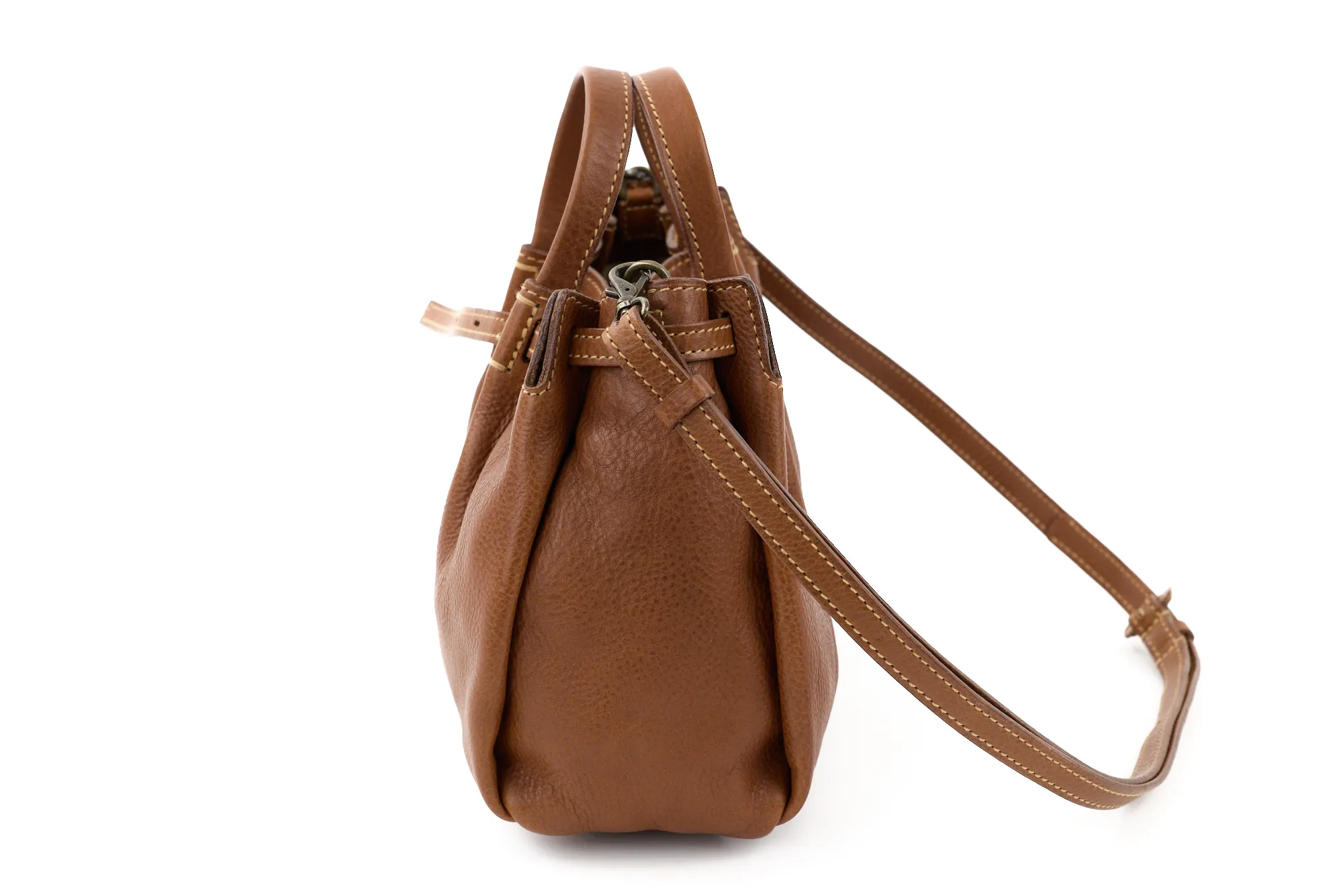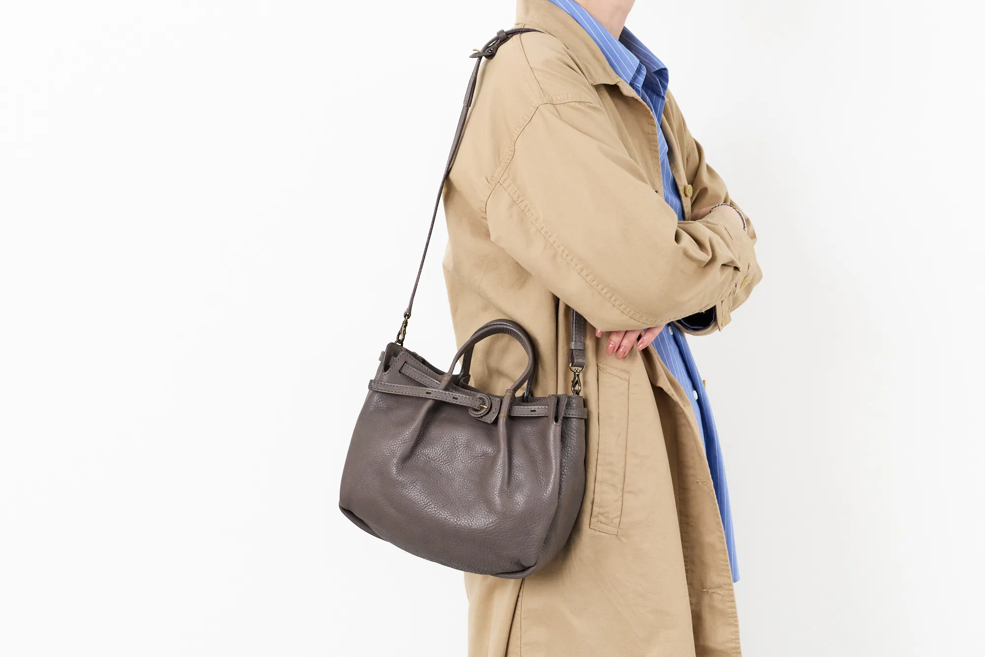 イタリア産ショルダーならではのオイルアップの味の良さがありながら、比較的ドライでなおかつ軽さ、ソフトさもある素材です。 このオリジナルのソフトレザーの軽さや魅力を引き出せるよう、見た目での印象も軽妙でやさしくデザインされています。内装も軽さに重点をおきつつ物納まりががよい設計となっています。 あえて尾錠を通さずに剣先をたらすベルトクロージャーやヘリのアコーディオンカット、しなやかな張りを持たせた平手が、全体のリラックスしたなかに“きちんと感”をプラス。コーデ幅が広がります。