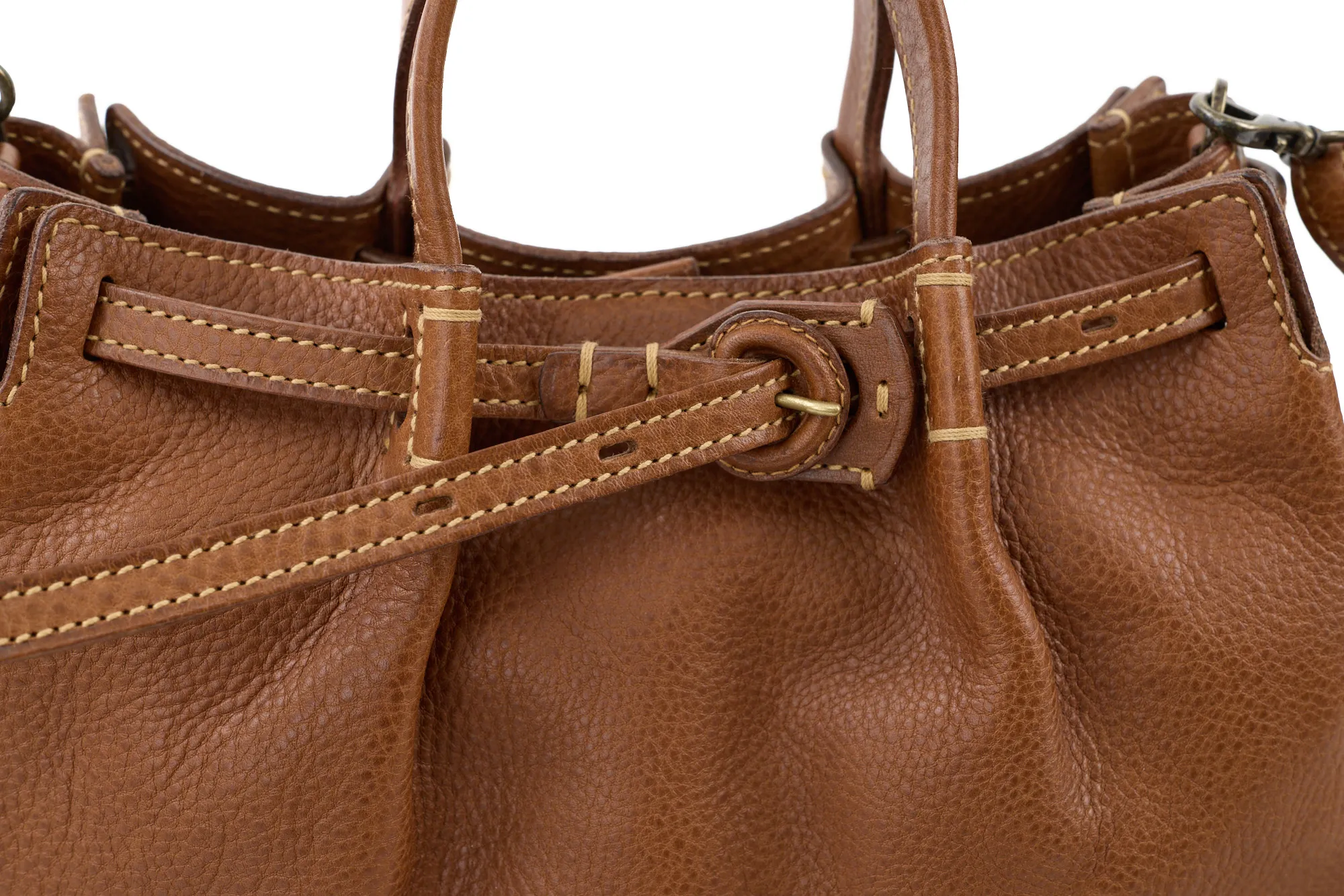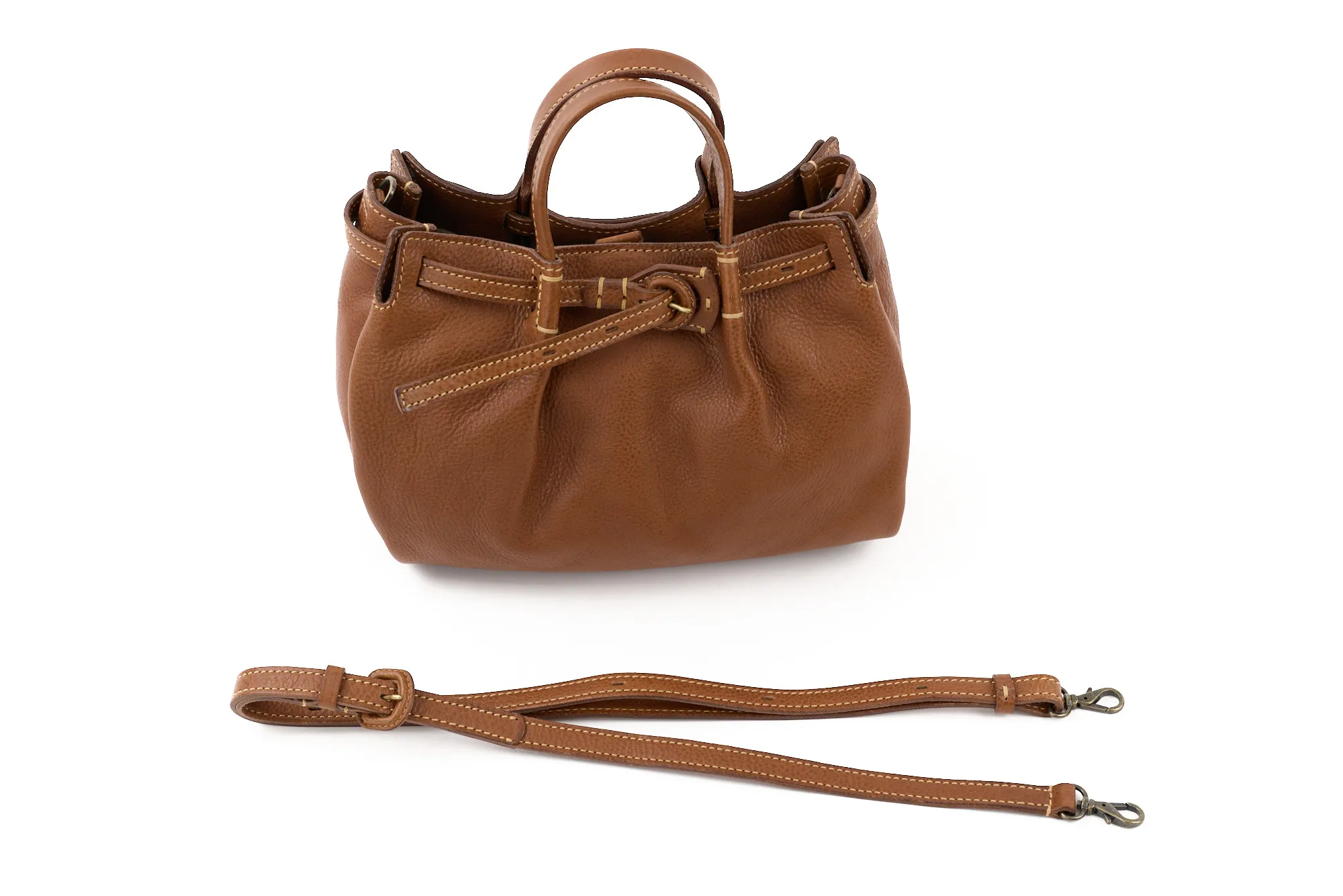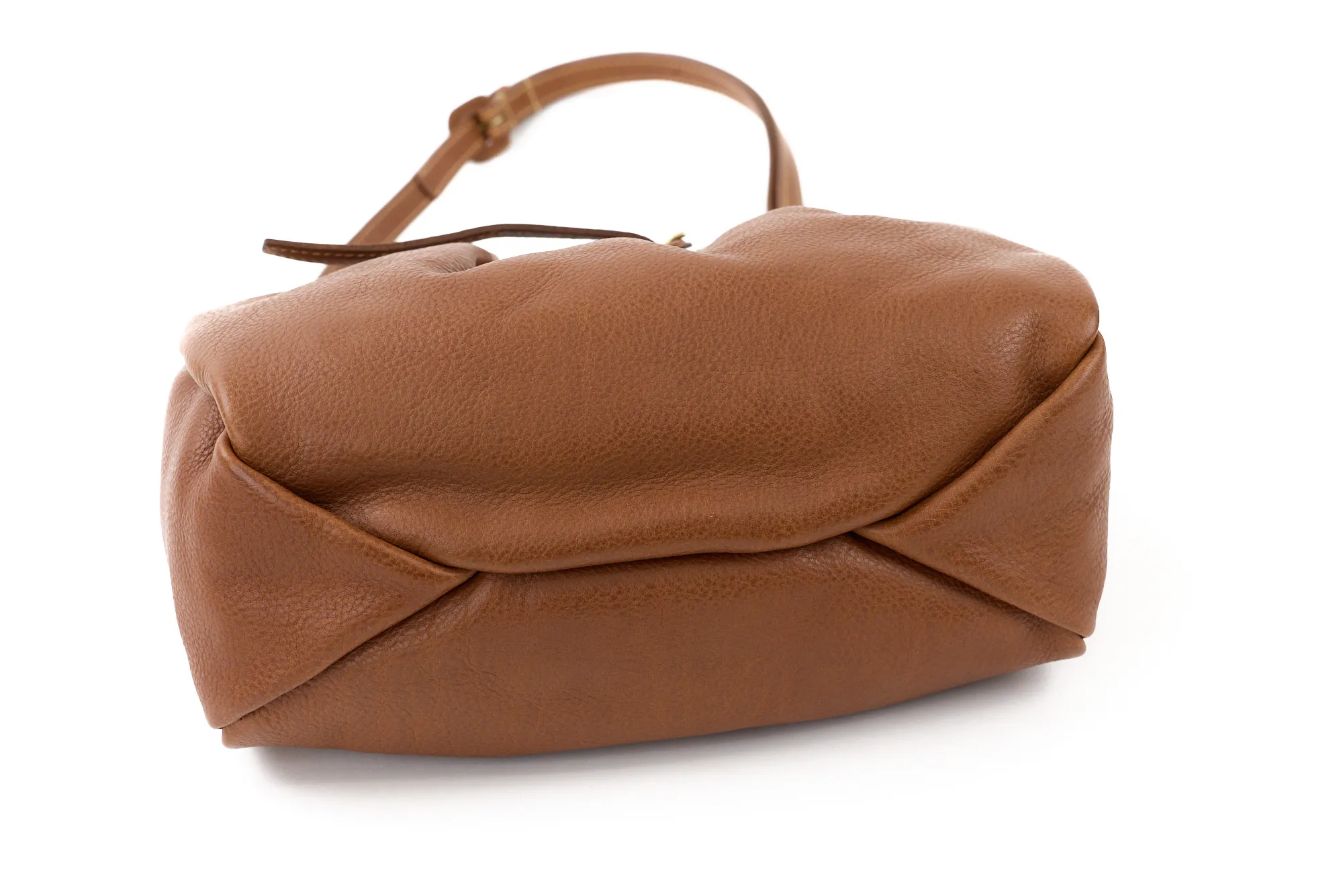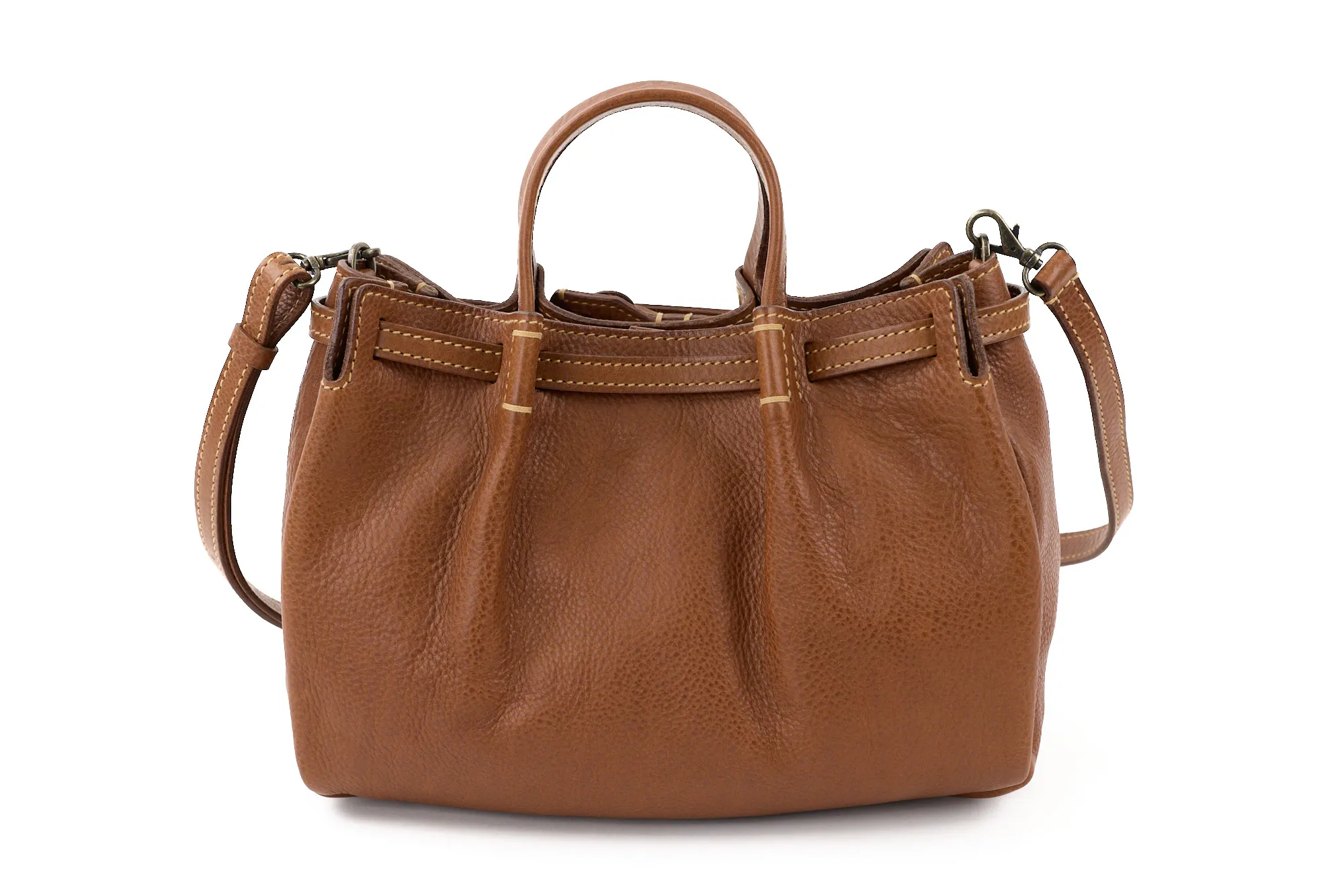 イタリア産ショルダーならではのオイルアップの味の良さがありながら、比較的ドライでなおかつ軽さ、ソフトさもある素材です。 このオリジナルのソフトレザーの軽さや魅力を引き出せるよう、見た目での印象も軽妙でやさしくデザインされています。内装も軽さに重点をおきつつ物納まりががよい設計となっています。 あえて尾錠を通さずに剣先をたらすベルトクロージャーやヘリのアコーディオンカット、しなやかな張りを持たせた平手が、全体のリラックスしたなかに“きちんと感”をプラス。コーデ幅が広がります。