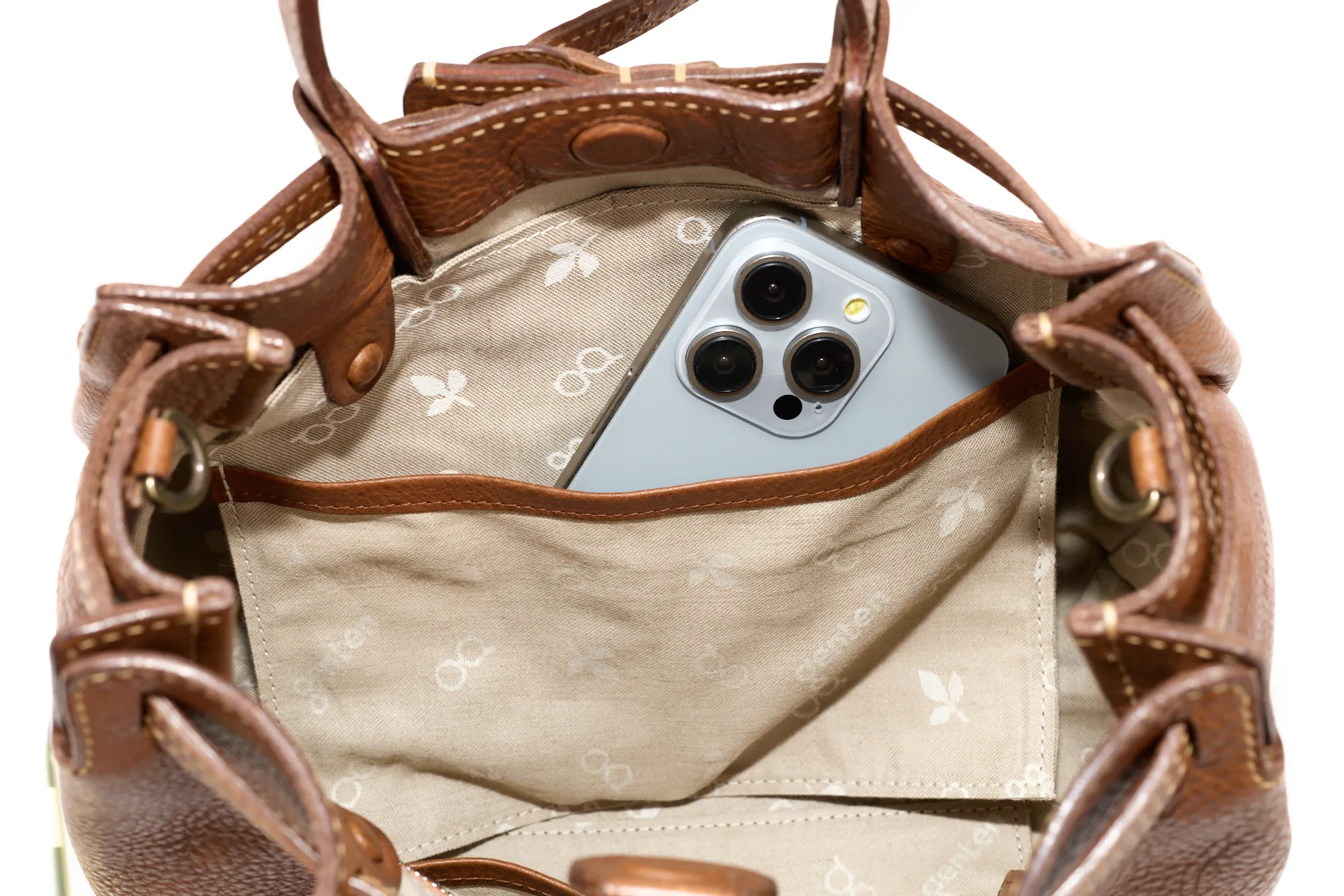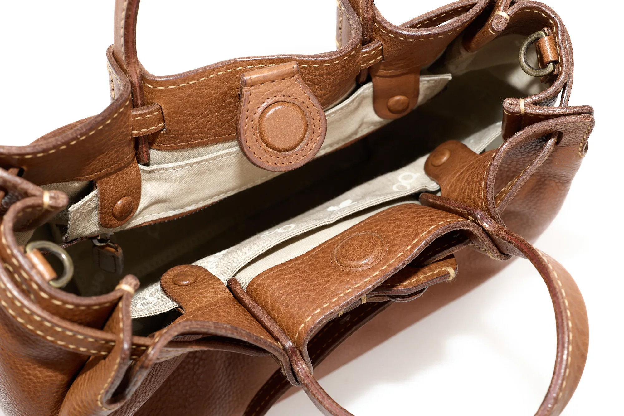 オンオフ問わず、肩肘張らずに気軽に持つことができる“リラックス感”あるデザインです。 あおり蓋は、使用しない際は背面側つりポケット裏へ落として収納可能です。 口前のアコーディオンカットが自然と内側に収縮するため、内容物が覗かれにくい仕様となっています。