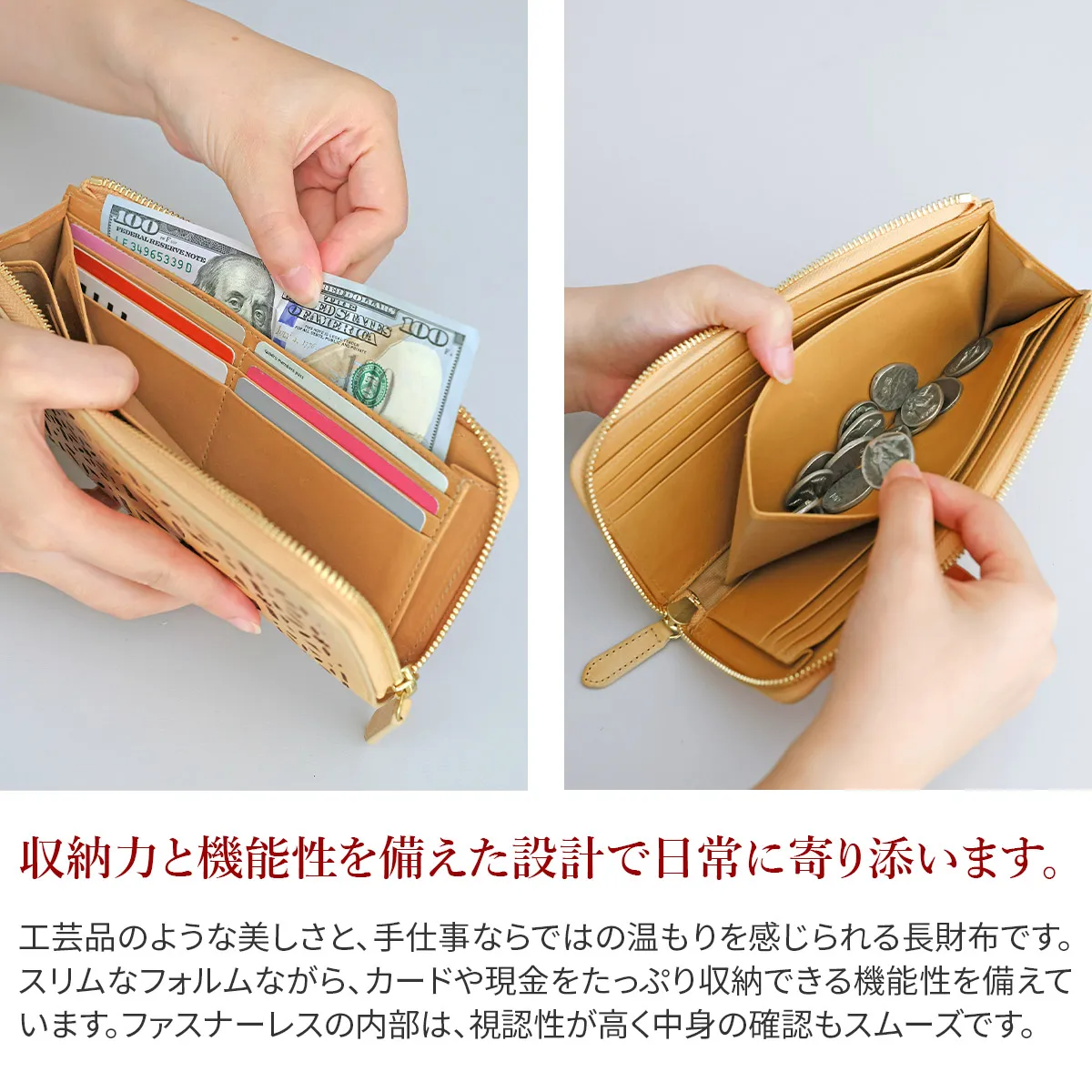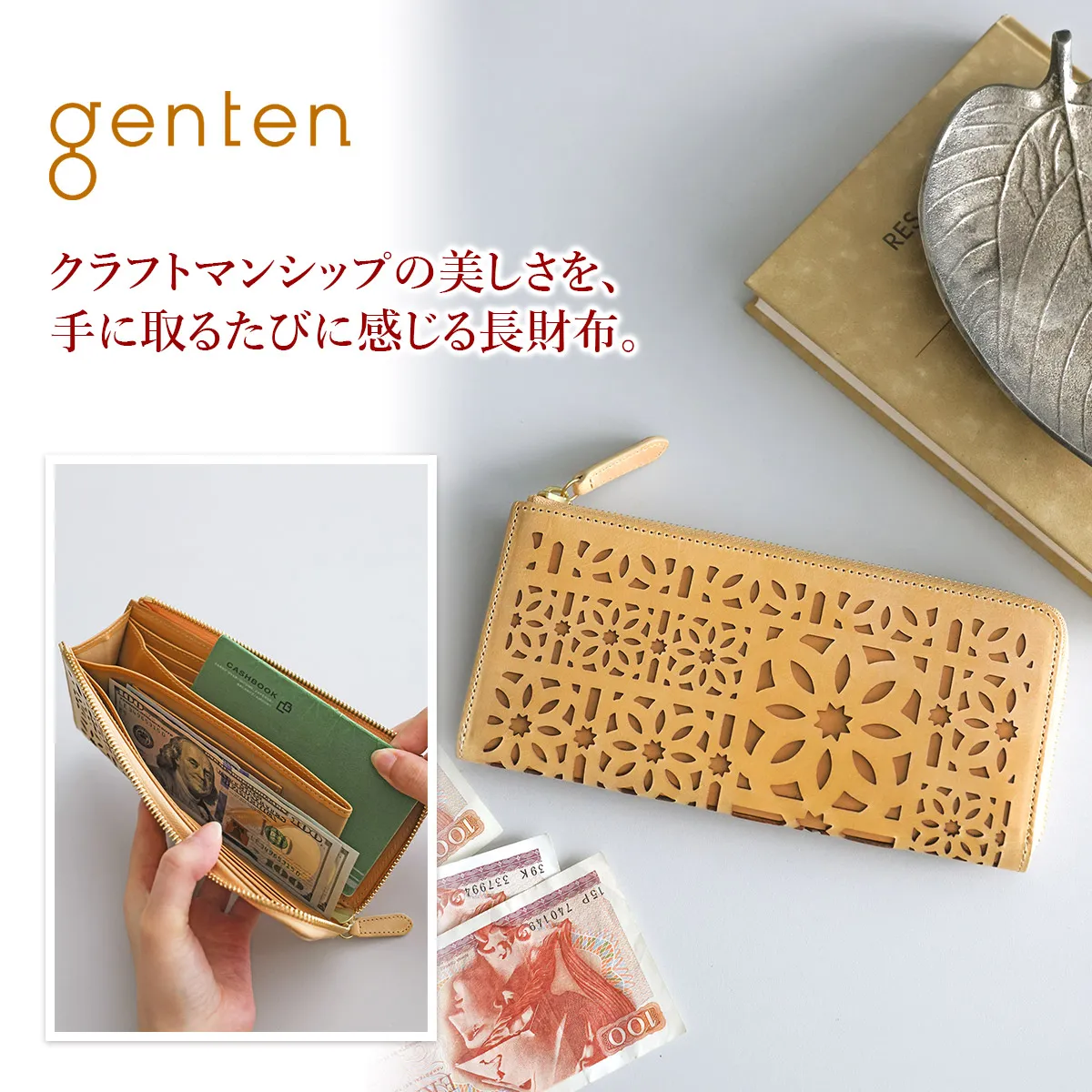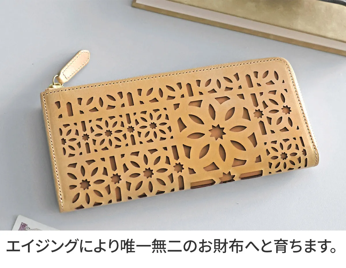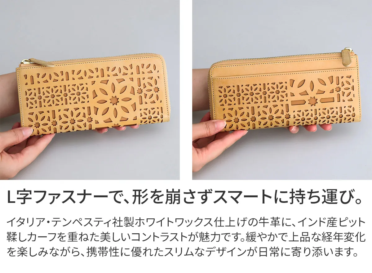 gentenのアイコンのカットワークをレーザーカットで精巧に抜いた、マルチカットワークシリーズ。イタリアのホワイトワックス仕上げの革にアイコンのカットワークを施すことで、洗練された上品なイメージに仕上がっています。 〈素材の特性・メリット〉 鞣し加工:イタリア鞣しの種類:タンニン鞣し、ホワイトワックス仕上げ イタリアのテンペスティ社の植物タンニン鞣し(バケッタ製法)の牛革を使用。銀面をバフがけしたスムースな表面に、ホワイトワックスを数回塗布して仕上げたショルダー革です。内装革:インドのピット鞣しのカーフを使用、軽量できめ細やかな質感をお楽しみください。 同系色のレザーを丁寧に重ね合わせることで、控えめながらも美しいコントラストを演出。スリムな見た目ながら、計17ヶ所のカードポケットを備えた高機能な長財布。日常使いに必要なカード類をすっきり整理でき、使い勝手の良さが魅力です。