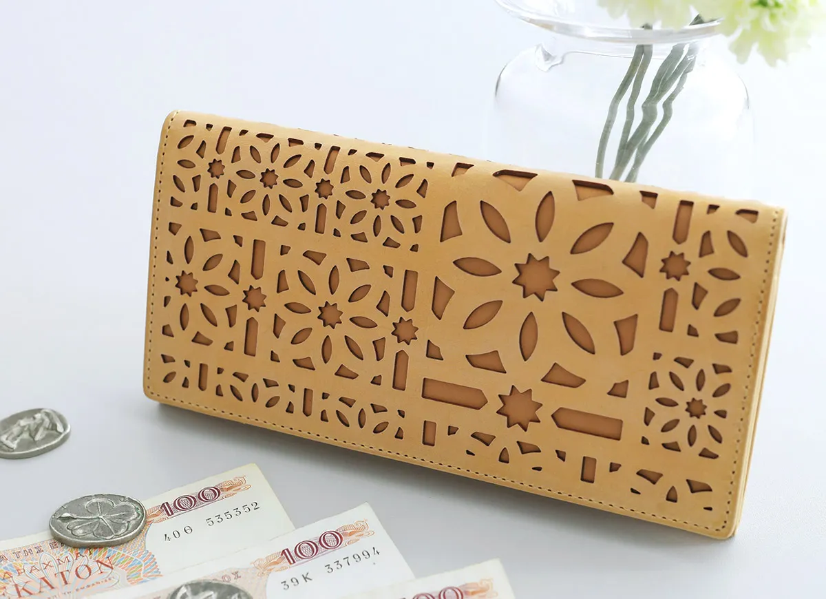 gentenのアイコンのカットワークをレーザーカットで精巧に抜いた、マルチカットワークシリーズ。イタリアのホワイトワックス仕上げの革にアイコンのカットワークを施すことで、洗練された上品なイメージに仕上がっています。 〈素材の特性・メリット〉 鞣し加工:イタリア鞣しの種類:タンニン鞣し、ホワイトワックス仕上げ イタリアのテンペスティ社の植物タンニン鞣し(バケッタ製法)の牛革を使用。銀面をバフがけしたスムースな表面に、ホワイトワックスを数回塗布して仕上げたショルダー革です。内装革:インドのピット鞣しのカーフを使用、軽量できめ細やかな質感をお楽しみください。 同系色のレザーを丁寧に重ね合わせることで、控えめながらも美しいコントラストを演出。スナップボタンによるワンタッチ開閉で大きく開き、ひと目で中身を見渡せる使いやすい設計。レシートや通帳もすっきり収まる大きめポケットを備え、日常使いに便利な収納力を確保しています。さらに、独立型の小銭入れには片マチを施し、取り出しやすさと収納力を両立。細部まで配慮された機能美が光る長財布です。