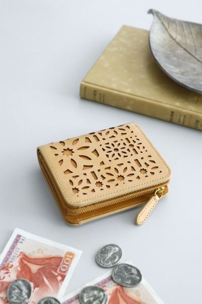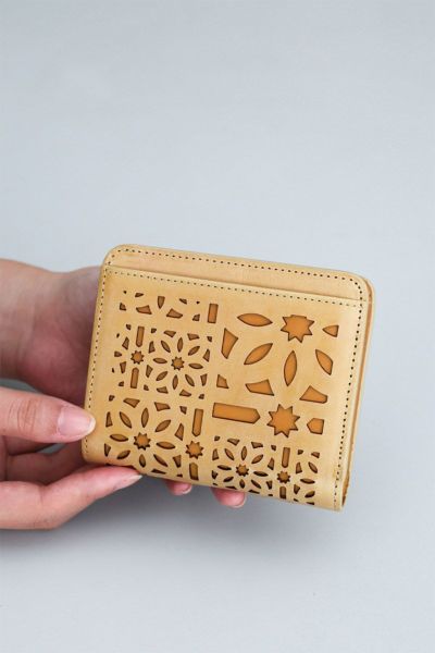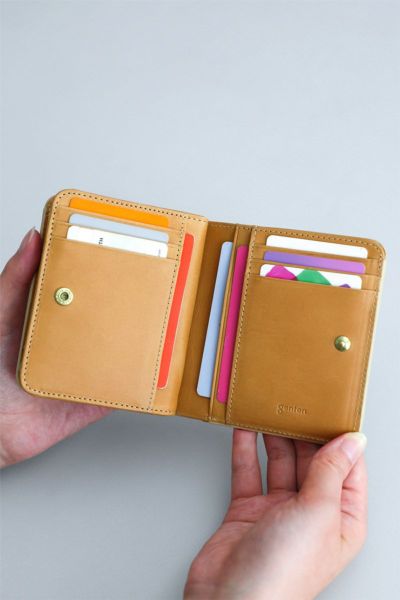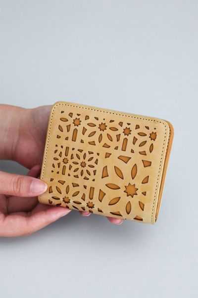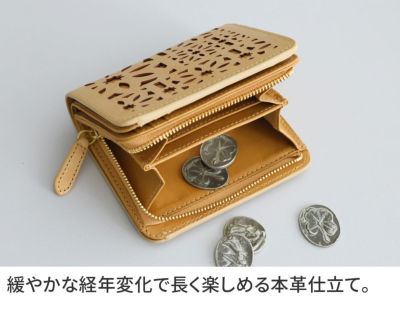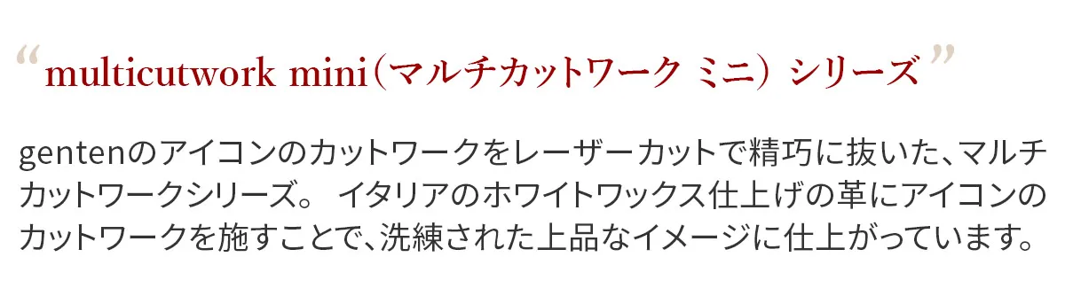 gentenのアイコンのカットワークをレーザーカットで精巧に抜いた、マルチカットワークシリーズ。イタリアのホワイトワックス仕上げの革にアイコンのカットワークを施すことで、洗練された上品なイメージに仕上がっています。 〈素材の特性・メリット〉 鞣し加工:イタリア鞣しの種類:タンニン鞣し、ホワイトワックス仕上げ イタリアのテンペスティ社の植物タンニン鞣し(バケッタ製法)の牛革を使用。銀面をバフがけしたスムースな表面に、ホワイトワックスを数回塗布して仕上げたショルダー革です。内装革:インドのピット鞣しのカーフを使用、軽量できめ細やかな質感をお楽しみください。 同系色のレザーを丁寧に重ね合わせることで、控えめながらも美しいコントラストを演出。コンパクトながら収納力に優れた二つ折りタイプ。手にしっくりと馴染むサイズ感で、日常使いにぴったりのアイテムです。スナップボタンでスムーズな開閉ができ、開くと計9ヶ所のカードポケットを一望できます。お札入れと小銭入れは仕切り付きで、中身の仕分けも行え、快適な使い心地です。