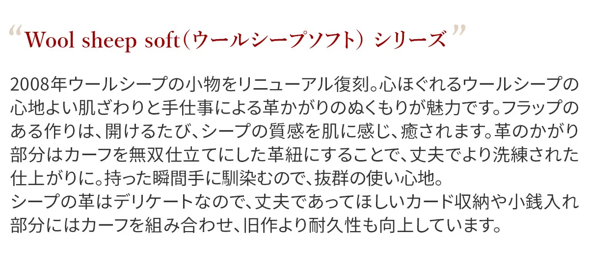 2008年ウールシープの小物をリニューアル復刻。心ほぐれるウールシープの心地よい肌ざわりと手仕事による革かがりのぬくもりが魅力です。フラップのある作りは、開けるたび、シープの質感を肌に感じ、癒されます。革のかがり部分はカーフを無双仕立てにした革紐にすることで、丈夫でより洗練された仕上がりに。持った瞬間手に馴染むので、抜群の使い心地。シープの革はデリケートなので、丈夫であってほしいカード収納や小銭入れ部分にはカーフを組み合わせ、旧作より耐久性も向上しています。 〈素材の特性・メリット〉 鞣しの種類:タンニン鞣し 柔らかなウールシープのタッチ感、タンニン鞣しの為、使えば使うほど色が深まり、ツヤが現れます。かがり部分のカーフは無双仕立ての為、ヘリが毛羽立つことなく美しいツヤの経年変化をお楽しみいただけます。 ウールシープはデリケートな革なので、強い摩擦が続くと銀面が擦れる事があります。擦れが気になった時は、デリケートクリームを少量を布にとり、優しく馴染ませると目立たなくなります。シープの革にクリーム類をたくさん塗ってしまうと革の表面が少し硬くなることがありますので、少しずつ様子を見ながらケアをおこなってください。丁寧にお使いいただくことで長持ちします。 ふっくらと柔らかい羊革で仕立てられた、手に心地よく馴染むお財布です。メイン収納は見開きタイプでカードが一目で確認でき、お札入れ・小銭入れには仕切りを設けた整理しやすい設計です。スムーズに目的のものへアクセスできるため、お会計もスマートに対応できます。シンプルながら機能的なデザインで、持つ人のライフスタイルに寄り添う逸品です。