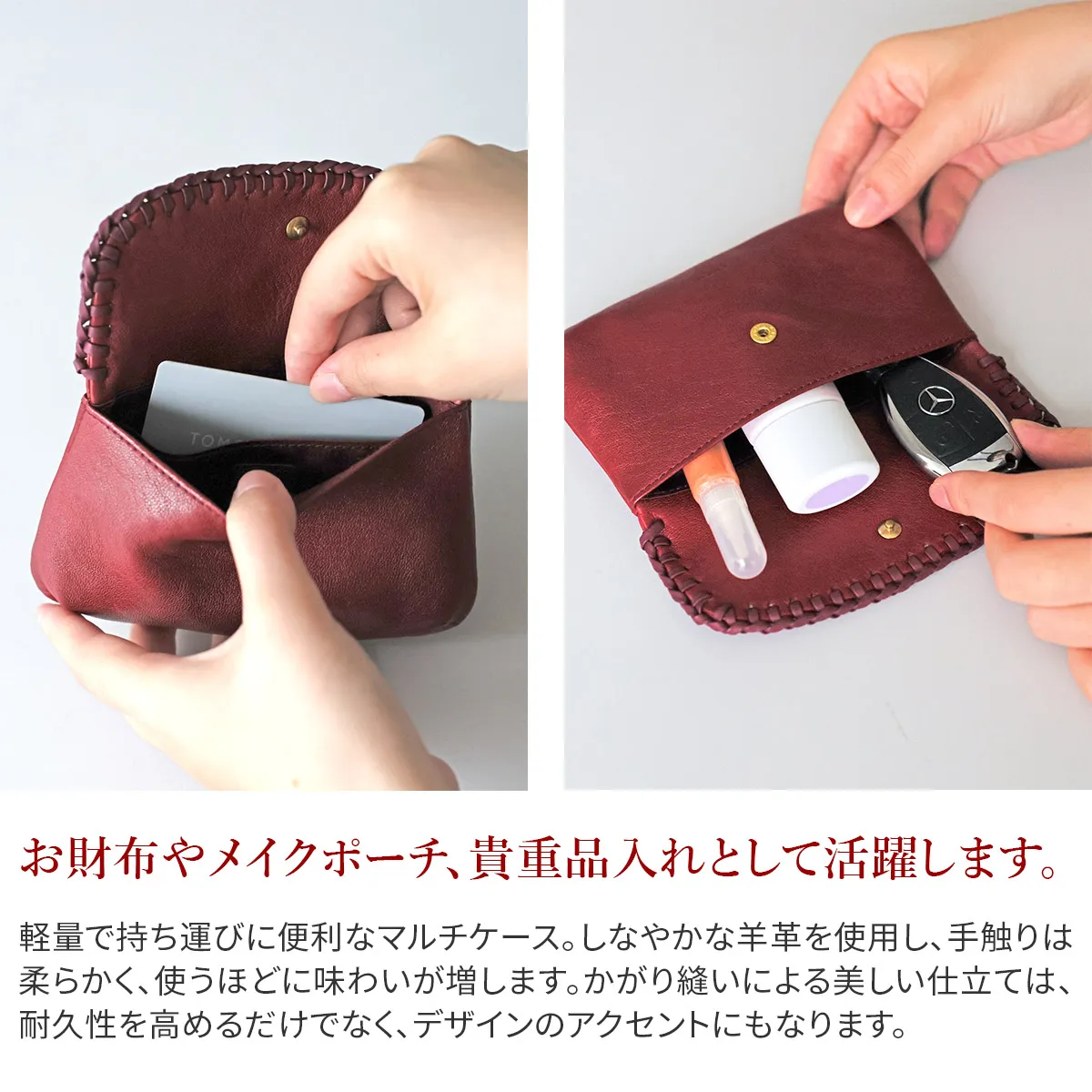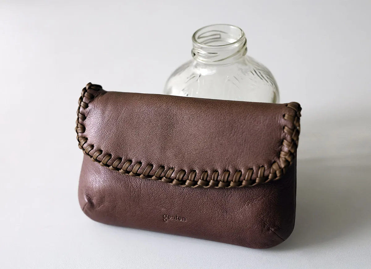2008年ウールシープの小物をリニューアル復刻。心ほぐれるウールシープの心地よい肌ざわりと手仕事による革かがりのぬくもりが魅力です。フラップのある作りは、開けるたび、シープの質感を肌に感じ、癒されます。革のかがり部分はカーフを無双仕立てにした革紐にすることで、丈夫でより洗練された仕上がりに。持った瞬間手に馴染むので、抜群の使い心地。シープの革はデリケートなので、丈夫であってほしいカード収納や小銭入れ部分にはカーフを組み合わせ、旧作より耐久性も向上しています。 〈素材の特性・メリット〉 鞣しの種類:タンニン鞣し 柔らかなウールシープのタッチ感、タンニン鞣しの為、使えば使うほど色が深まり、ツヤが現れます。かがり部分のカーフは無双仕立ての為、ヘリが毛羽立つことなく美しいツヤの経年変化をお楽しみいただけます。 ウールシープはデリケートな革なので、強い摩擦が続くと銀面が擦れる事があります。擦れが気になった時は、デリケートクリームを少量を布にとり、優しく馴染ませると目立たなくなります。シープの革にクリーム類をたくさん塗ってしまうと革の表面が少し硬くなることがありますので、少しずつ様子を見ながらケアをおこなってください。丁寧にお使いいただくことで長持ちします。 ふっくらと柔らかい質感で、使う程に風合いが増す羊革仕立てのポーチ。フラップデザインが印象的で、手仕事ならではの温もりのある仕上りに。メイクポーチや貴重品入れなど、マルチに活躍するアイテムとなっています。
