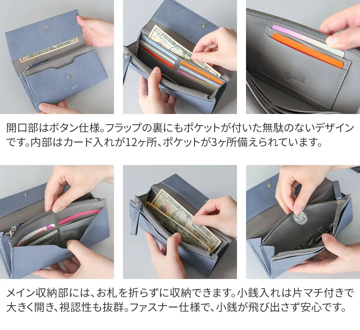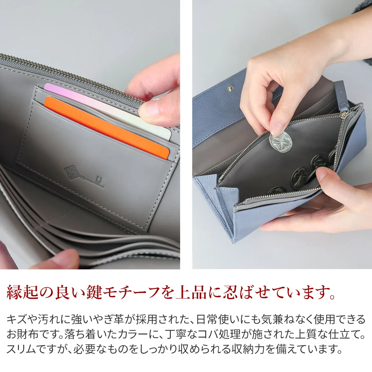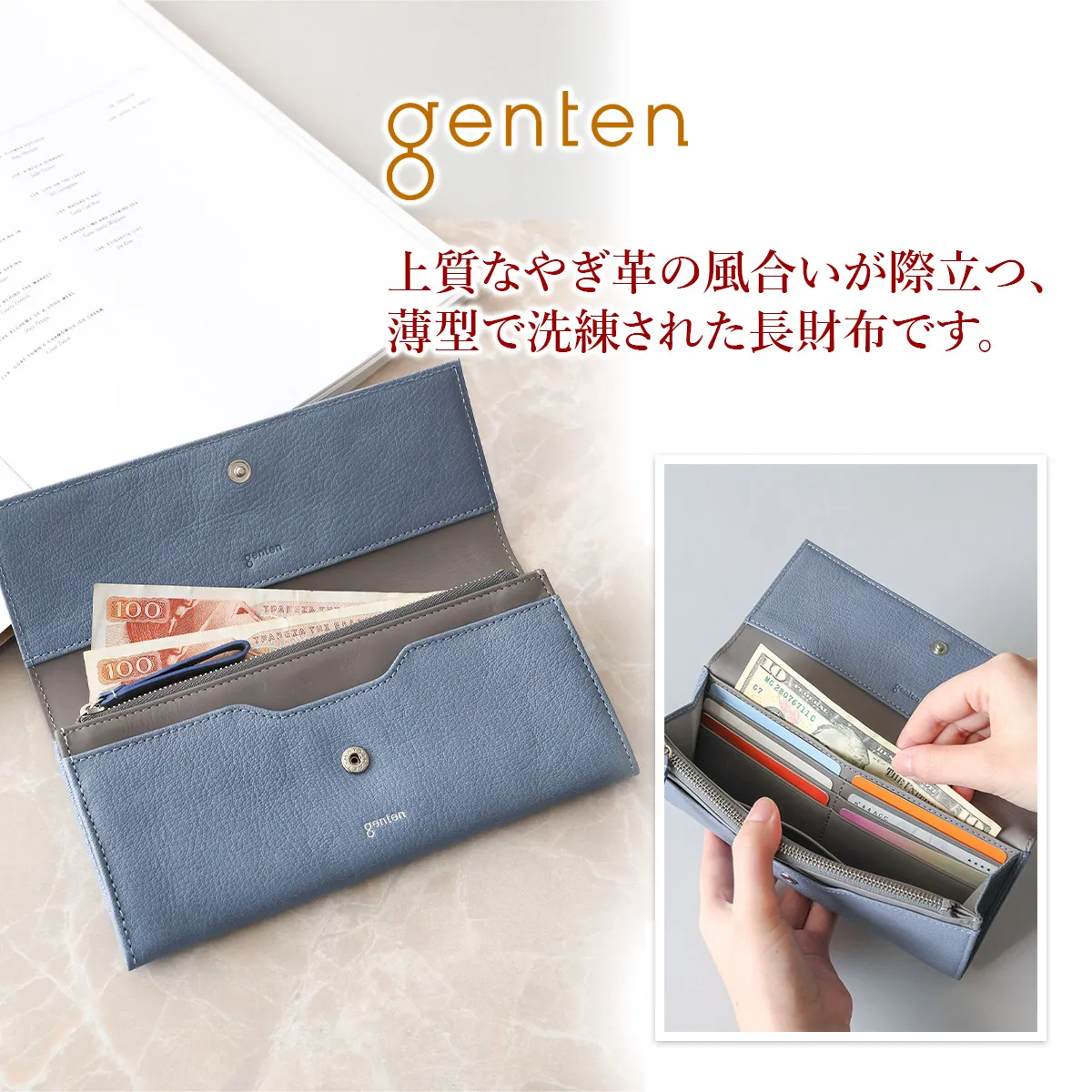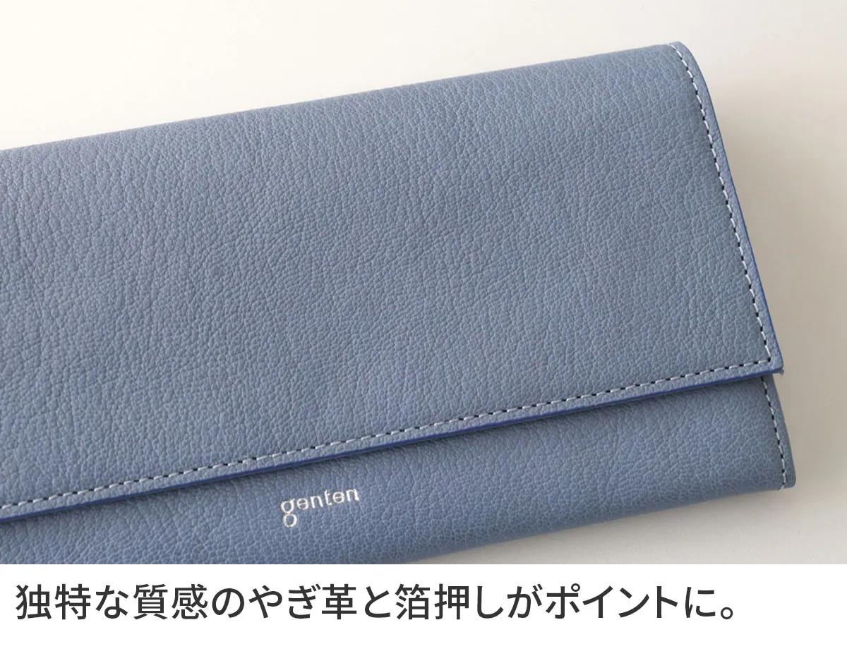 genten定番のフレスコの新色にラッキーモチーフをあしらったモルトフレスコ。内装には、カットワークをあしらった鍵のモチーフをさりげない位置に。鍵のモチーフには「家や財産を守る」「幸運の扉をひらく」「未来を切り開く」などのポジティブな意味が込められています。大人のカジュアルさと洗練さを両立できる色で、心を穏やかにしてくれます。 〈素材の特性・メリット〉 鞣しの種類:クロムフリー鞣し インドの肌理細やかな山羊革を使用。インドで繊維を縮めて染色をして仕上げてから、さらに日本で低温のアイロンをかけ、表面の地艶を出し上品に仕上げています。金属(クロム※)を含まない、鞣し剤によって鞣された革で、燃やした際にも環境に優しい鞣し方法です。鉱石を主体とした天然由来の成分で鞣しています。優れた分解性があり、好条件下では数カ月で生分解されます。銀面が強いため傷がつきにくく、水染みにも強く軽量なのも特徴。表面を微粒子顔料で仕上げているため、経年変化をあまりせずに、買った時の”色”を楽しめます。 スリムでかさばりにくく、バッグの中でも邪魔にならない長財布です。やぎ革特有の銀面が美しく、内装には滑らかなカーフレザーを合わせ、手に取るたび上質さを感じられる仕立てに。12枚のカードや現金をすっきり収納でき、日常使いにちょうど良い機能性を備えています。