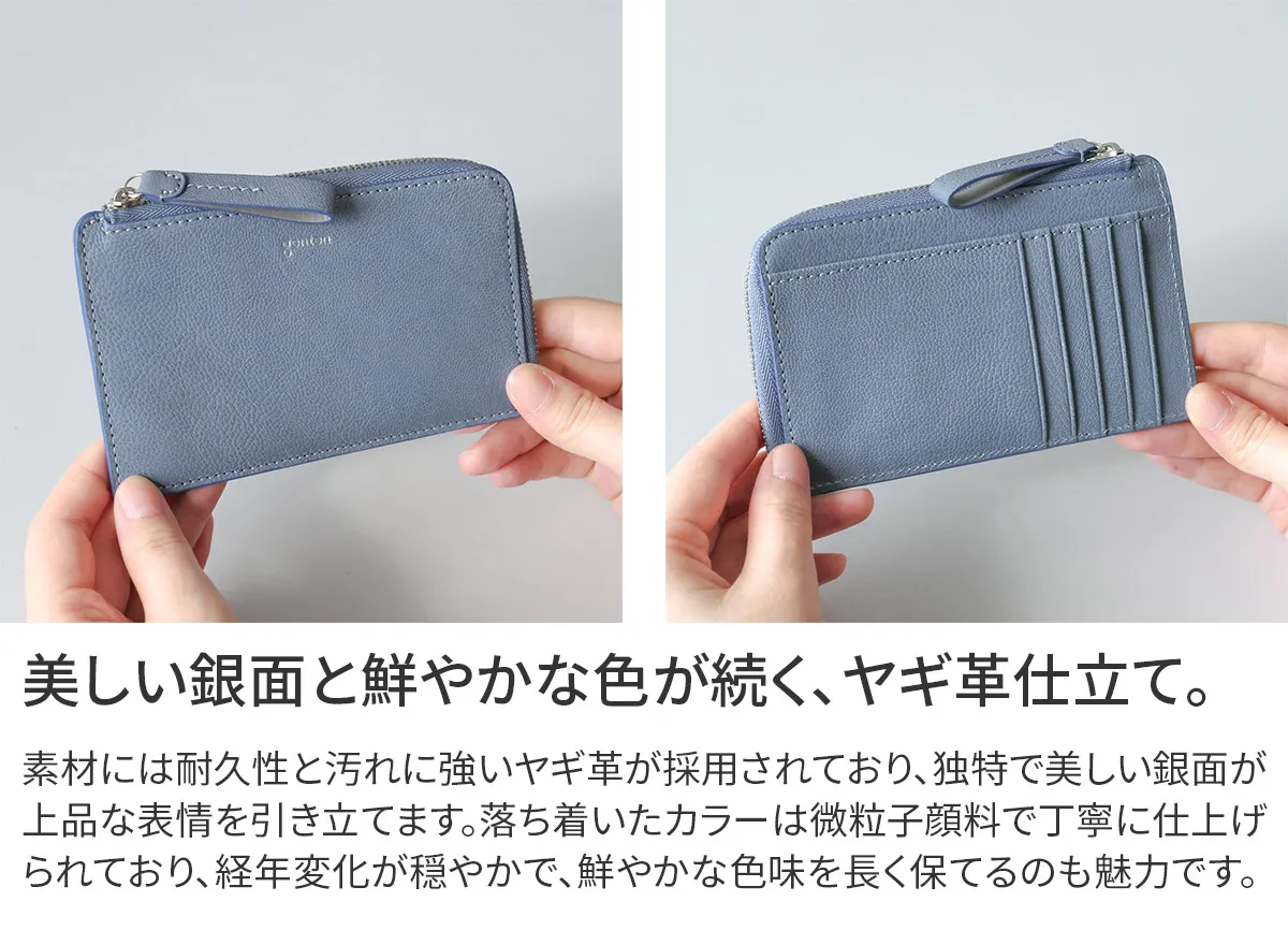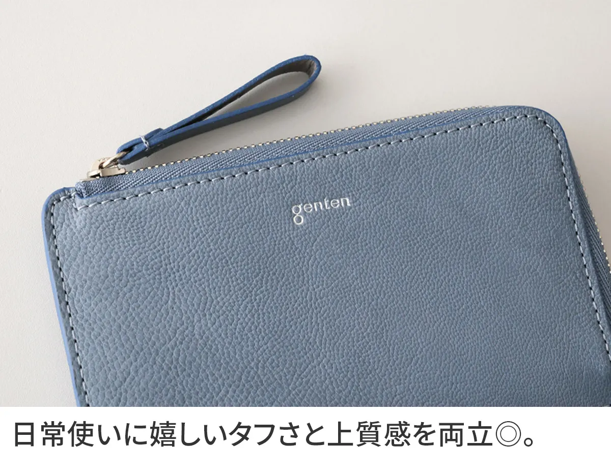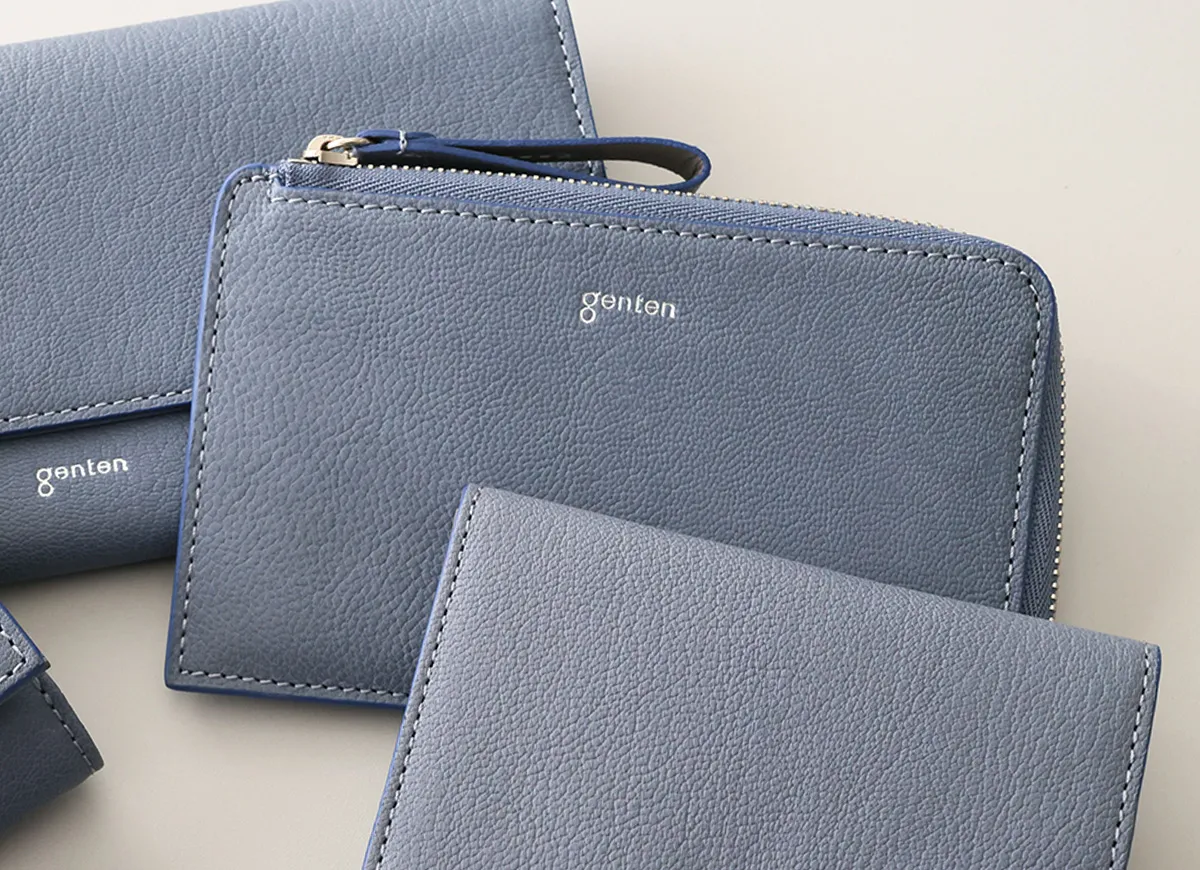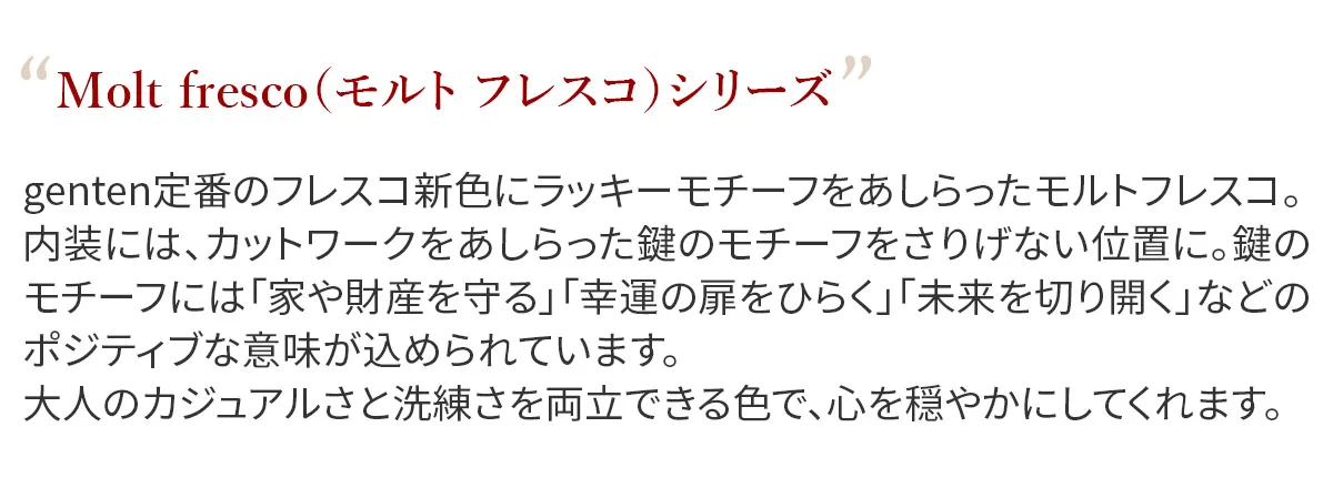 genten定番のフレスコの新色にラッキーモチーフをあしらったモルトフレスコ。内装には、カットワークをあしらった鍵のモチーフをさりげない位置に。鍵のモチーフには「家や財産を守る」「幸運の扉をひらく」「未来を切り開く」などのポジティブな意味が込められています。大人のカジュアルさと洗練さを両立できる色で、心を穏やかにしてくれます。 〈素材の特性・メリット〉 鞣しの種類:クロムフリー鞣し インドの肌理細やかな山羊革を使用。インドで繊維を縮めて染色をして仕上げてから、さらに日本で低温のアイロンをかけ、表面の地艶を出し上品に仕上げています。金属(クロム※)を含まない、鞣し剤によって鞣された革で、燃やした際にも環境に優しい鞣し方法です。鉱石を主体とした天然由来の成分で鞣しています。優れた分解性があり、好条件下では数カ月で生分解されます。銀面が強いため傷がつきにくく、水染みにも強く軽量なのも特徴。表面を微粒子顔料で仕上げているため、経年変化をあまりせずに、買った時の”色”を楽しめます。 スリムでかさばりにくく、ポケットにもすっきり収まるアイテムです。やぎ革特有の美しい銀面に、内装の滑らかなカーフレザーを合わせ、手に取るたび上質さを感じられる仕立てに。カードポケットを計8ヶ所備え、ミニマル派やキャッシュレス派にも嬉しい収納力です。