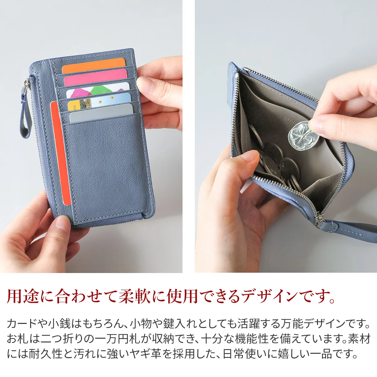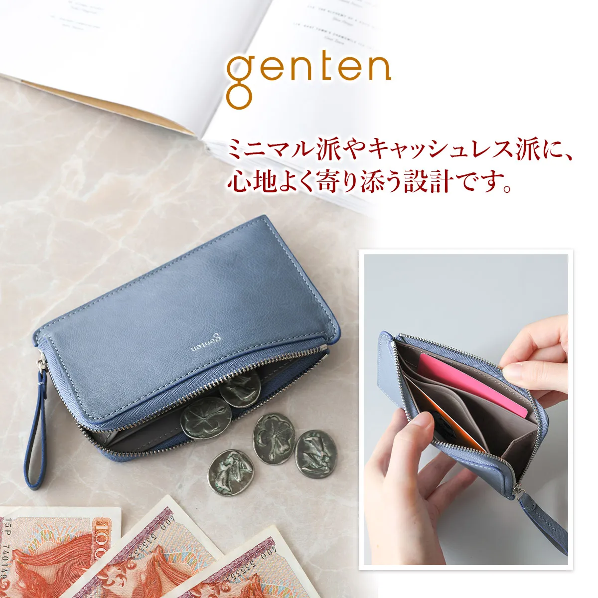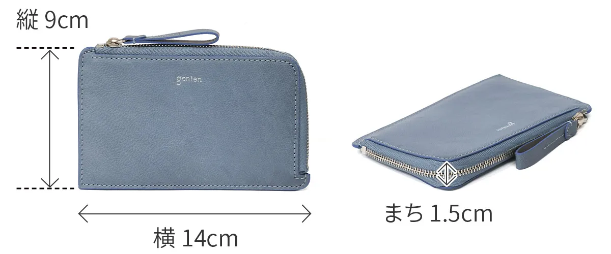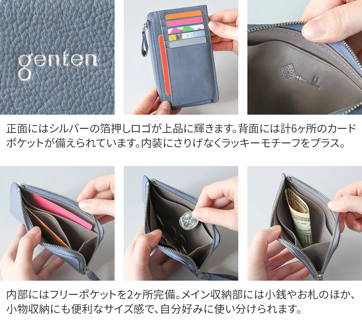 genten定番のフレスコの新色にラッキーモチーフをあしらったモルトフレスコ。内装には、カットワークをあしらった鍵のモチーフをさりげない位置に。鍵のモチーフには「家や財産を守る」「幸運の扉をひらく」「未来を切り開く」などのポジティブな意味が込められています。大人のカジュアルさと洗練さを両立できる色で、心を穏やかにしてくれます。 〈素材の特性・メリット〉 鞣しの種類:クロムフリー鞣し インドの肌理細やかな山羊革を使用。インドで繊維を縮めて染色をして仕上げてから、さらに日本で低温のアイロンをかけ、表面の地艶を出し上品に仕上げています。金属(クロム※)を含まない、鞣し剤によって鞣された革で、燃やした際にも環境に優しい鞣し方法です。鉱石を主体とした天然由来の成分で鞣しています。優れた分解性があり、好条件下では数カ月で生分解されます。銀面が強いため傷がつきにくく、水染みにも強く軽量なのも特徴。表面を微粒子顔料で仕上げているため、経年変化をあまりせずに、買った時の”色”を楽しめます。 スリムでかさばりにくく、ポケットにもすっきり収まるアイテムです。やぎ革特有の美しい銀面に、内装の滑らかなカーフレザーを合わせ、手に取るたび上質さを感じられる仕立てに。カードポケットを計8ヶ所備え、ミニマル派やキャッシュレス派にも嬉しい収納力です。