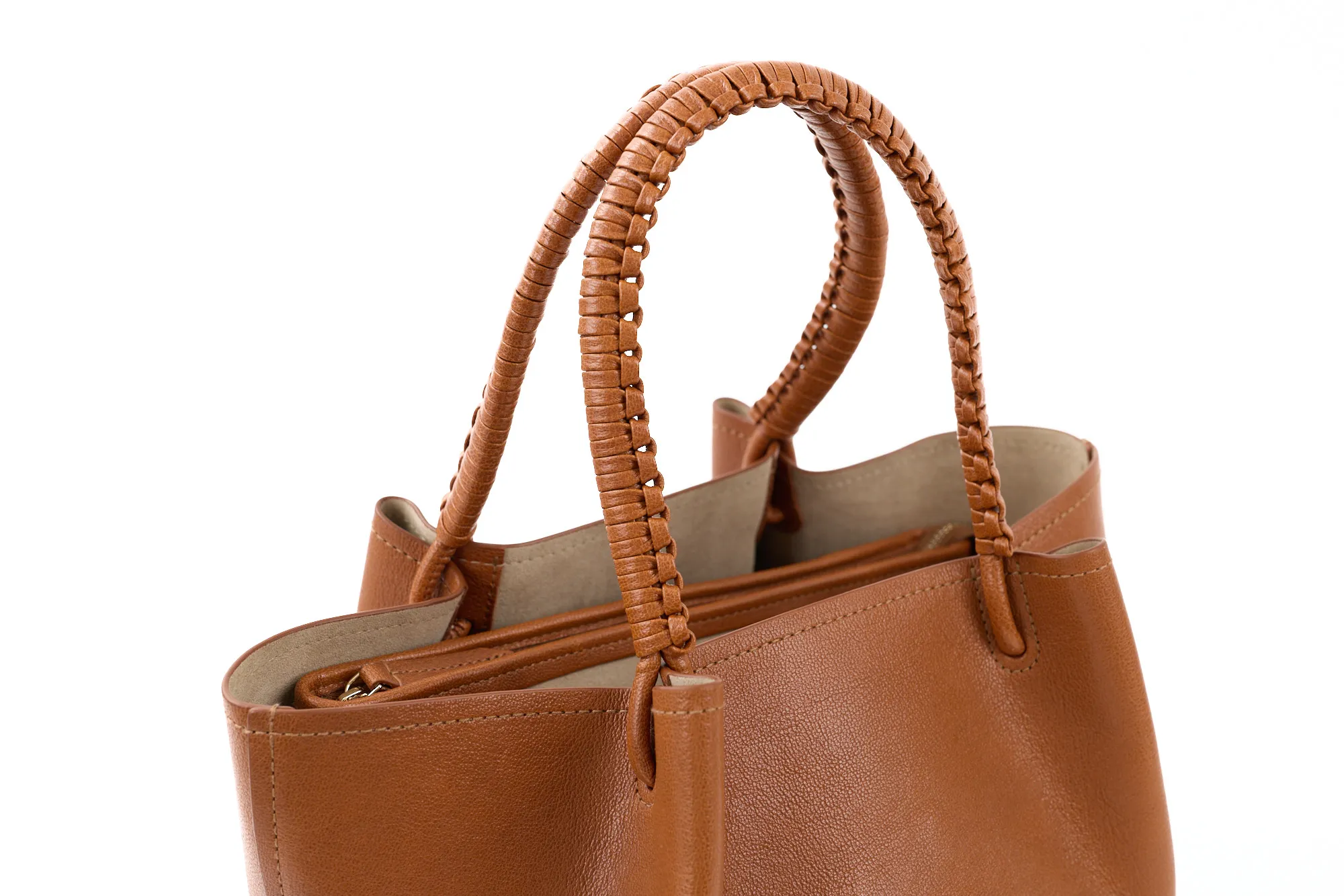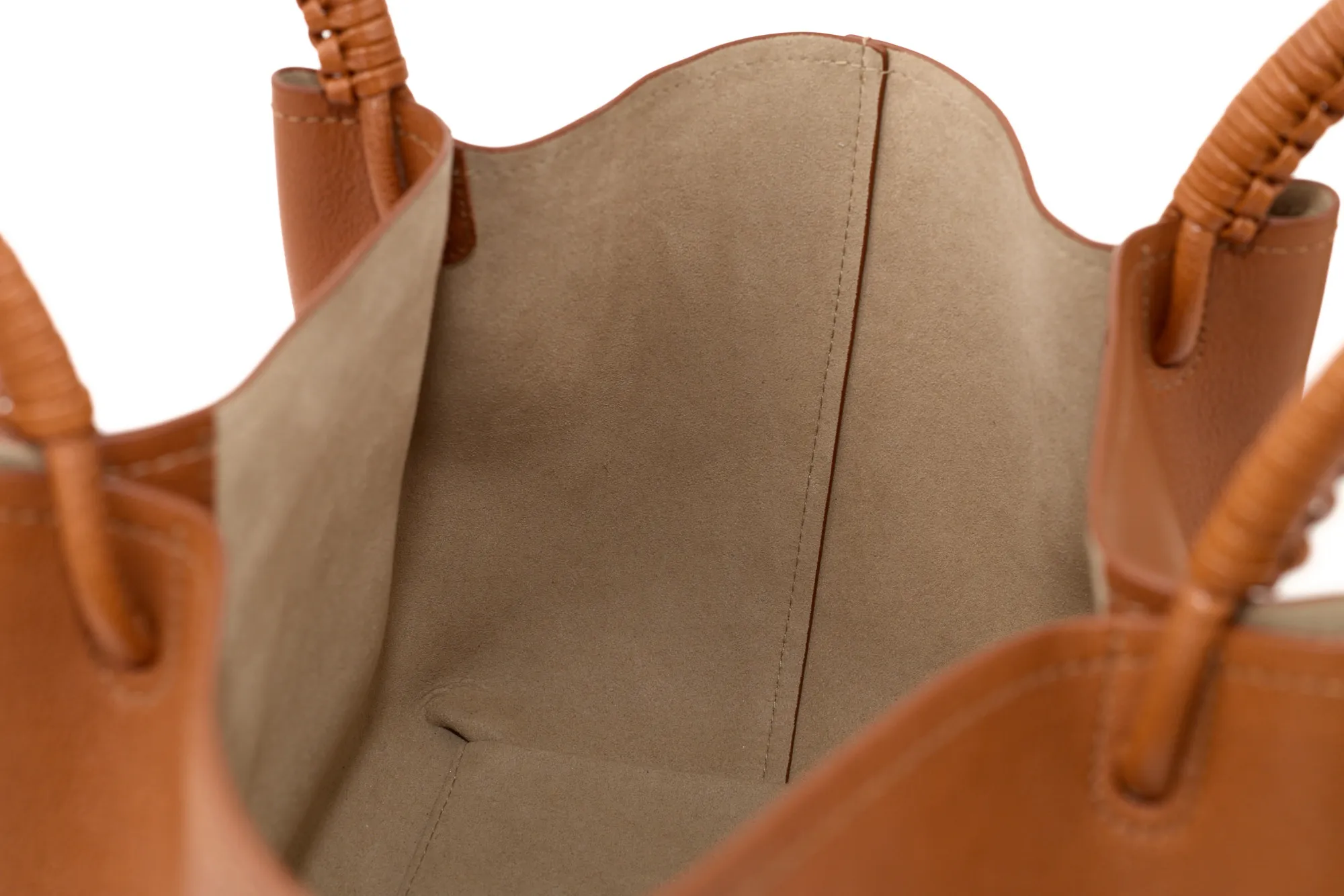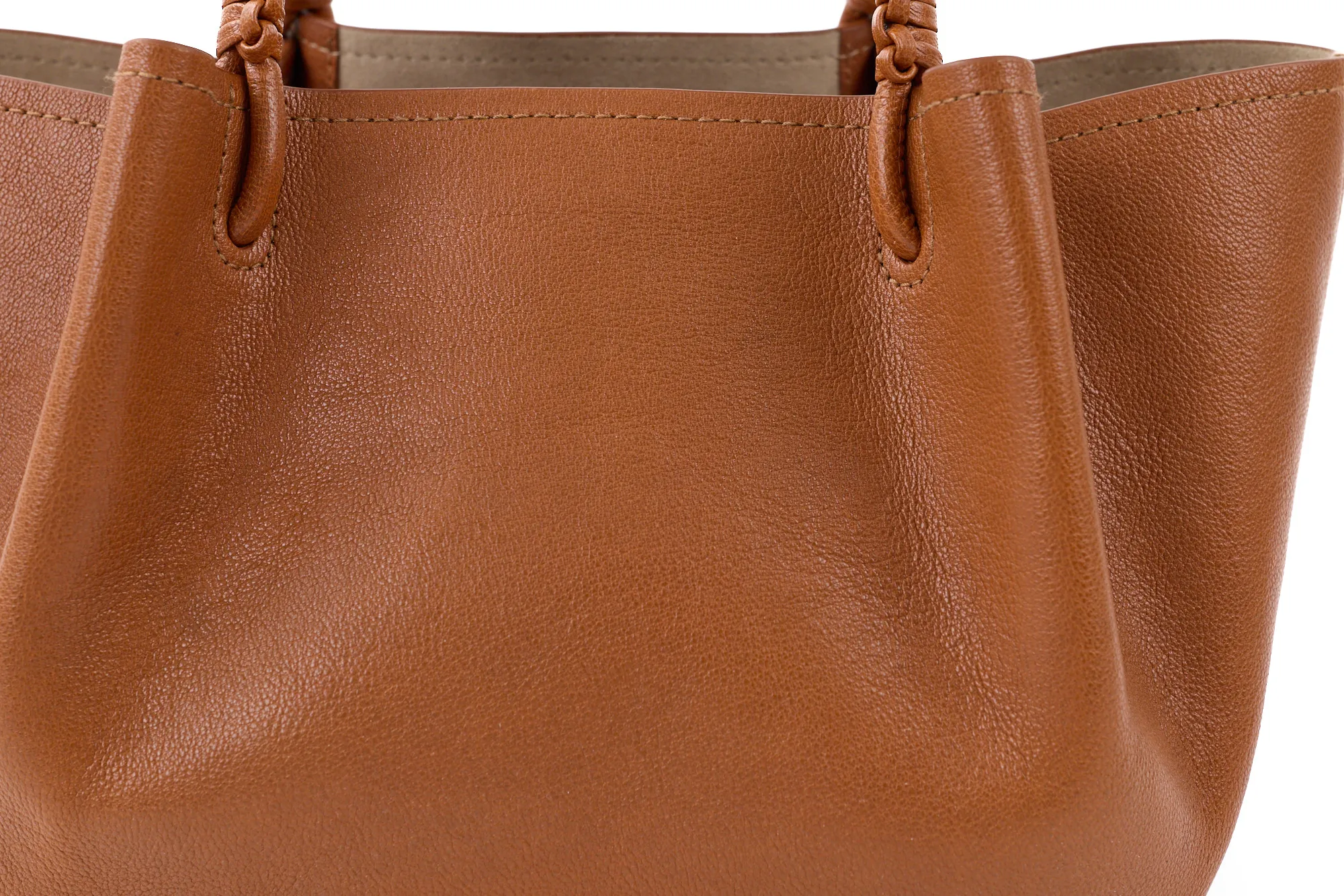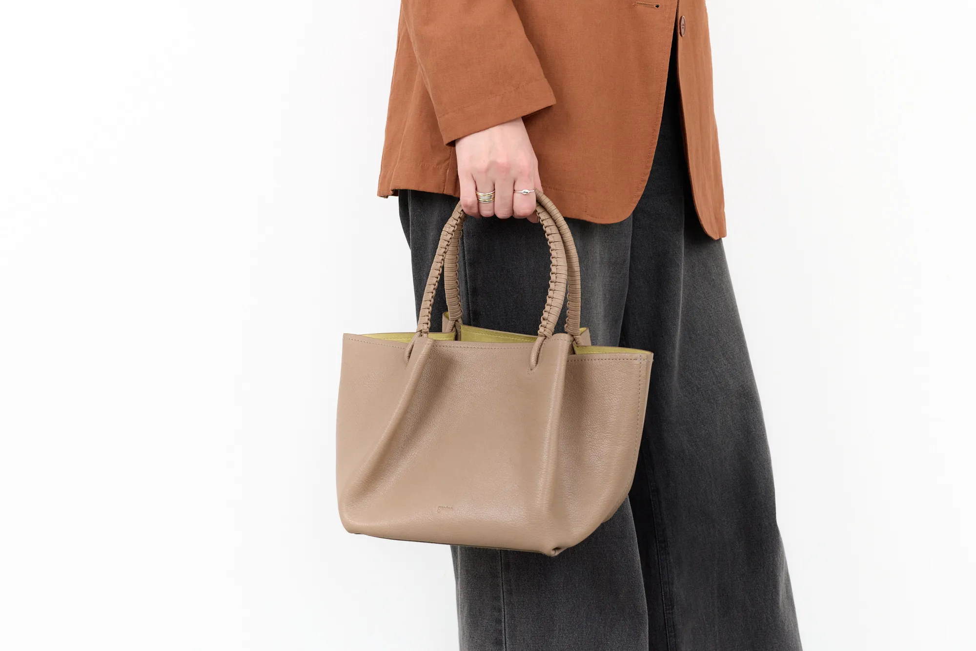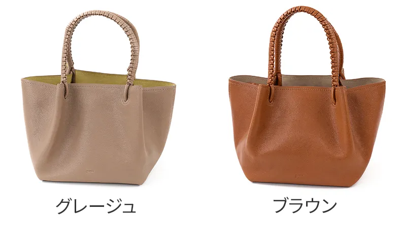 マクラメ編みのハンドルと、ドレープをまとった立体感のあるフォルムが魅力のバッグ。 開口部はオープン式で、荷物の出し入れがスムーズに行えます。 付属のインナーポーチ付きで貴重品も安心して収納でき、バッグを変える際にはポーチごと移せる便利さも魅力。 銀面のシボが美しいゴートレザーは傷が付きにくく、耐久性にも優れているためデイリーユースに最適です。