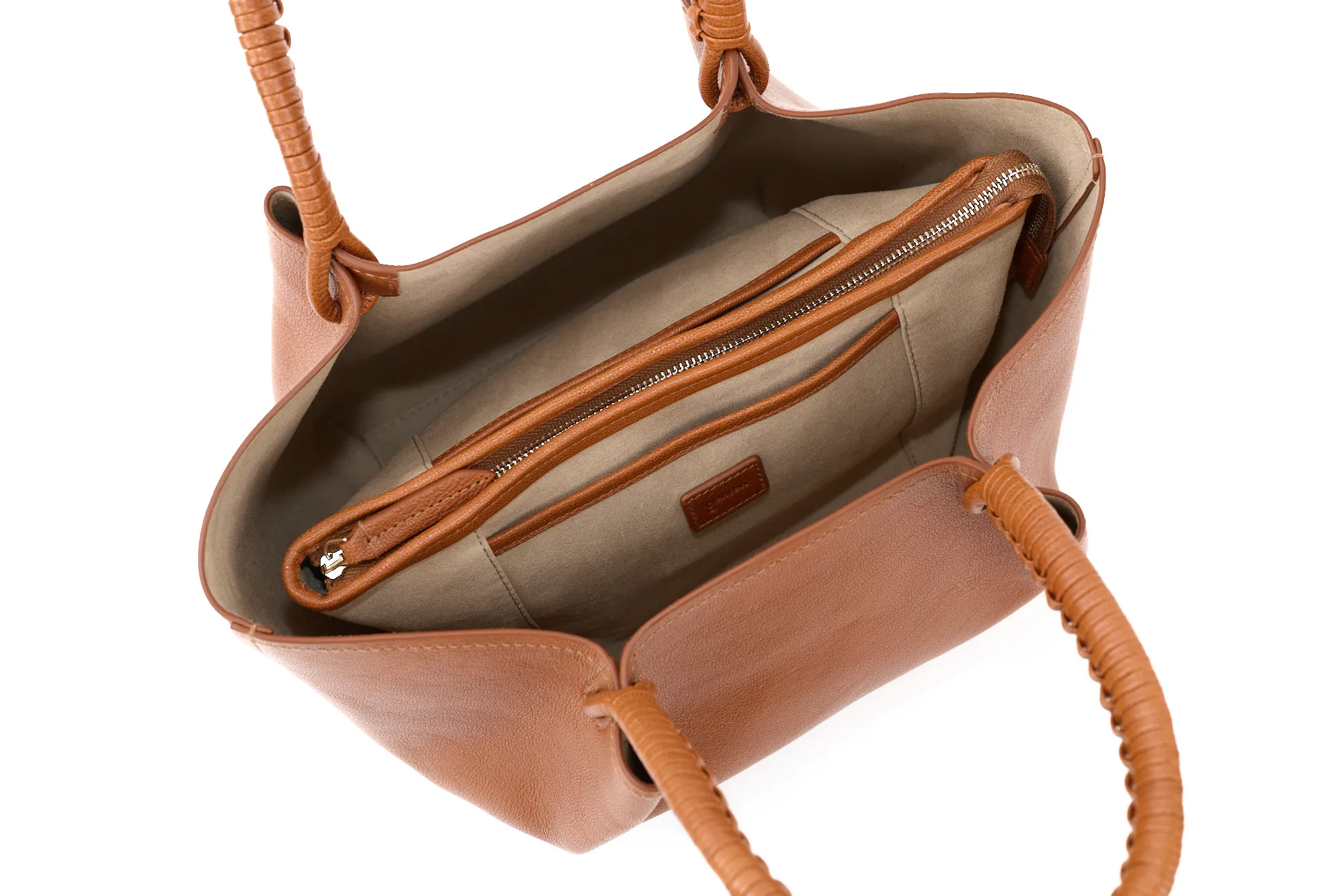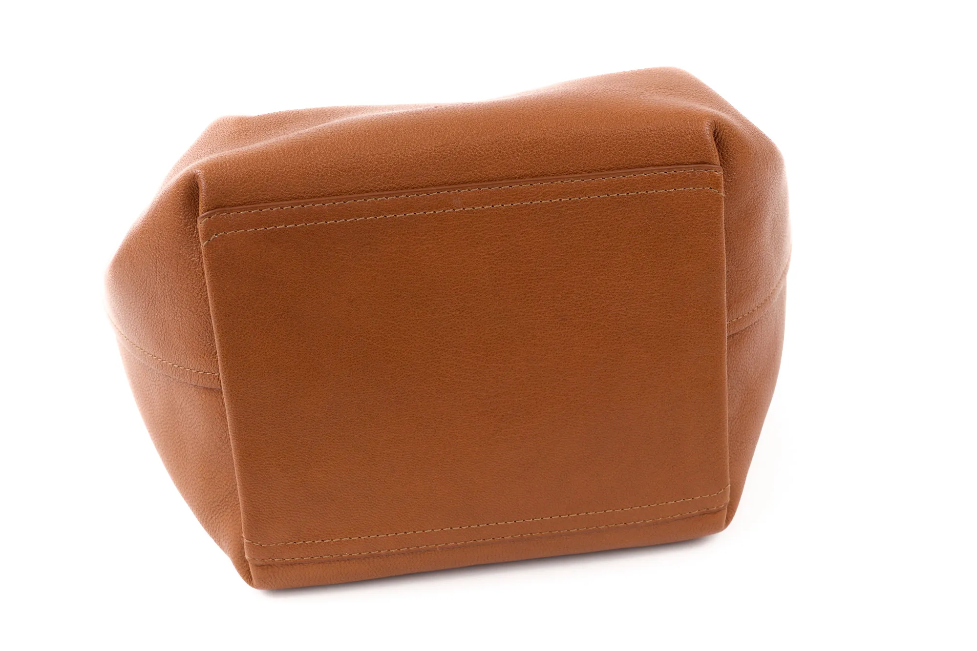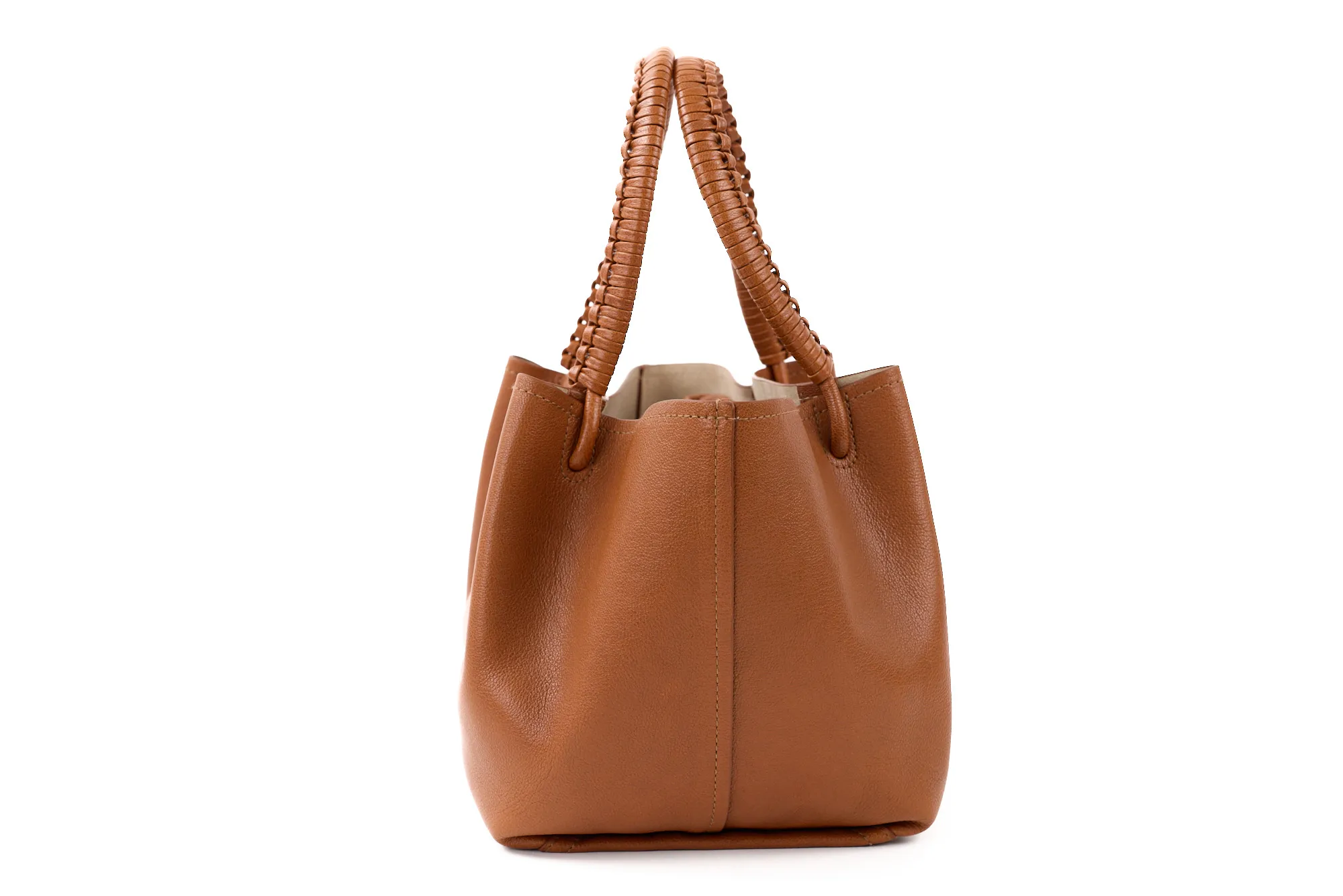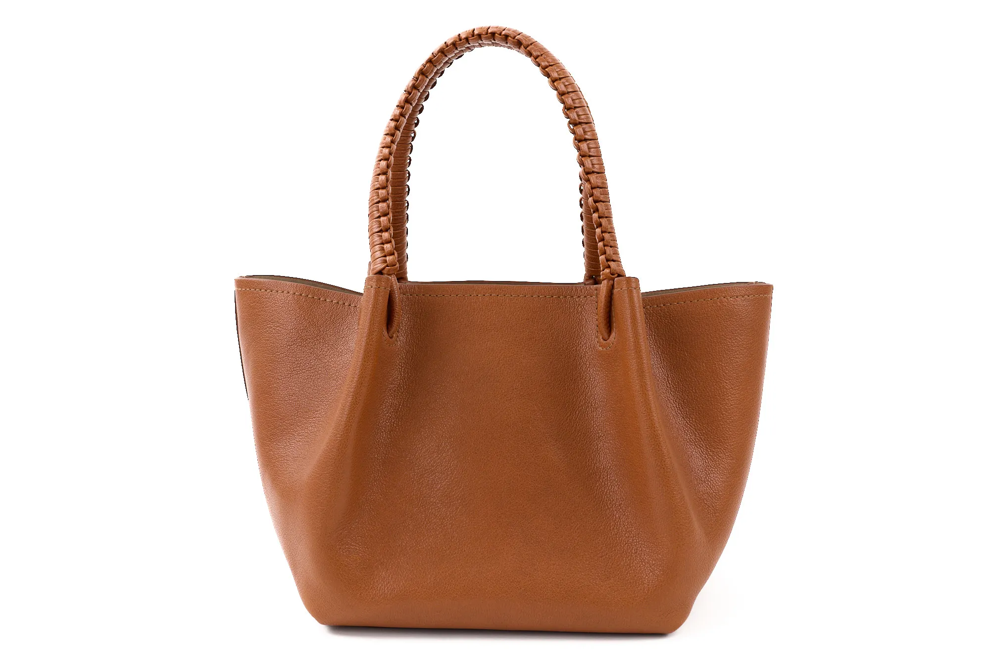 マクラメ編みのハンドルと、ドレープをまとった立体感のあるフォルムが魅力のバッグ。 開口部はオープン式で、荷物の出し入れがスムーズに行えます。 付属のインナーポーチ付きで貴重品も安心して収納でき、バッグを変える際にはポーチごと移せる便利さも魅力。 銀面のシボが美しいゴートレザーは傷が付きにくく、耐久性にも優れているためデイリーユースに最適です。