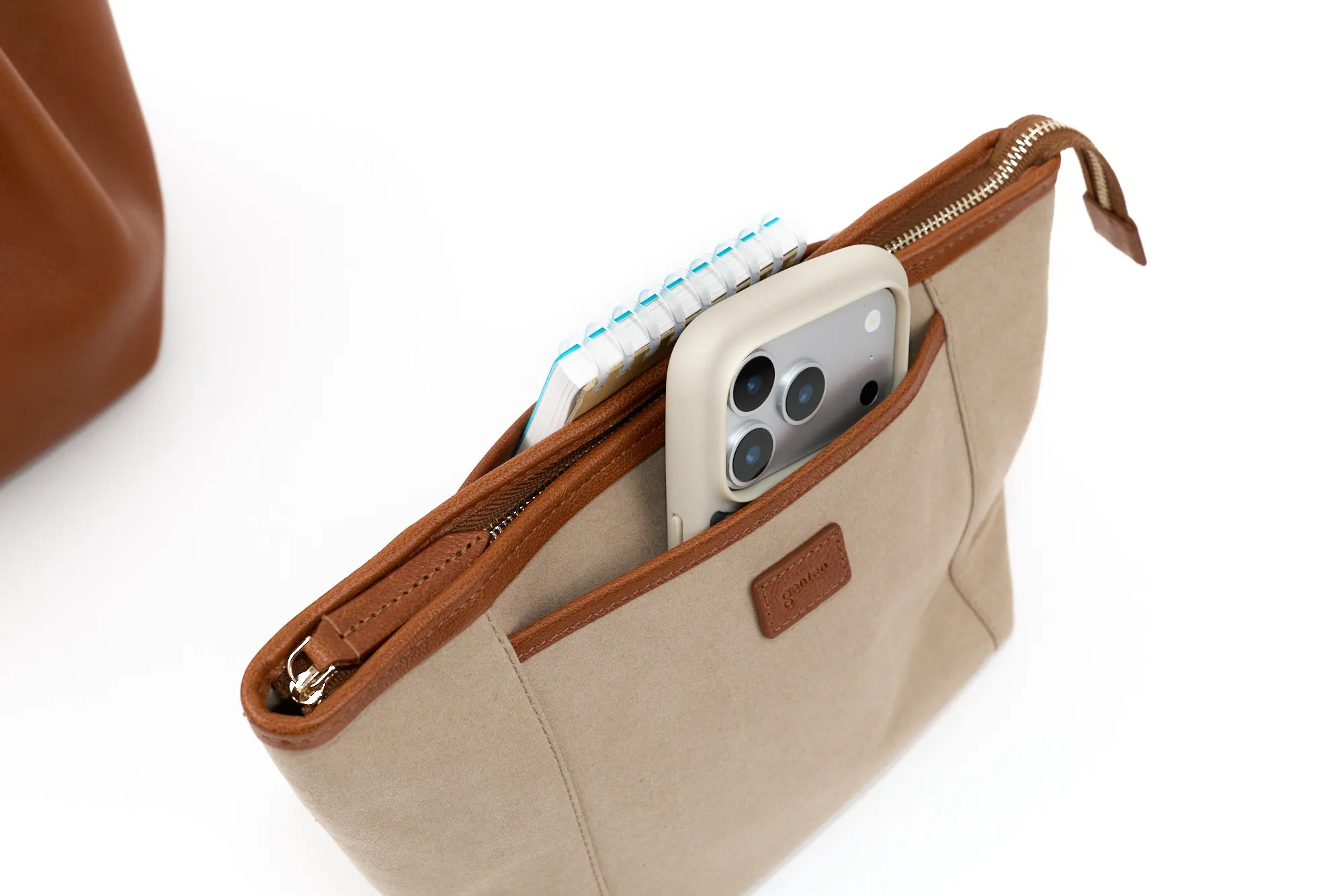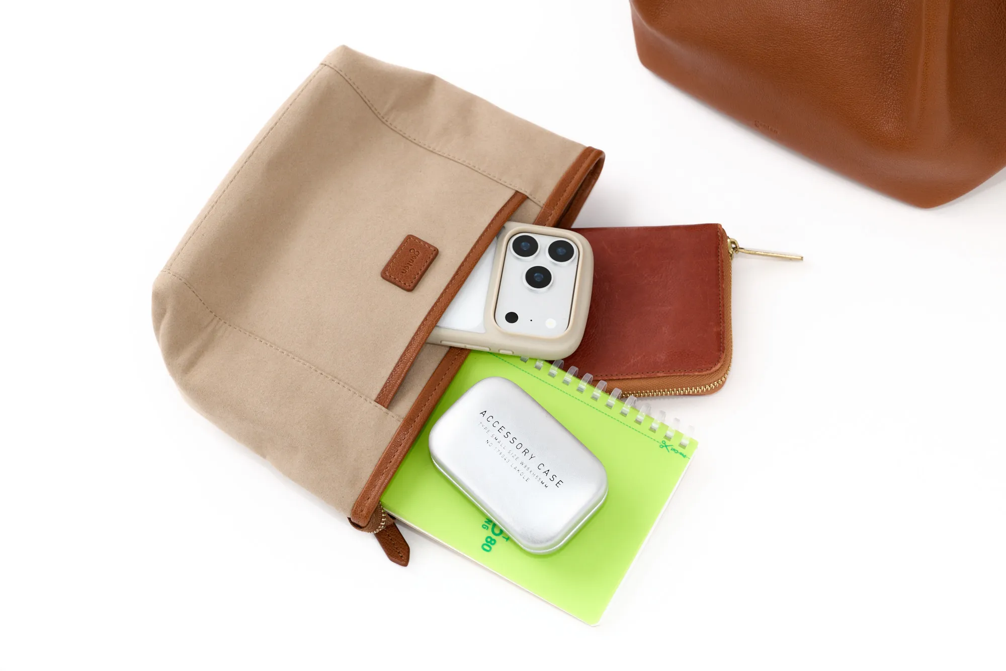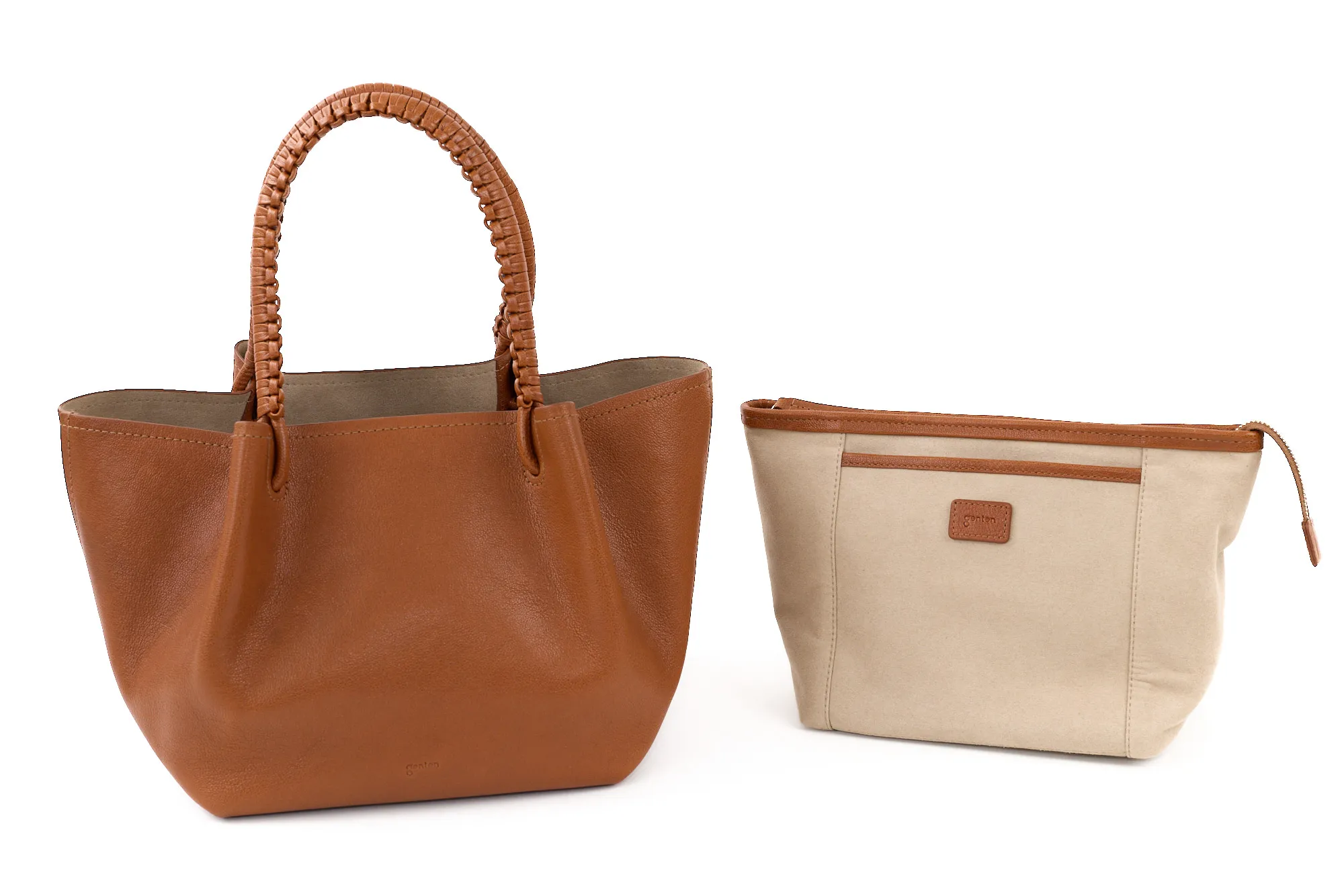 細かめの丸シボが美しい、透明感のある上品なゴードに、スウェード調の生地を貼り合わせた「ヴィーテ」。すっきりとした一枚仕立て仕様で、上品さと軽やかさを兼ね備えています。 卒業・入学シーズンの内輪の会食や学校行事から、カジュアルな装いまで、幅広く寄り添うミニマルデザイン。ハンドルの丁寧な編み仕事が、装いにさりげない華やかさを添えます。 裏地を貼り合わせ、切り目仕様で仕立てることで、張りのあるすっきりとした印象に。ハンドル付け根のつまみが生むドレープの立体感がきちんと感と柔和さを併せ持つ佇まいに。 インナーポーチ付きで中身を整理しやすく、バッグを変える際もポーチごと移せてスマート。ファスナー開閉なので、防犯性にも優れています。