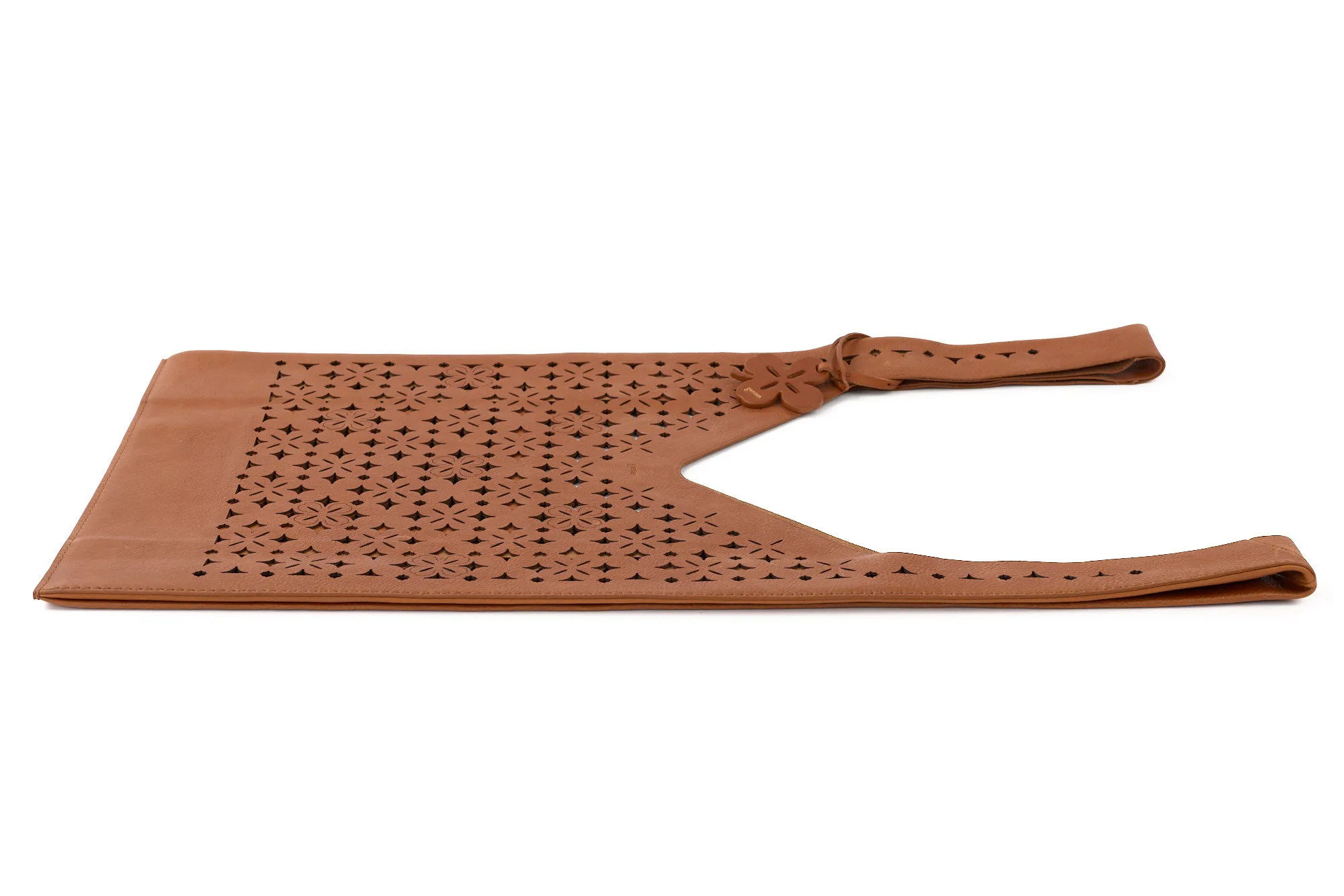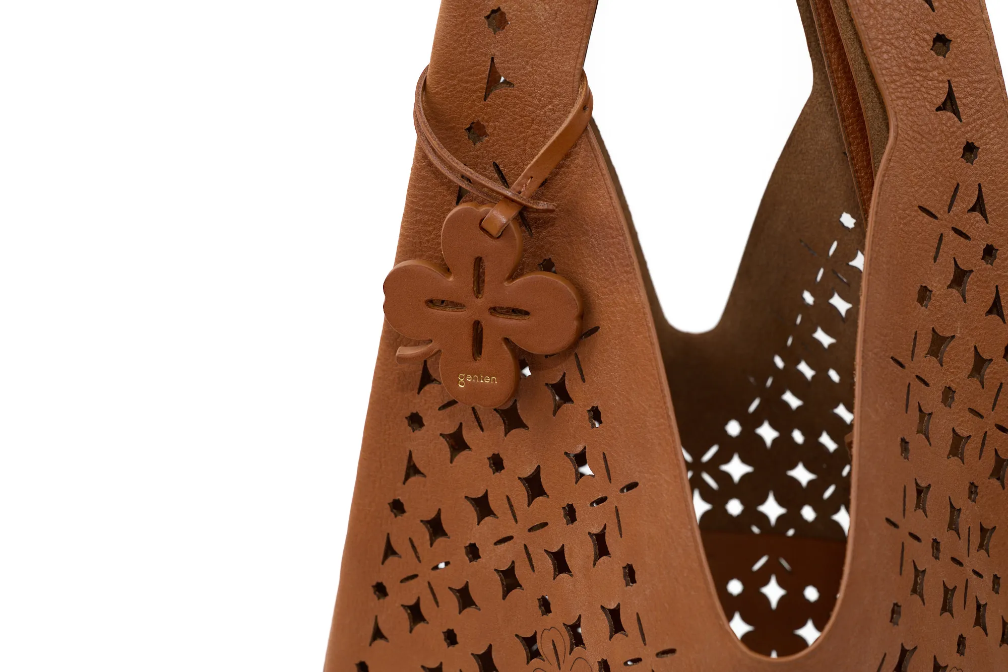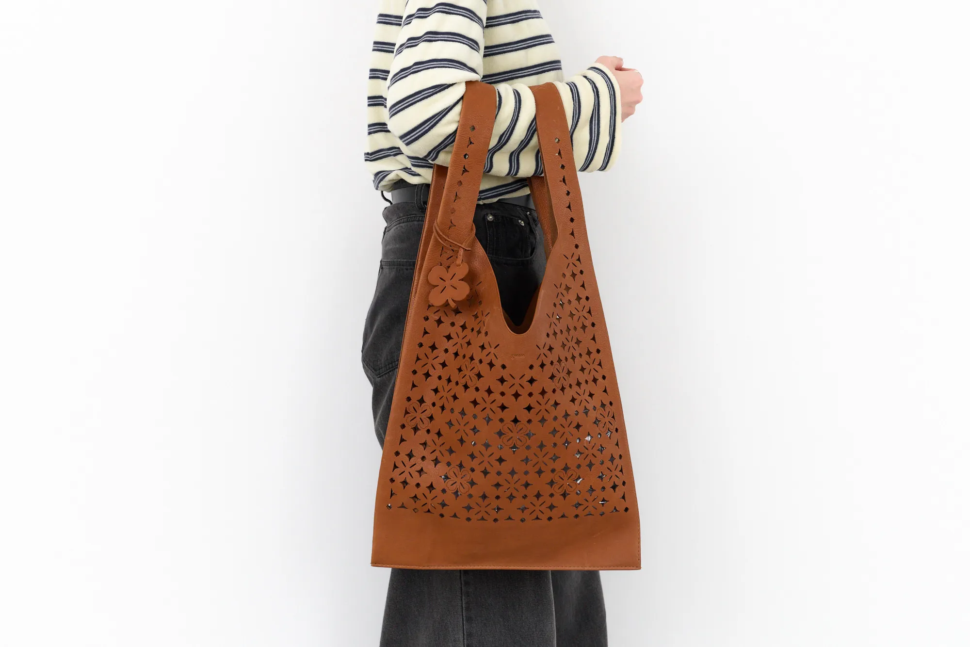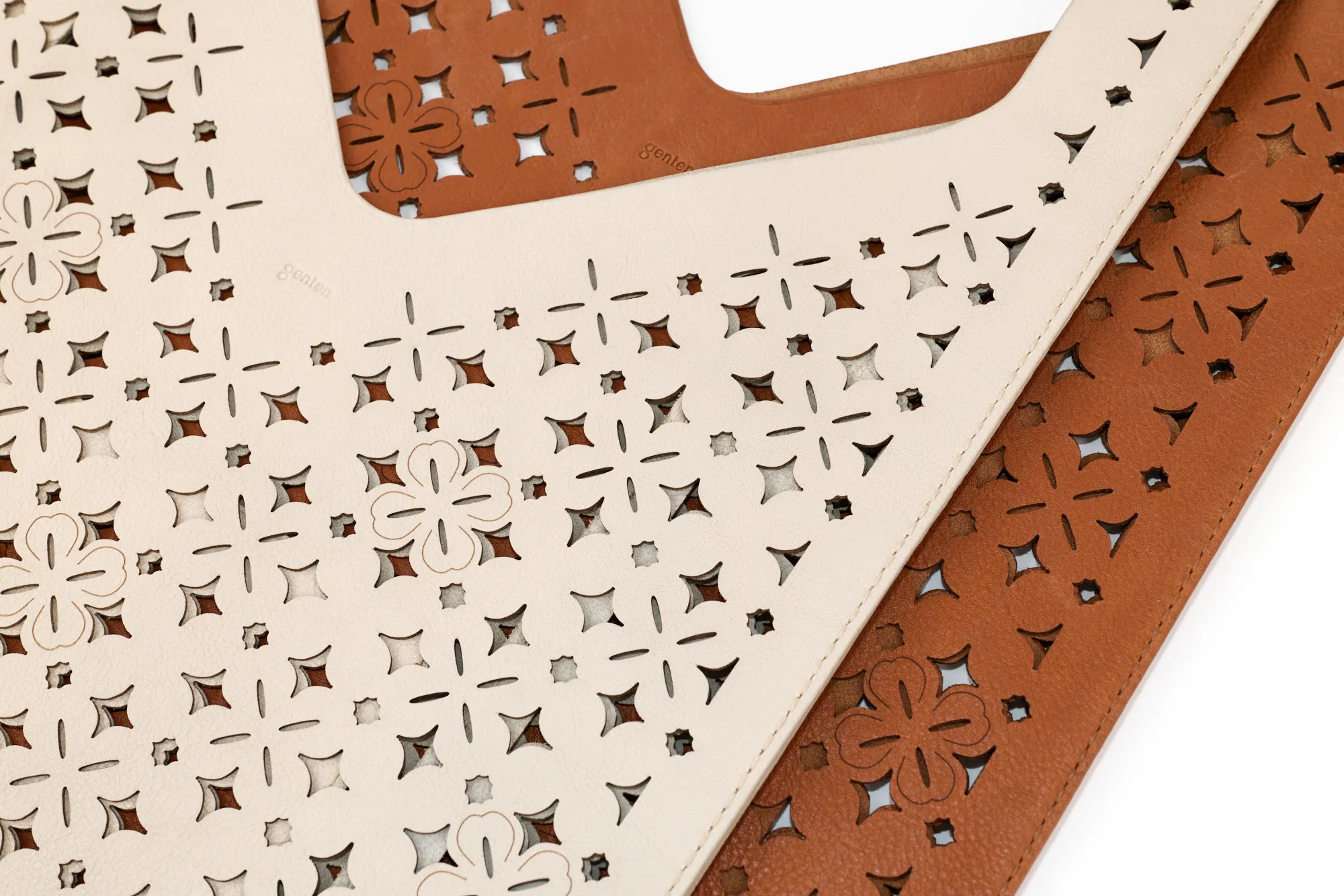 春らしく軽やかな印象でお持ちいただける、カットワークが美しい薄型レザートート。 幸運の象徴である四つ葉のクローバーをモチーフに、カットワークによる模様を施しました。 しなやかで柔らかなレザーは、ライニングを省いた軽やかな仕立て。持つ人の体に自然に寄り添い、透けるようなカットワークから差し込む光が、涼やかで爽やかな印象を演出します。 春から夏にかけての装いに、軽やかな抜け感を添えてくれる一品です。