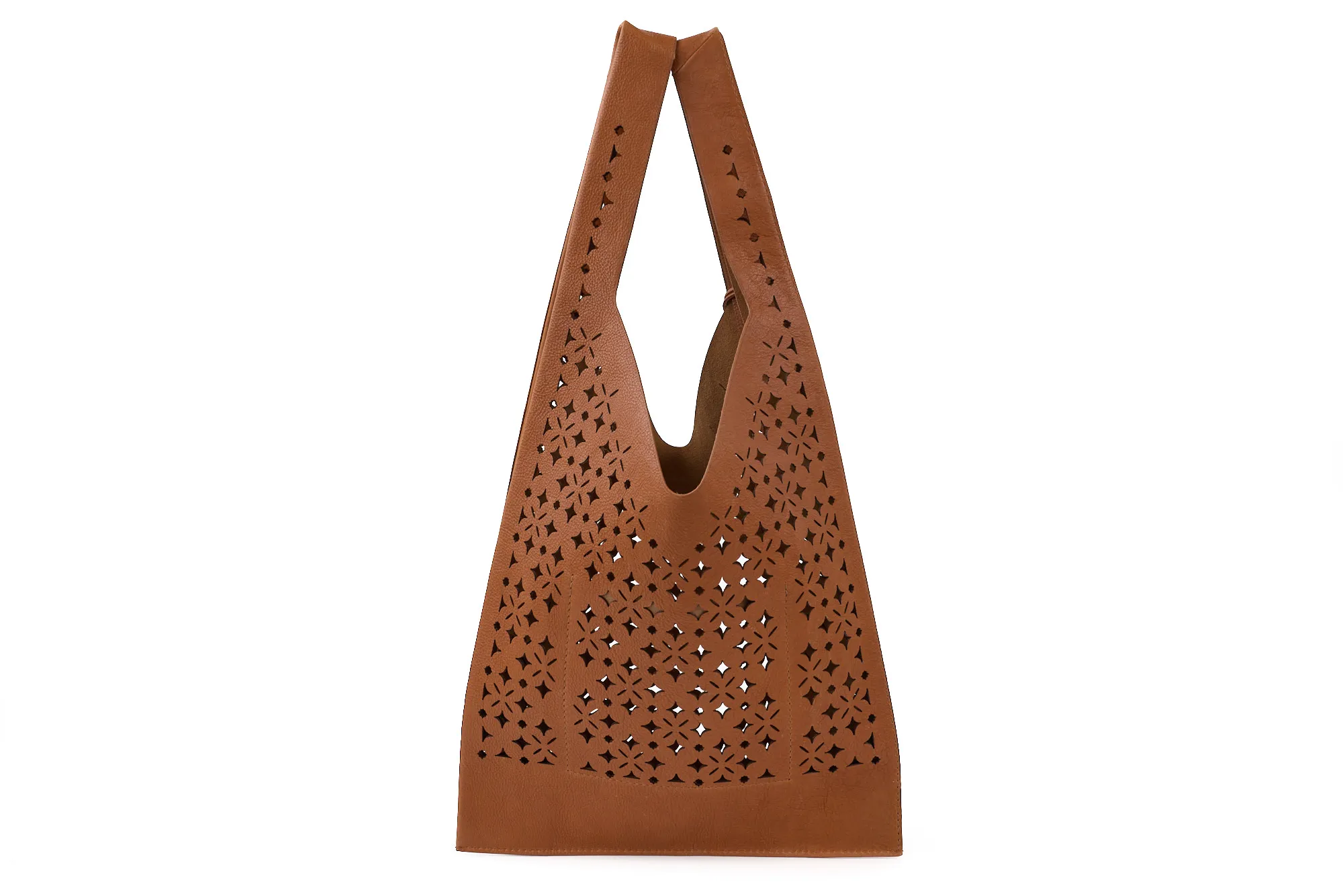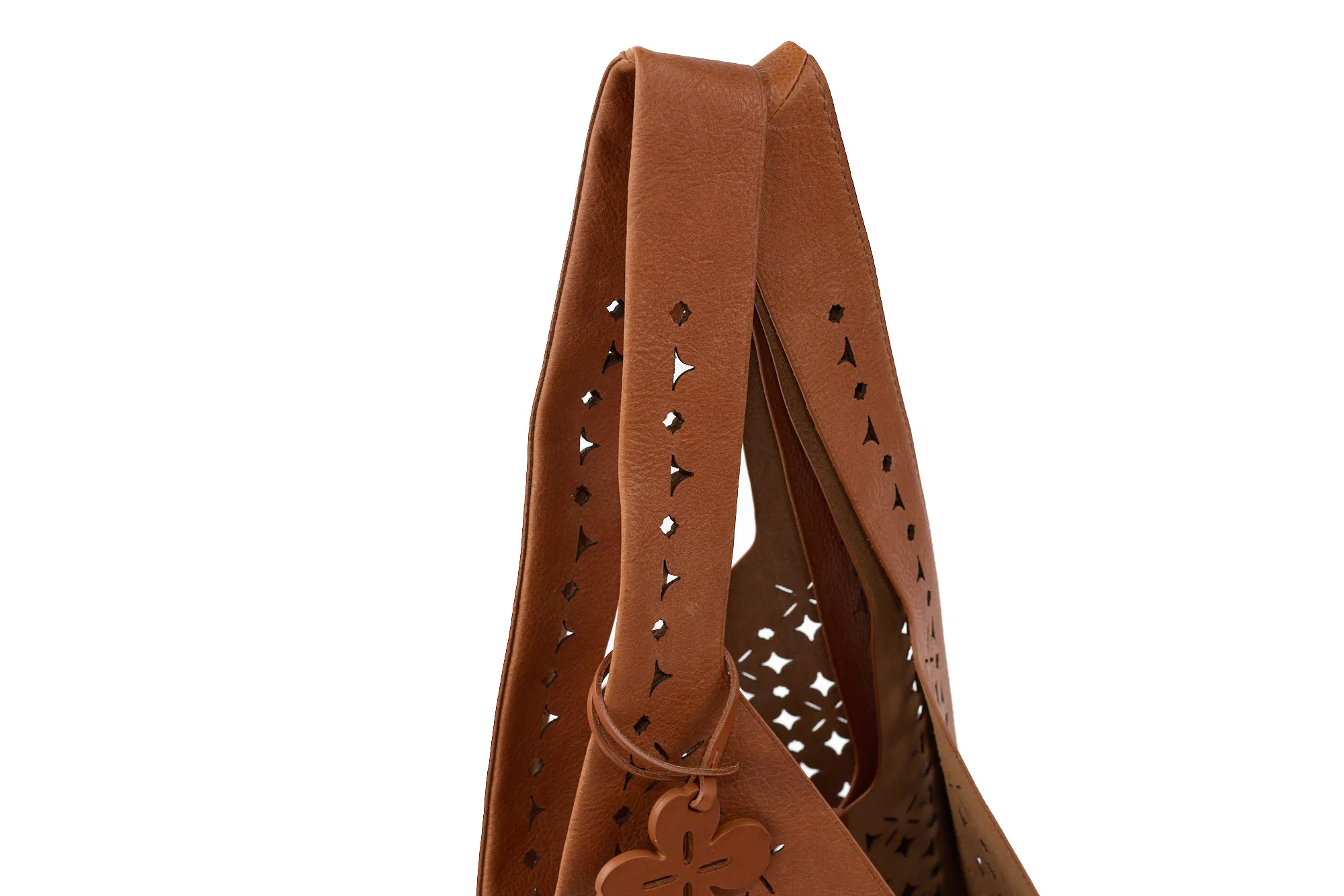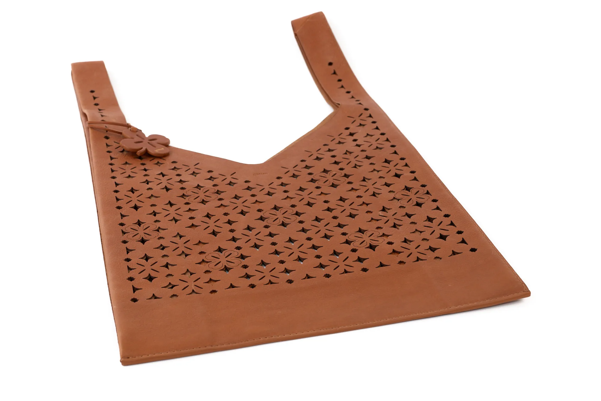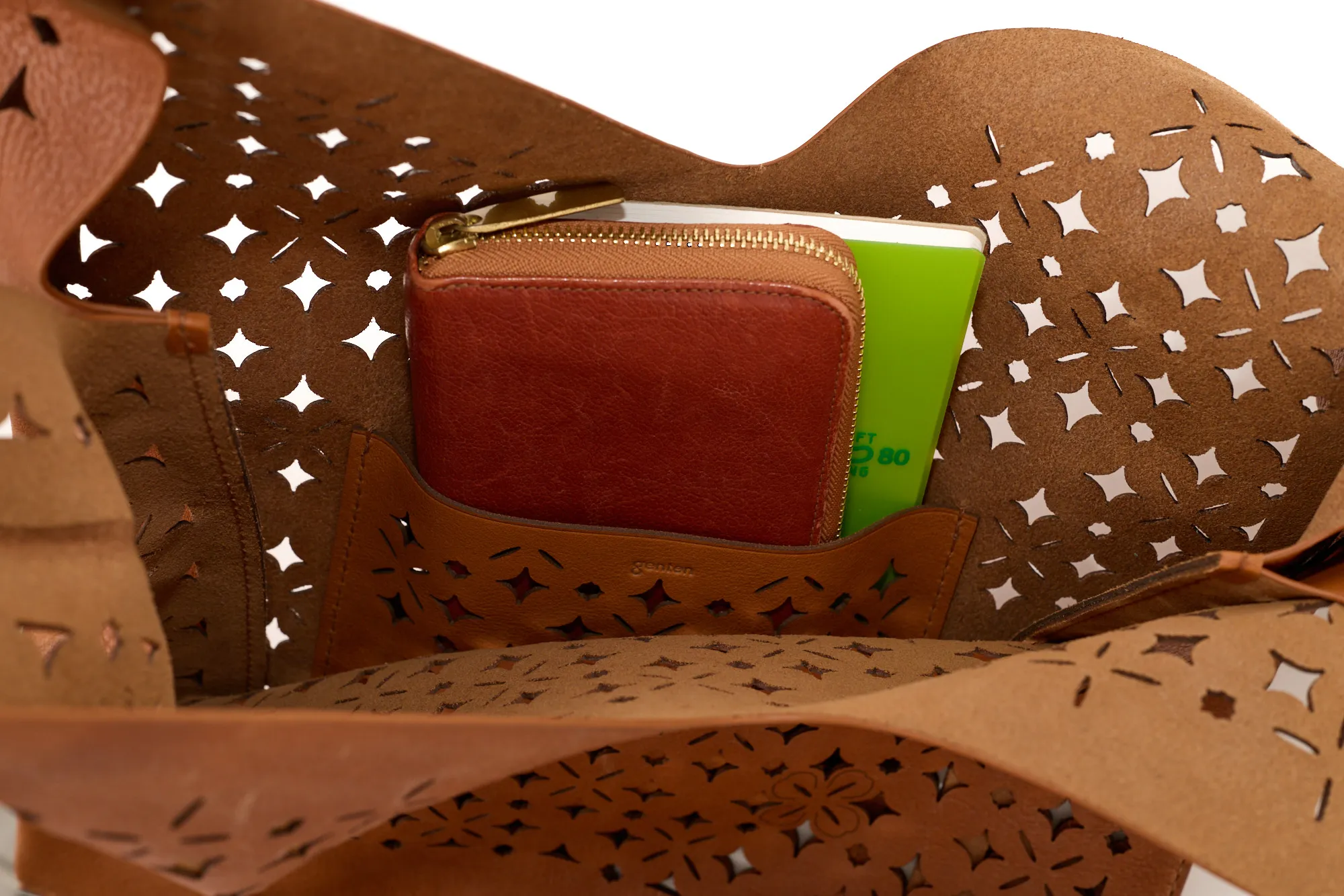 春らしく軽やかな印象でお持ちいただける、カットワークが美しい薄型レザートート。 幸運の象徴である四つ葉のクローバーをモチーフに、カットワークによる模様を施しました。 しなやかで柔らかなレザーは、ライニングを省いた軽やかな仕立て。持つ人の体に自然に寄り添い、透けるようなカットワークから差し込む光が、涼やかで爽やかな印象を演出します。 春から夏にかけての装いに、軽やかな抜け感を添えてくれる一品です。