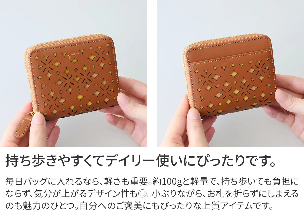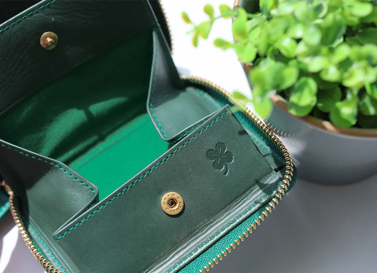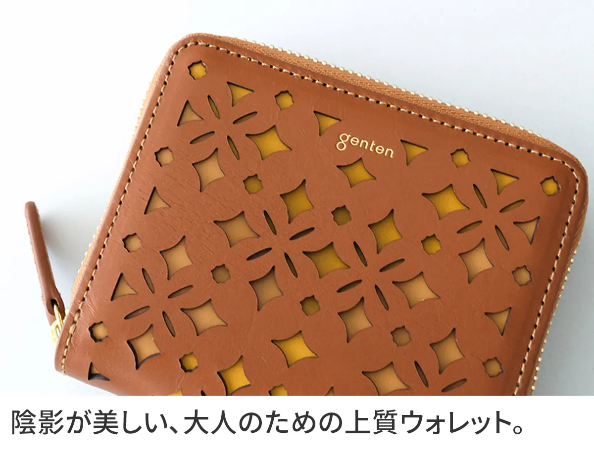 春らしい四つ葉のクローバーをモチーフにしたカットワークによる小物シリーズ。 発色の良い革を使用し、グラフィカルに浮かび上がるパターンが手元に輝きを添えてくれます。 そのモチーフをあえて反転させることで、見る人に静かな驚きと洗練された遊び心を届けます。 内装にはさりげなくクローバーの焼き印が施されています。日常にささやかな幸運を。 〈素材の特性・メリット〉 鞣し加工:タンニンなめし 色の経年変化は緩やかです。使う毎に手にしっとりと馴染むようになり、艶が現れてきます。 四つ葉のクローバー型にカットワークされた幸運モチーフが、持つたびに気分を上げてくれるデザインです。繊細な抜き加工が革の質感を引き立て、手元にさりげない華やかさを添えてくれます。新しく開発されたゲンテンのミニ財布は、ラウンド式で膨らみにくい設計が特徴。大きく開いてカードが取り出しやすく、お札は折っても折らなくても収納できるのが嬉しいポイントです。見た目の可愛らしさと使いやすさを両立した、頼れるミニ財布に仕上がっています。