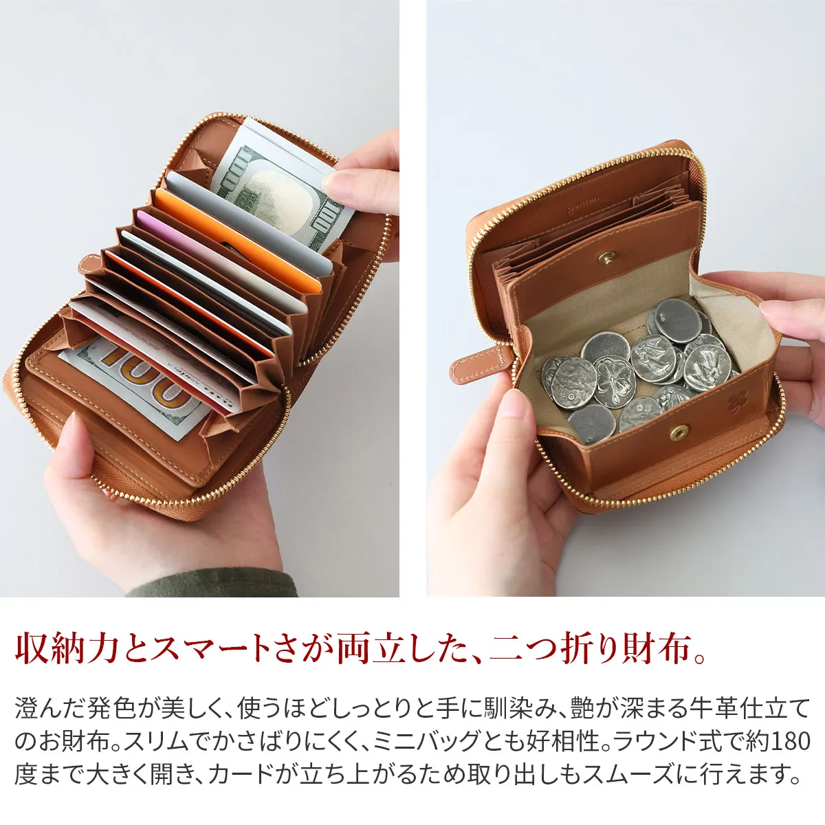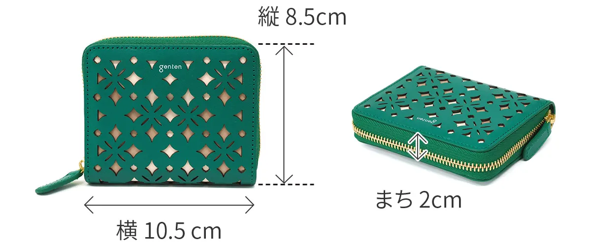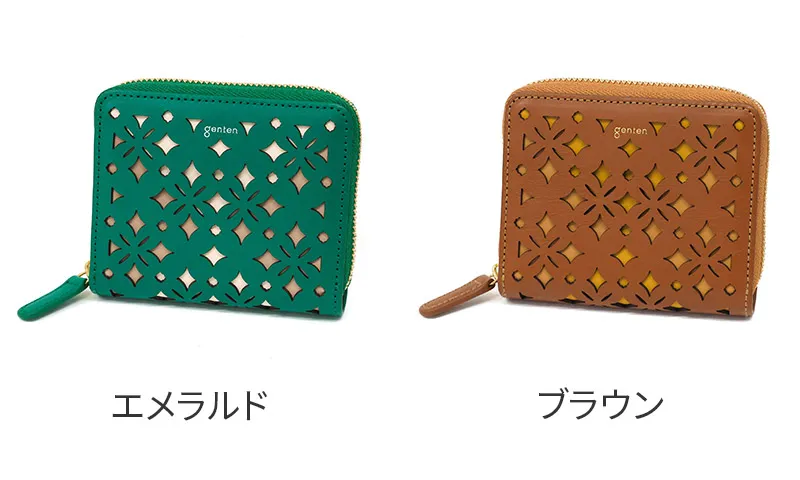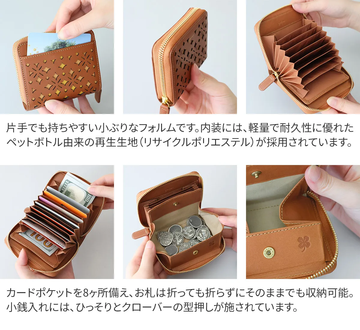 春らしい四つ葉のクローバーをモチーフにしたカットワークによる小物シリーズ。 発色の良い革を使用し、グラフィカルに浮かび上がるパターンが手元に輝きを添えてくれます。 そのモチーフをあえて反転させることで、見る人に静かな驚きと洗練された遊び心を届けます。 内装にはさりげなくクローバーの焼き印が施されています。日常にささやかな幸運を。 〈素材の特性・メリット〉 鞣し加工:タンニンなめし 色の経年変化は緩やかです。使う毎に手にしっとりと馴染むようになり、艶が現れてきます。 四つ葉のクローバー型にカットワークされた幸運モチーフが、持つたびに気分を上げてくれるデザインです。繊細な抜き加工が革の質感を引き立て、手元にさりげない華やかさを添えてくれます。新しく開発されたゲンテンのミニ財布は、ラウンド式で膨らみにくい設計が特徴。大きく開いてカードが取り出しやすく、お札は折っても折らなくても収納できるのが嬉しいポイントです。見た目の可愛らしさと使いやすさを両立した、頼れるミニ財布に仕上がっています。