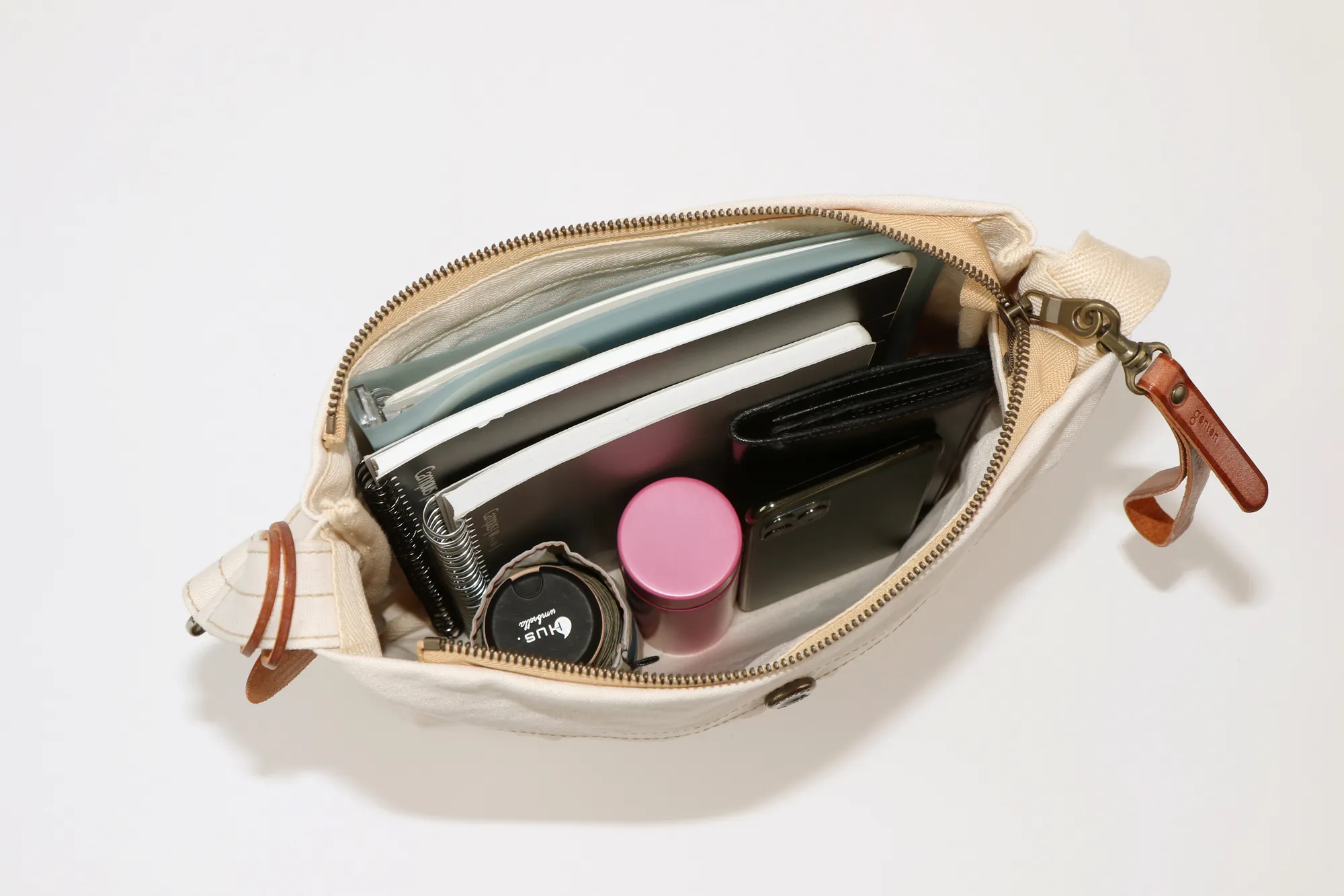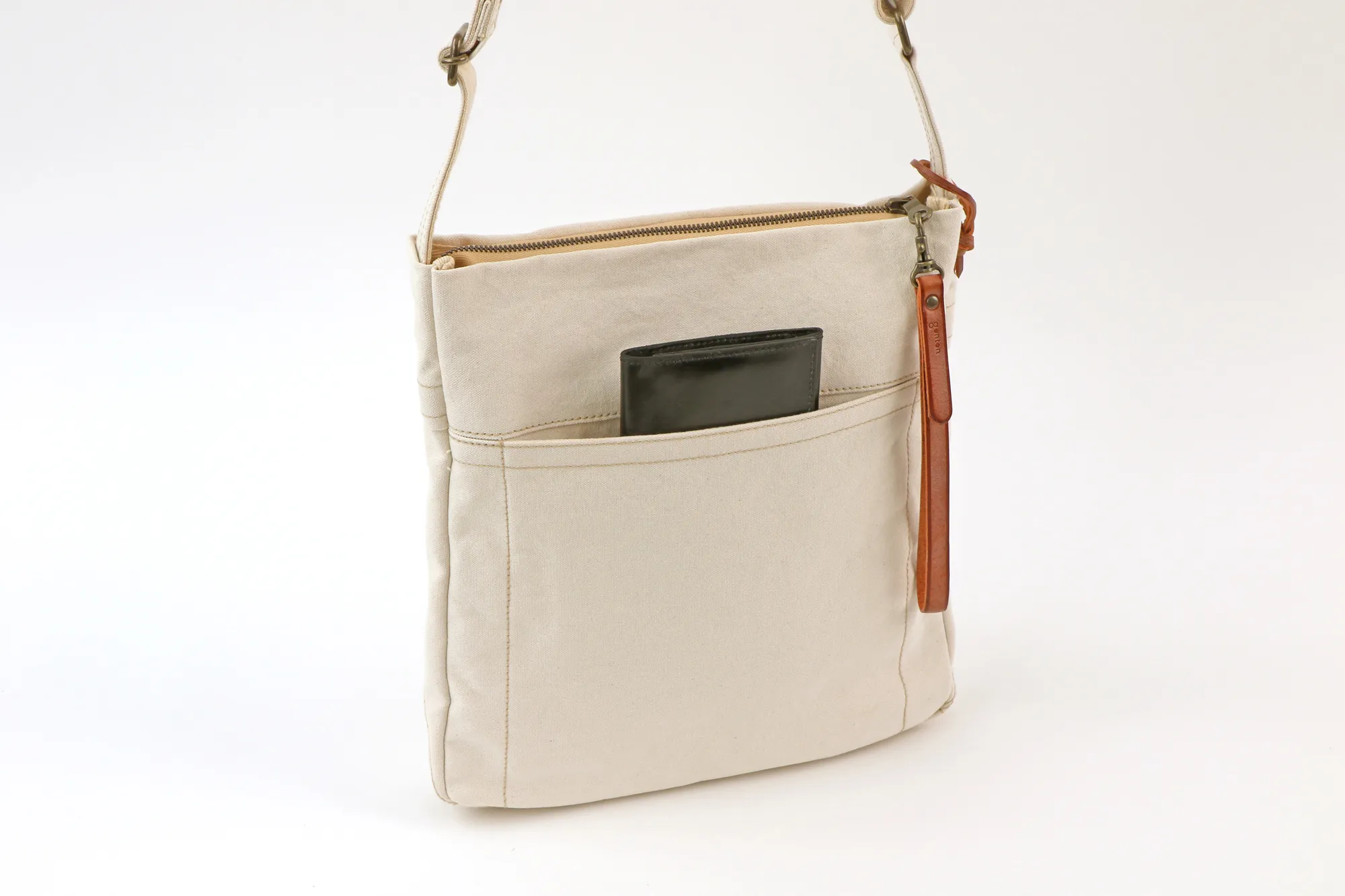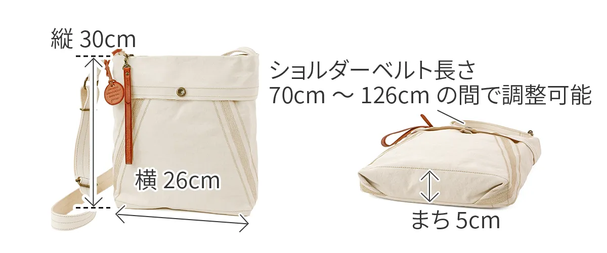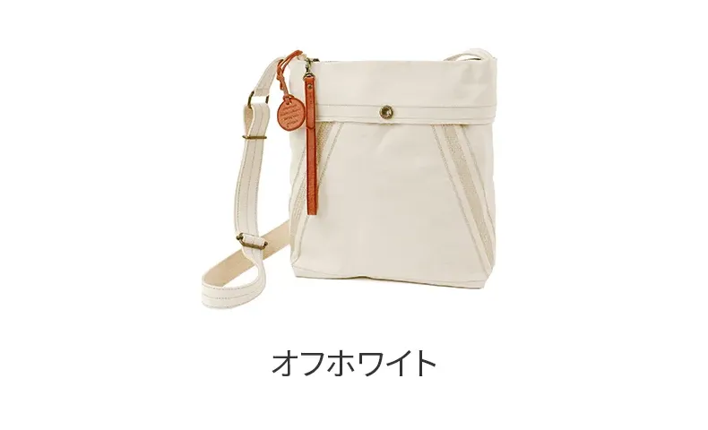 薄く適度な張りの高密度キャンバスを用い、一重仕立てで仕上げた、ショルダーバッグシリーズ。ビンテージミリタリーのヘルメットバッグ由来の前胴ポケットと、ミモザステッチがアクセント。 開閉しやすさを考慮した長めな革引手とチャームは着脱可能。汚れたら手洗いできます。経年変化を存分に楽しめる薄口タンニン染めの生地を採用。 どのモデルの胴面も、一枚の布地を畳んでマチ幅を確保し、角張りが出ずらい構造を提案。骨張りが少なくなり、身体に優しい使い心地になるようにしました。 印象的な前胴のミモザステッチは、装いのアクセントとしてアクティブなイメージを与えるとともに、ボディをコンパクトに見せてくれる視覚的効果も同時に得られます。 内装釣りポケットはいずれもスマホや手帳が縦に収まる寸法を確保。軽さに重点をおいた仕様です。 〈素材の特性・メリット〉 打ち込み良い岡山県倉敷児島の伝統的11号シャトルパラフィンハンプを採用。ありのままの無染色の綿糸の色=生成りのキャンバスを使いました。 縦、横に500mlペットボトルや三段傘が余裕で入るB5ショルダー。薄マチながらも普段の街歩き~旅先持ちには充分な容量。そして、圧倒的な軽さが最大の魅力。